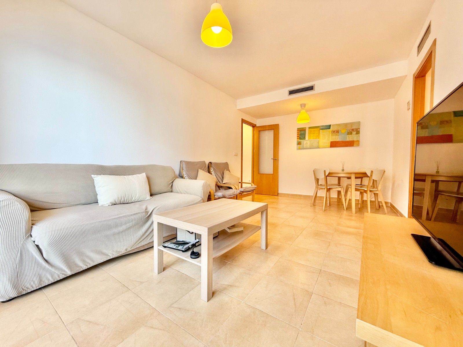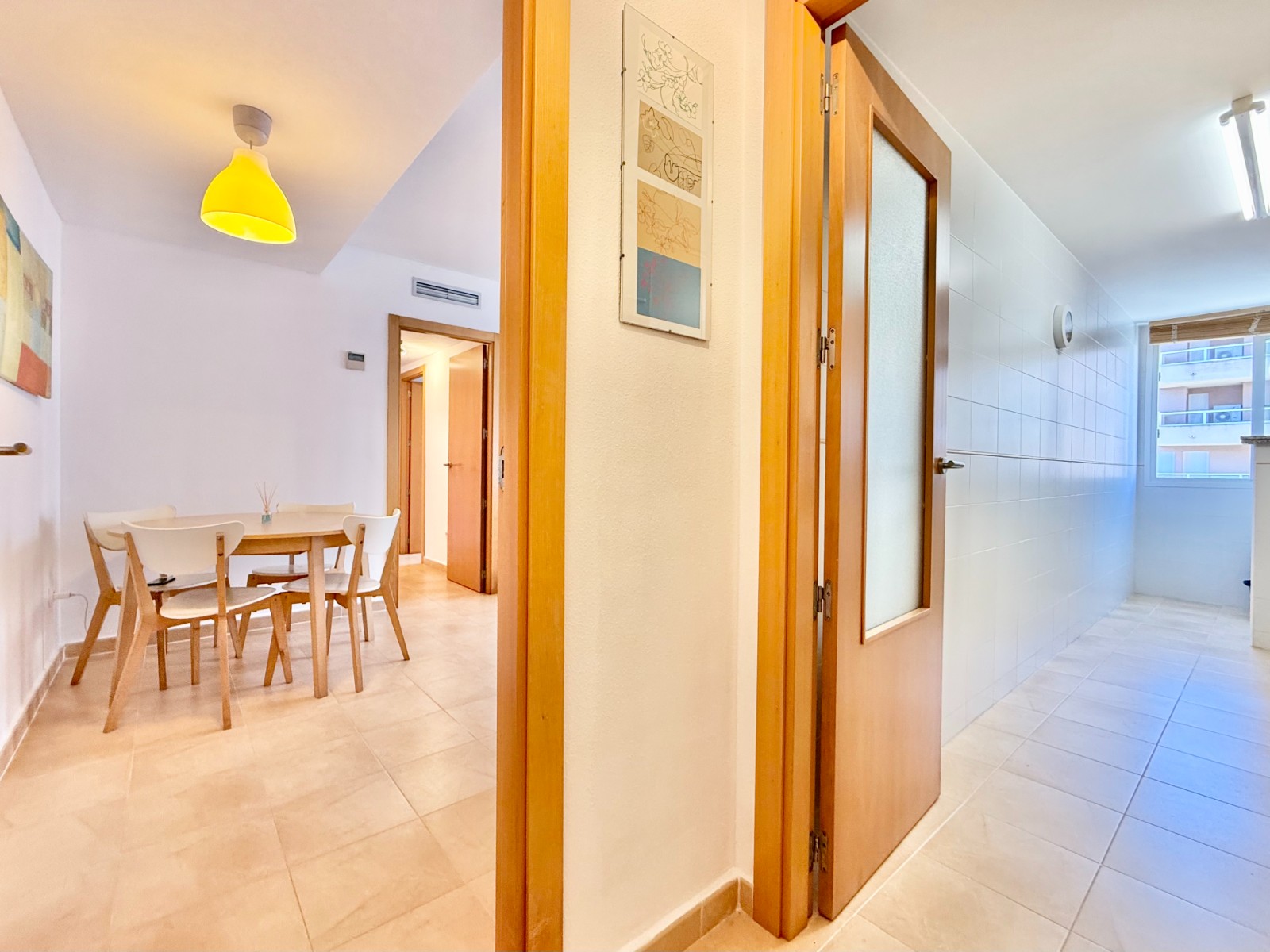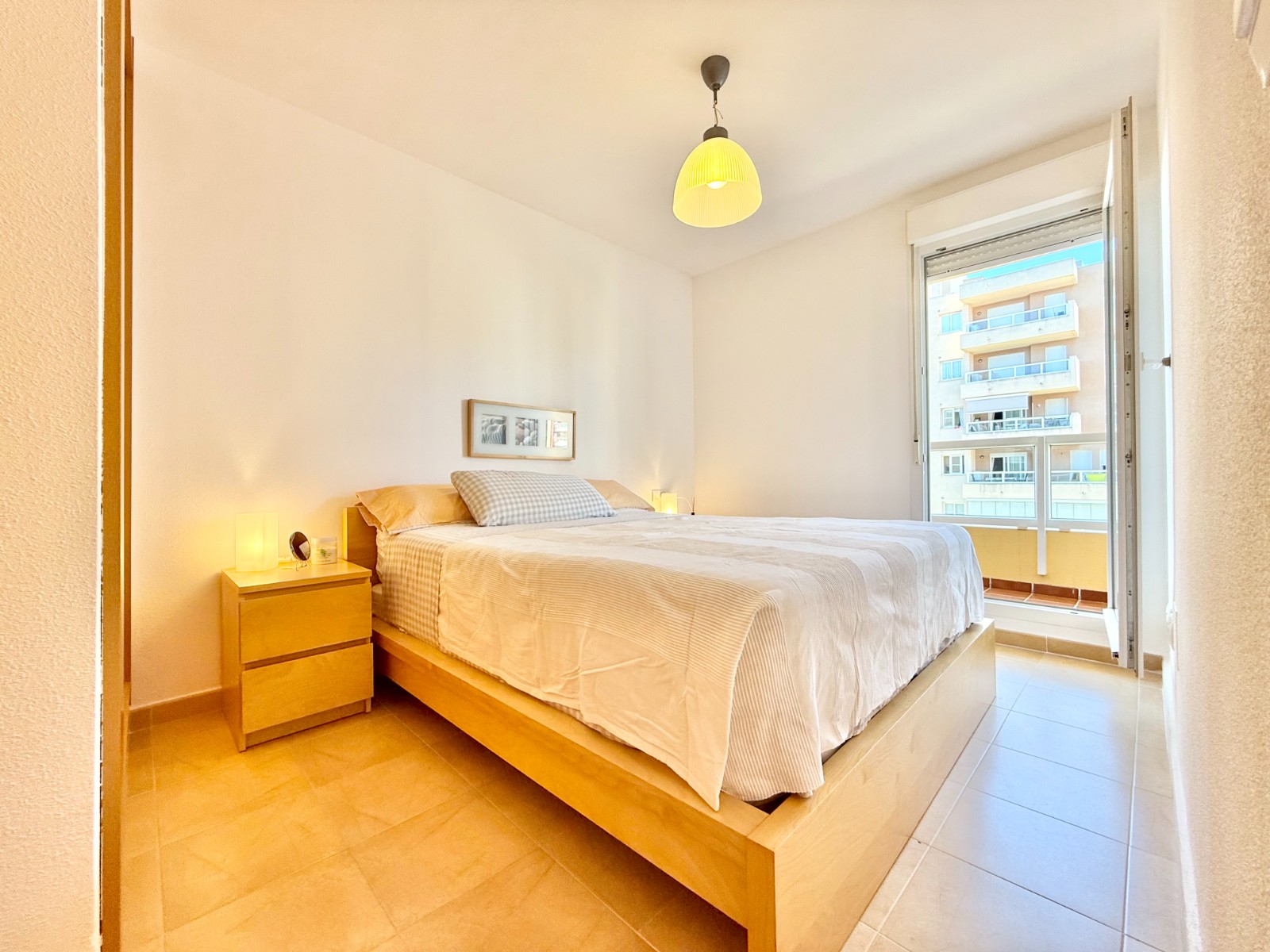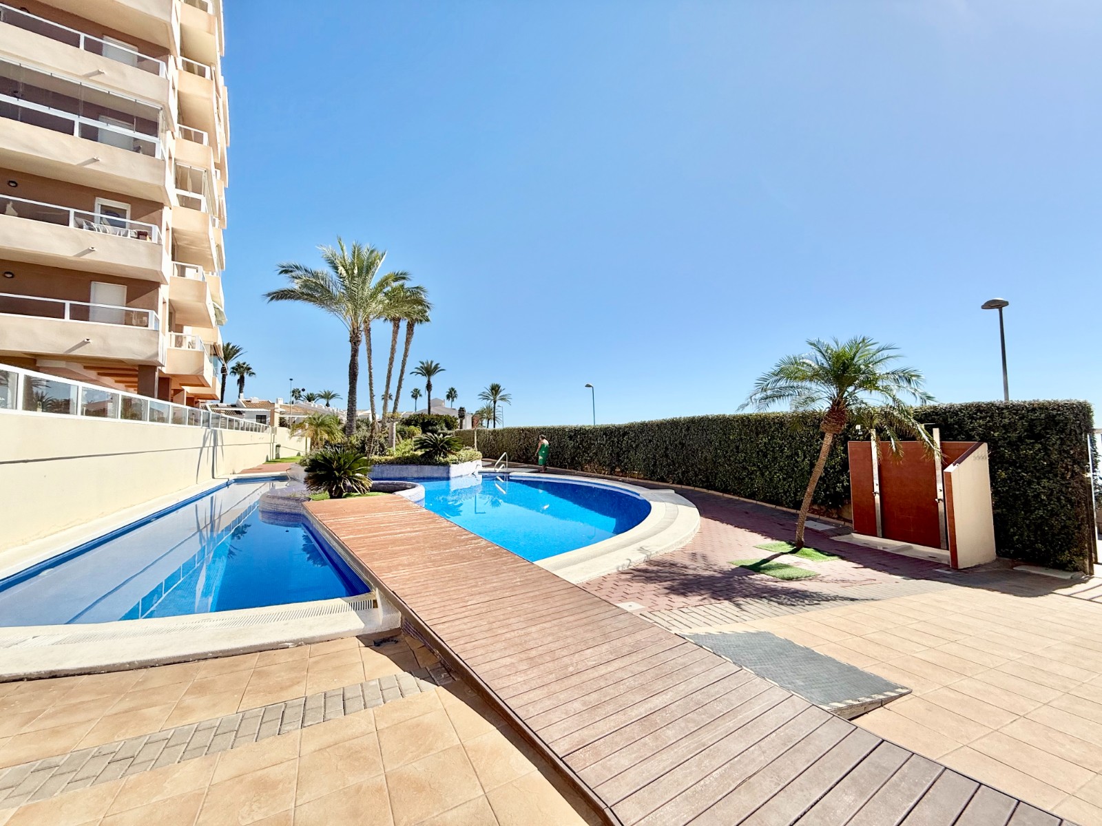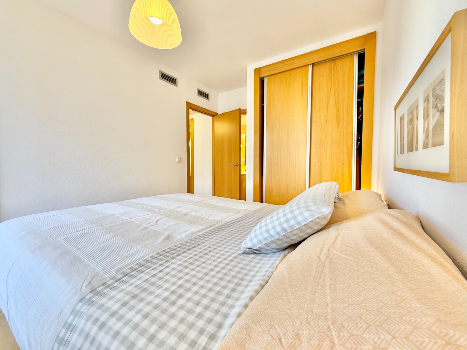 El apartamento, de construcción reciente y en excelente estado, está listo para entrar a vivir. Dispone de dos habitaciones y dos baños, además de aire acondicionado con bomba de frío y calor. La cocina es independiente, aunque existe la posibilidad de abrirla al salón para darle un estilo más moderno. Al fondo, encontrarás un lavadero, ideal para lavar la ropa de playa y enjuagar los bañadores tras un día de sol.