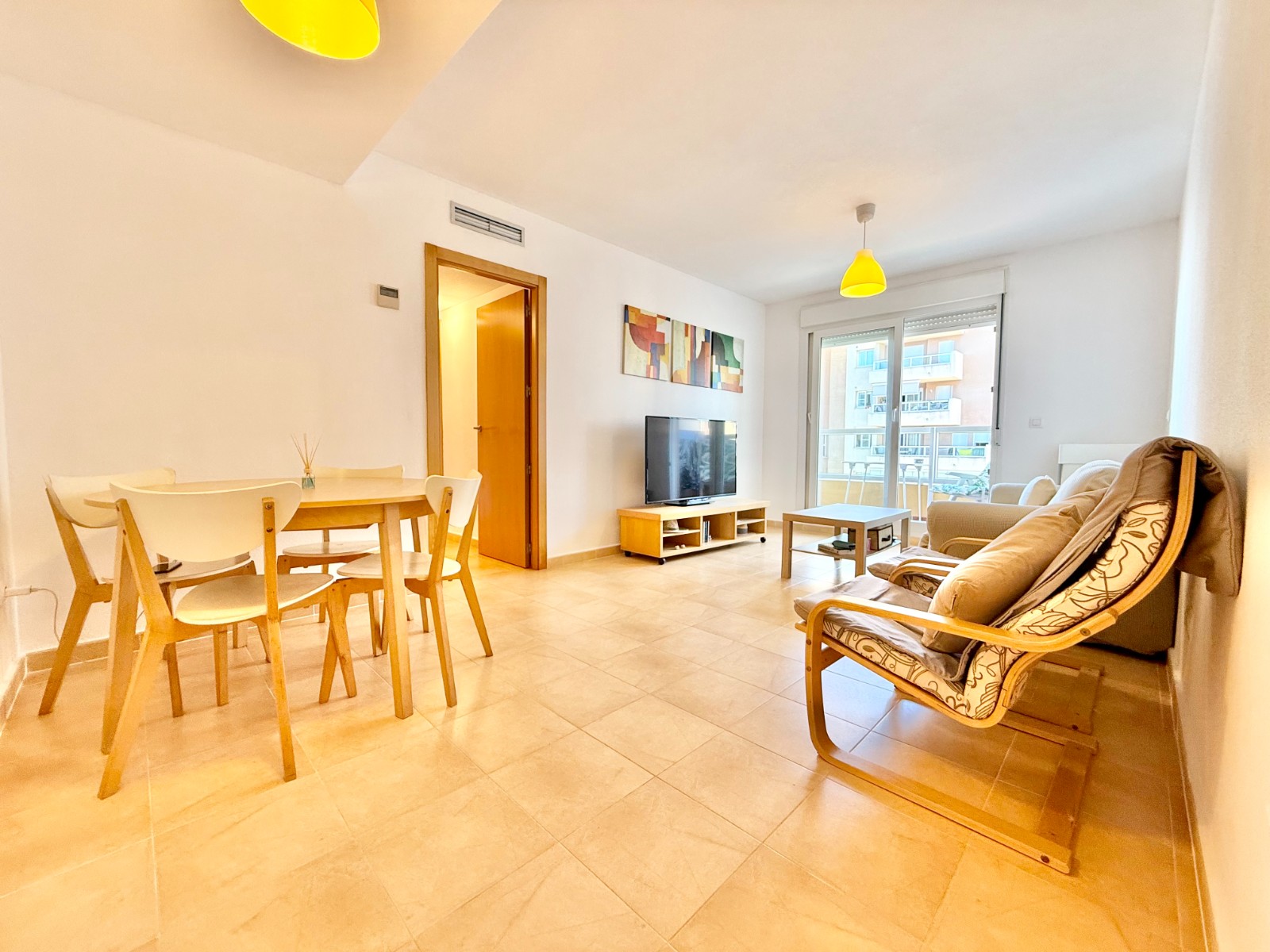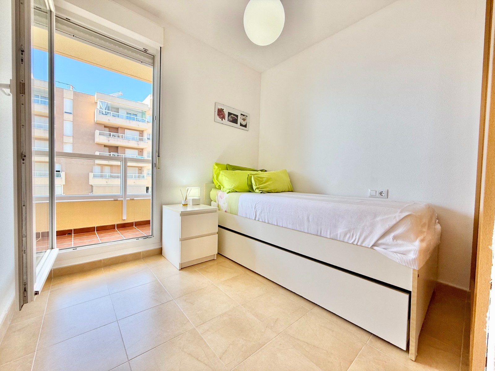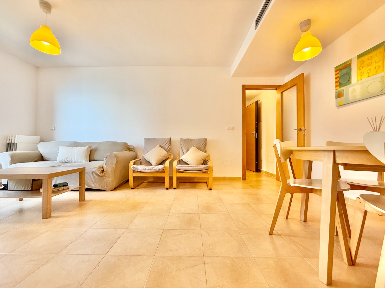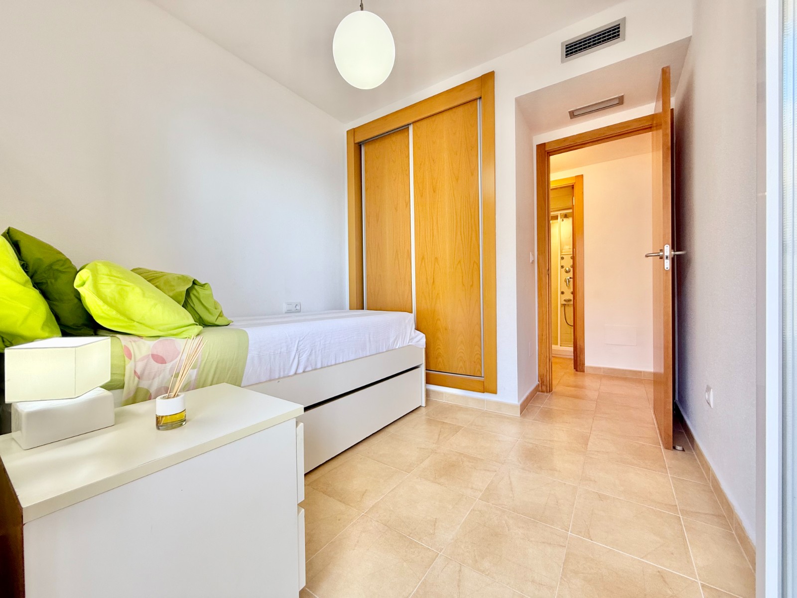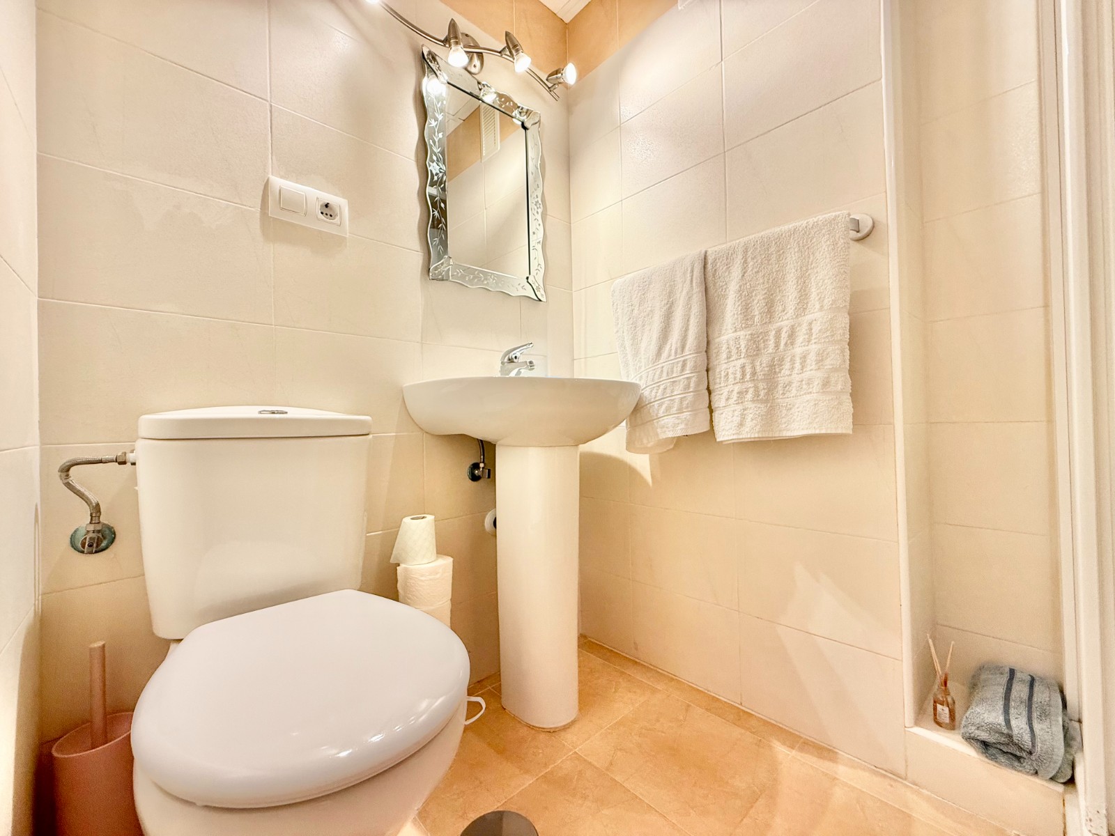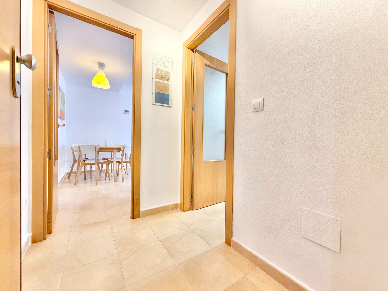 El apartamento, de construcción reciente y en excelente estado, está listo para entrar a vivir. Dispone de dos habitaciones y dos baños, además de aire acondicionado con bomba de frío y calor. La cocina es independiente, aunque existe la posibilidad de abrirla al salón para darle un estilo más moderno. Al fondo, encontrarás un lavadero, ideal para lavar la ropa de playa y enjuagar los bañadores tras un día de sol.