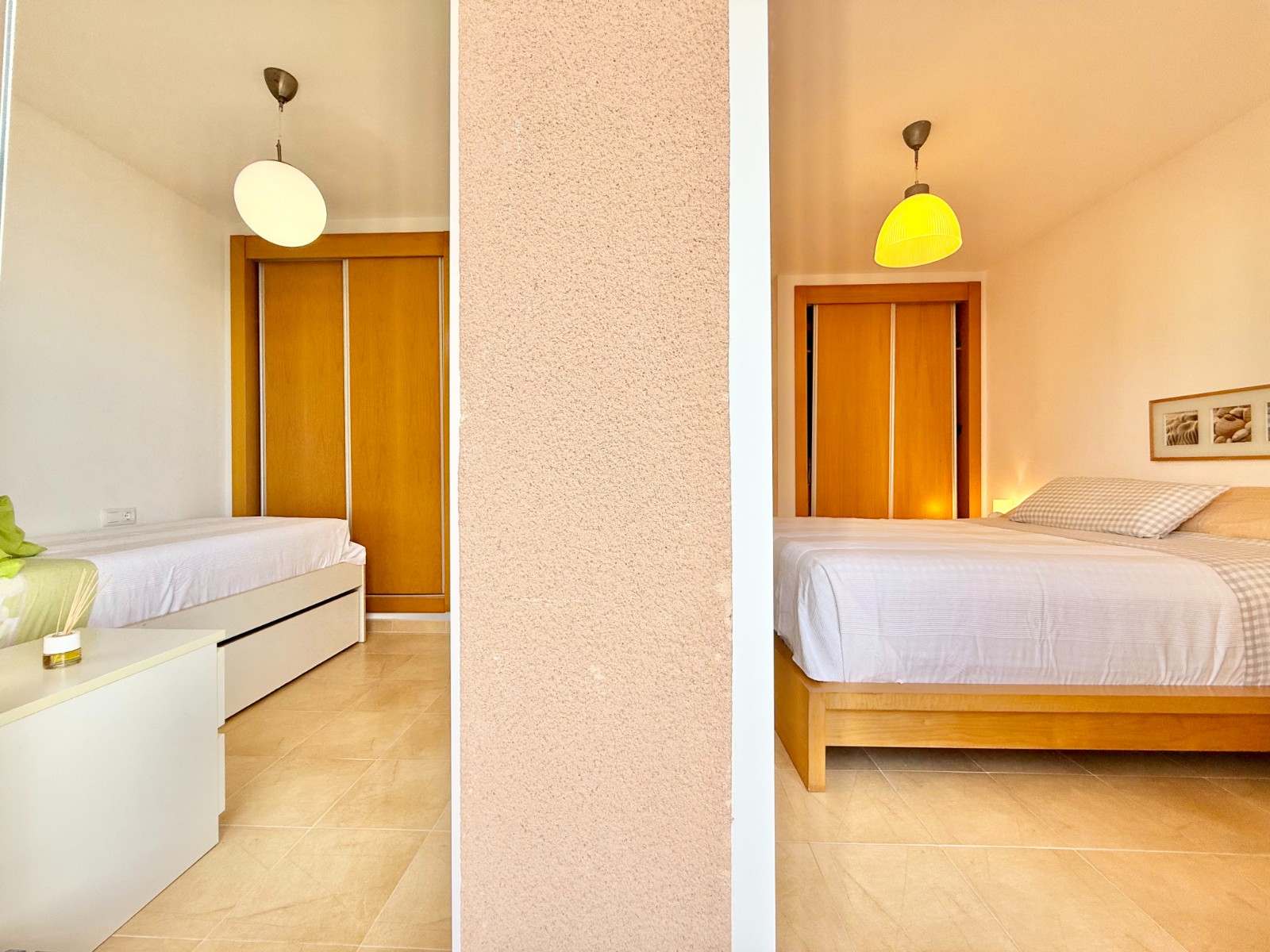 En la zona de descanso, el dormitorio principal y el segundo dormitorio cuentan ambos con acceso directo al balcón y armarios empotrados, además de vistas al mar que podrás disfrutar nada más despertarte.