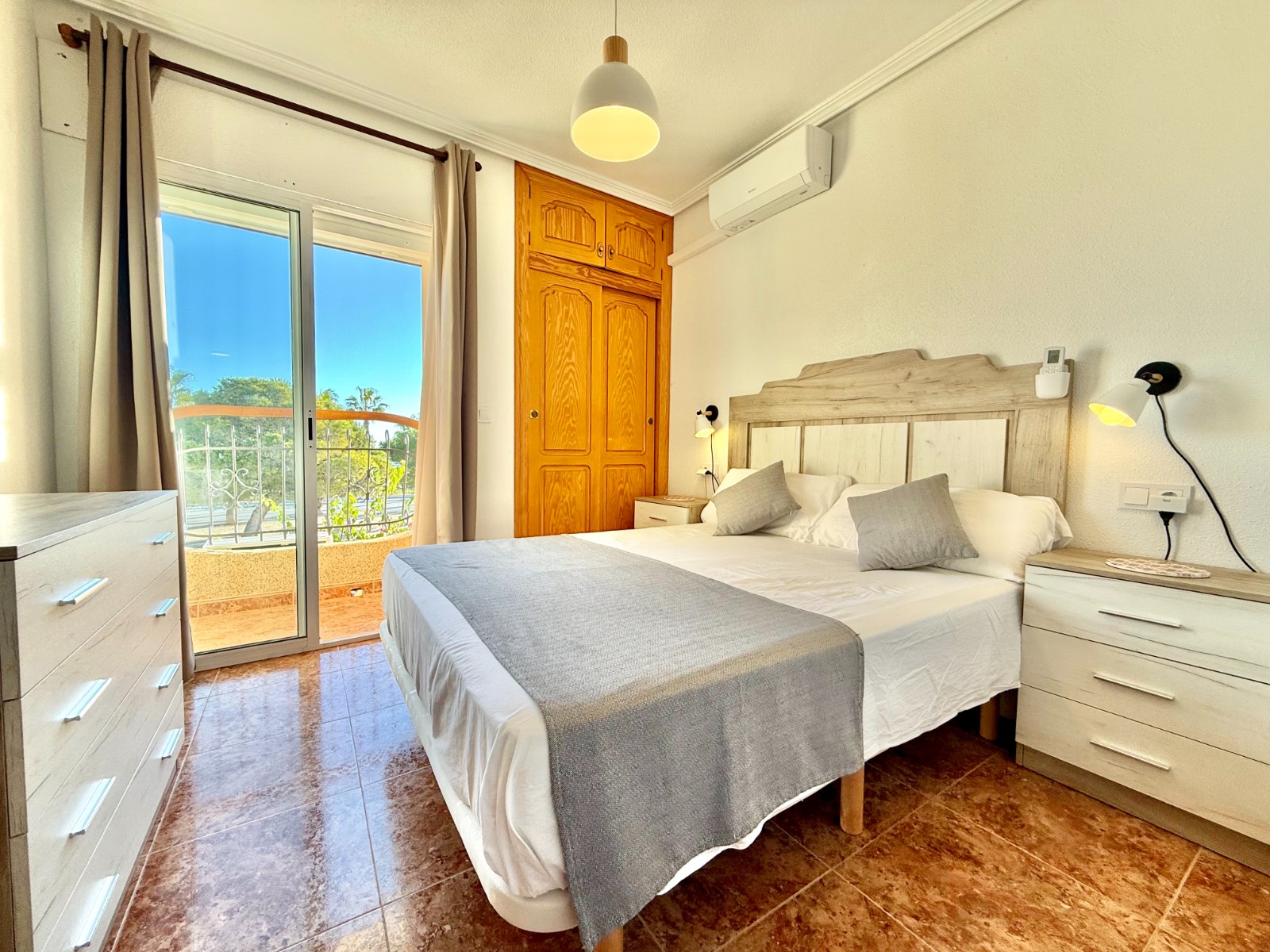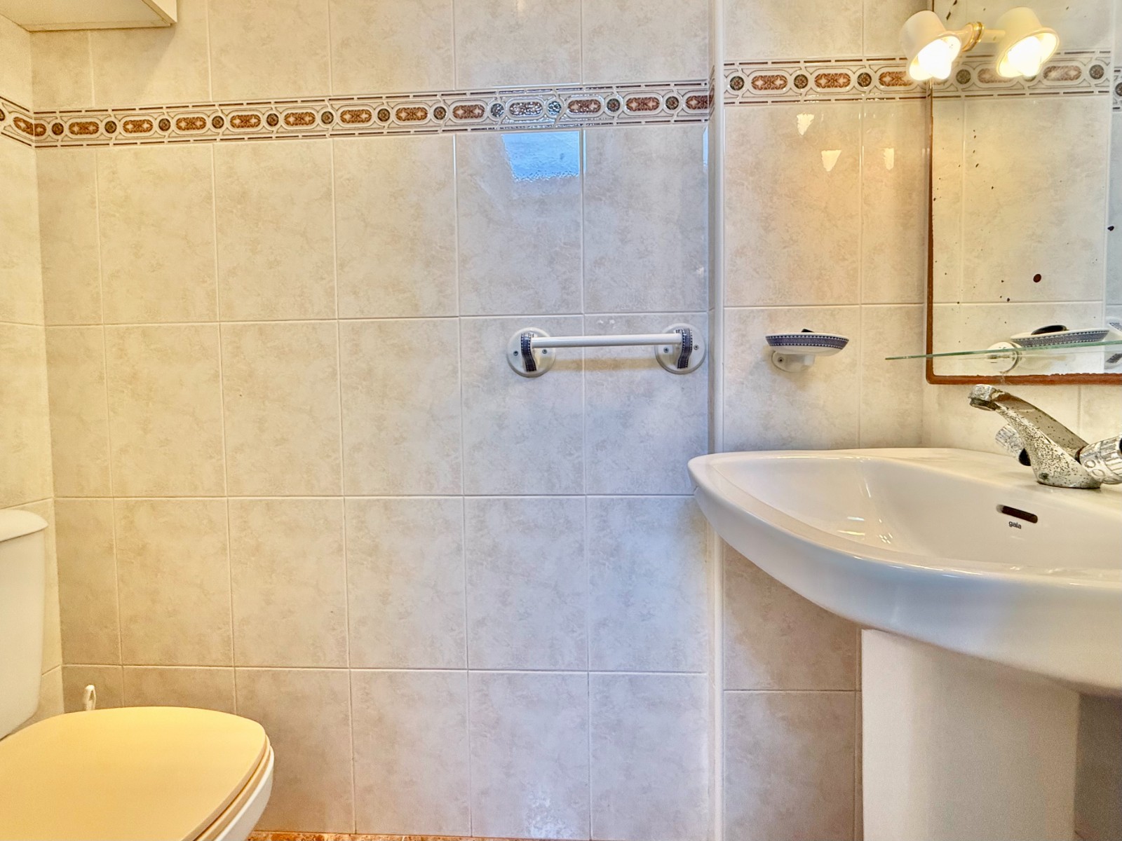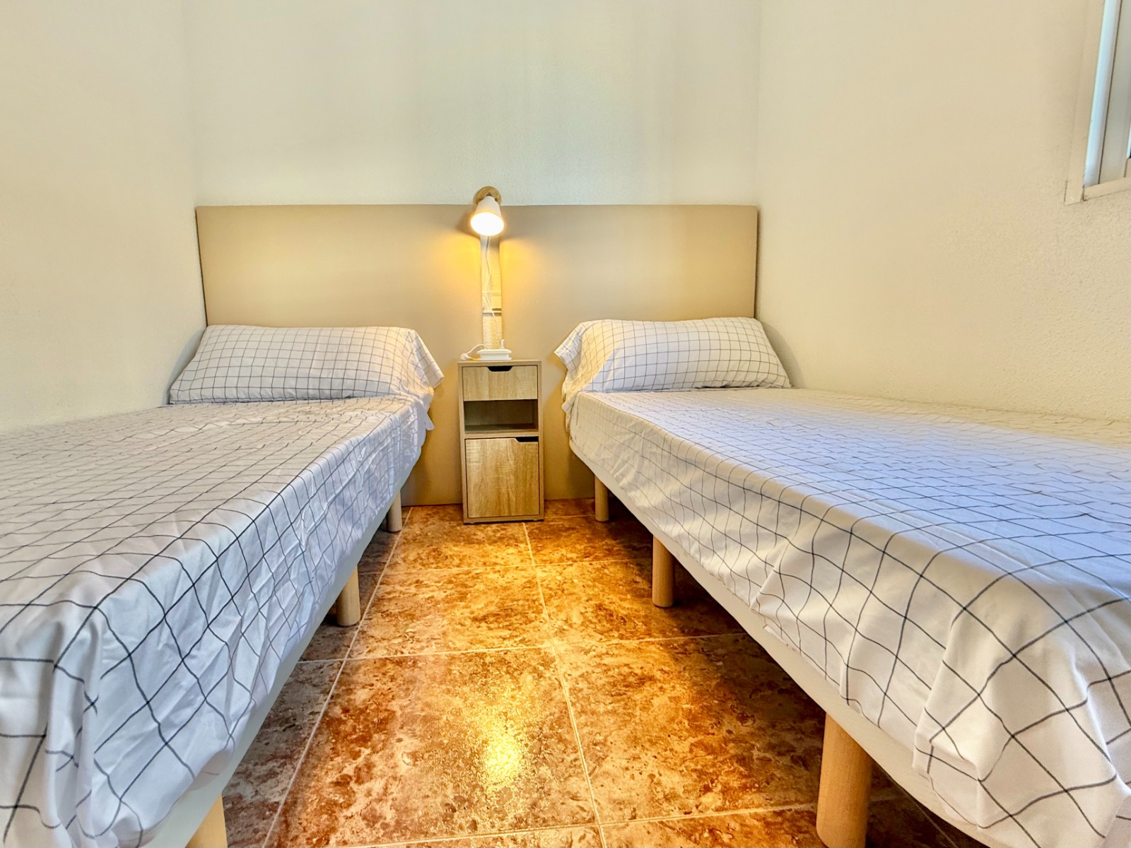 Por escalera desde el salón subimos a la planta superior con baño completo con bañera, dos dormitorios con armarios empotrados y balcón en el dormitorio principal desde el que se ve el mar.