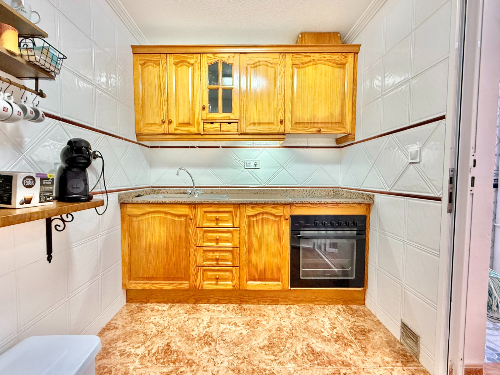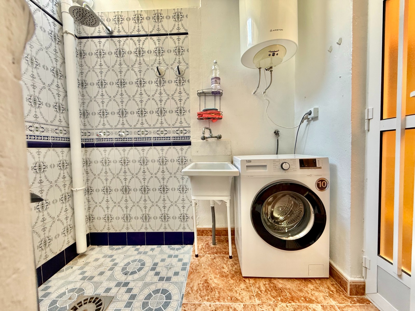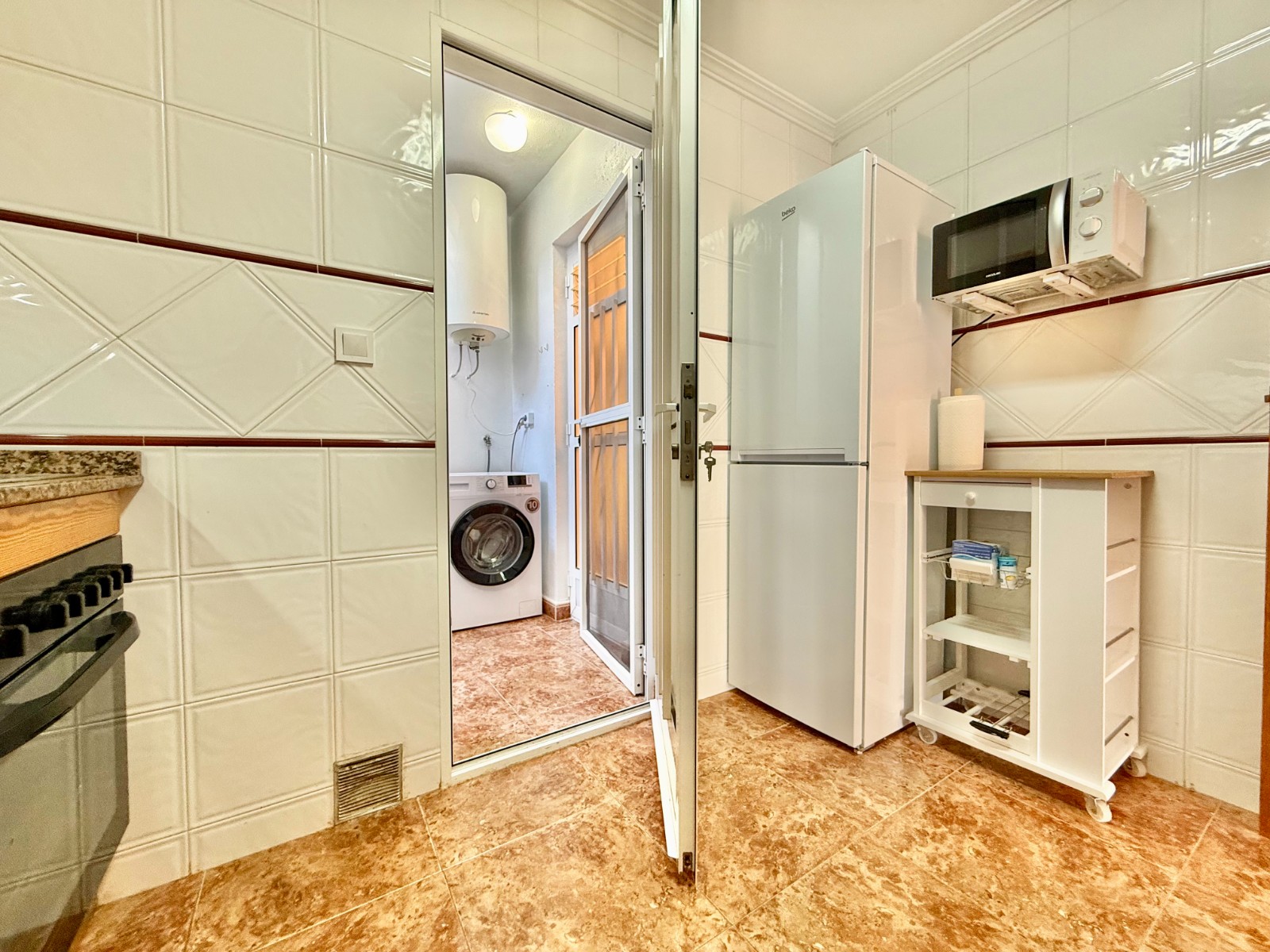 Distribución: Terraza delantera, salón/comedor, aseo y cocina independiente equipada y amueblada, pequeño patio interior con lavadora.