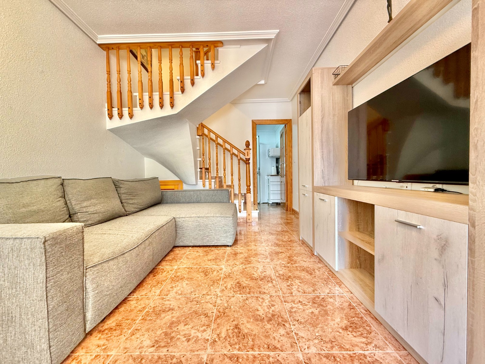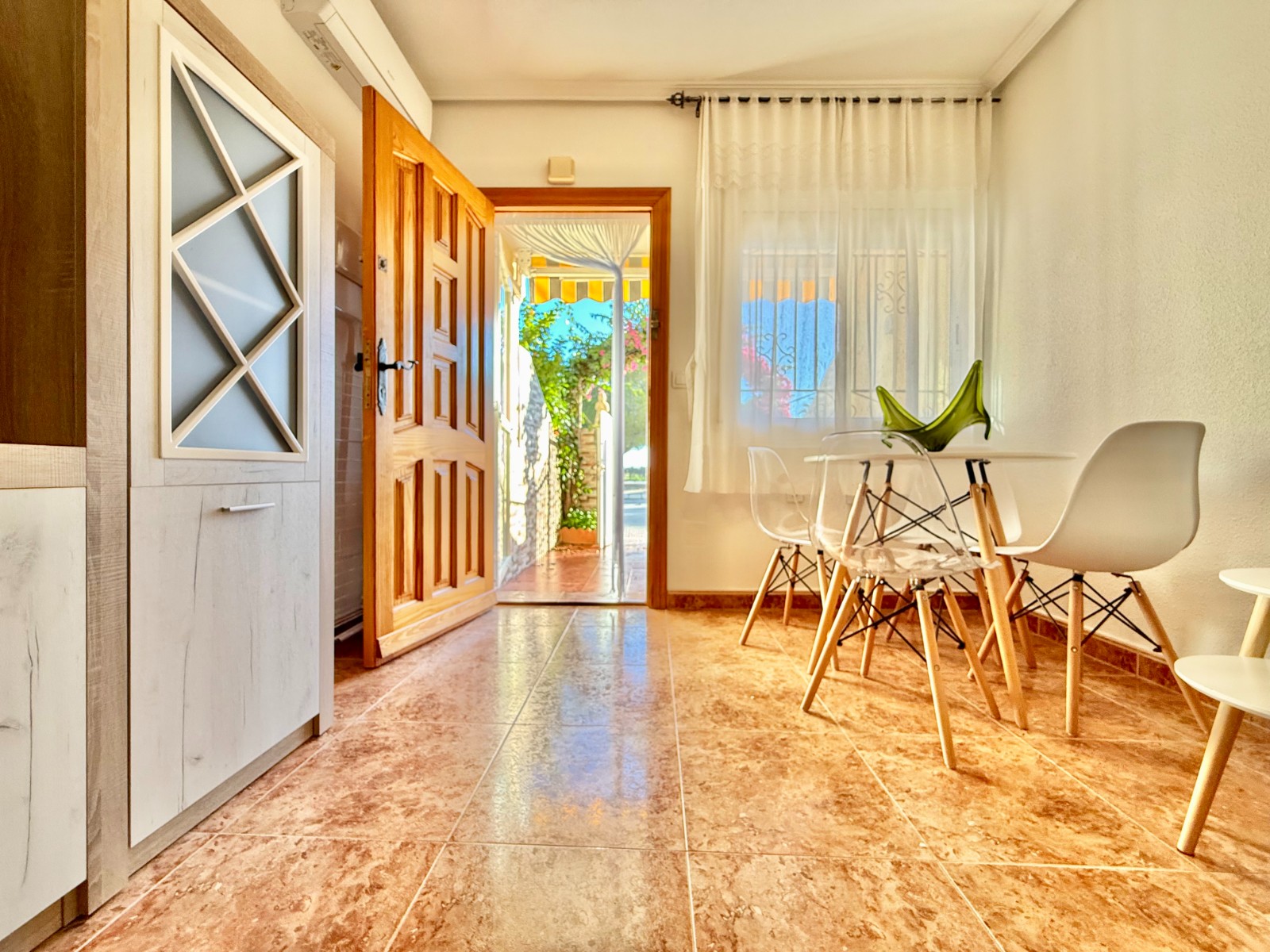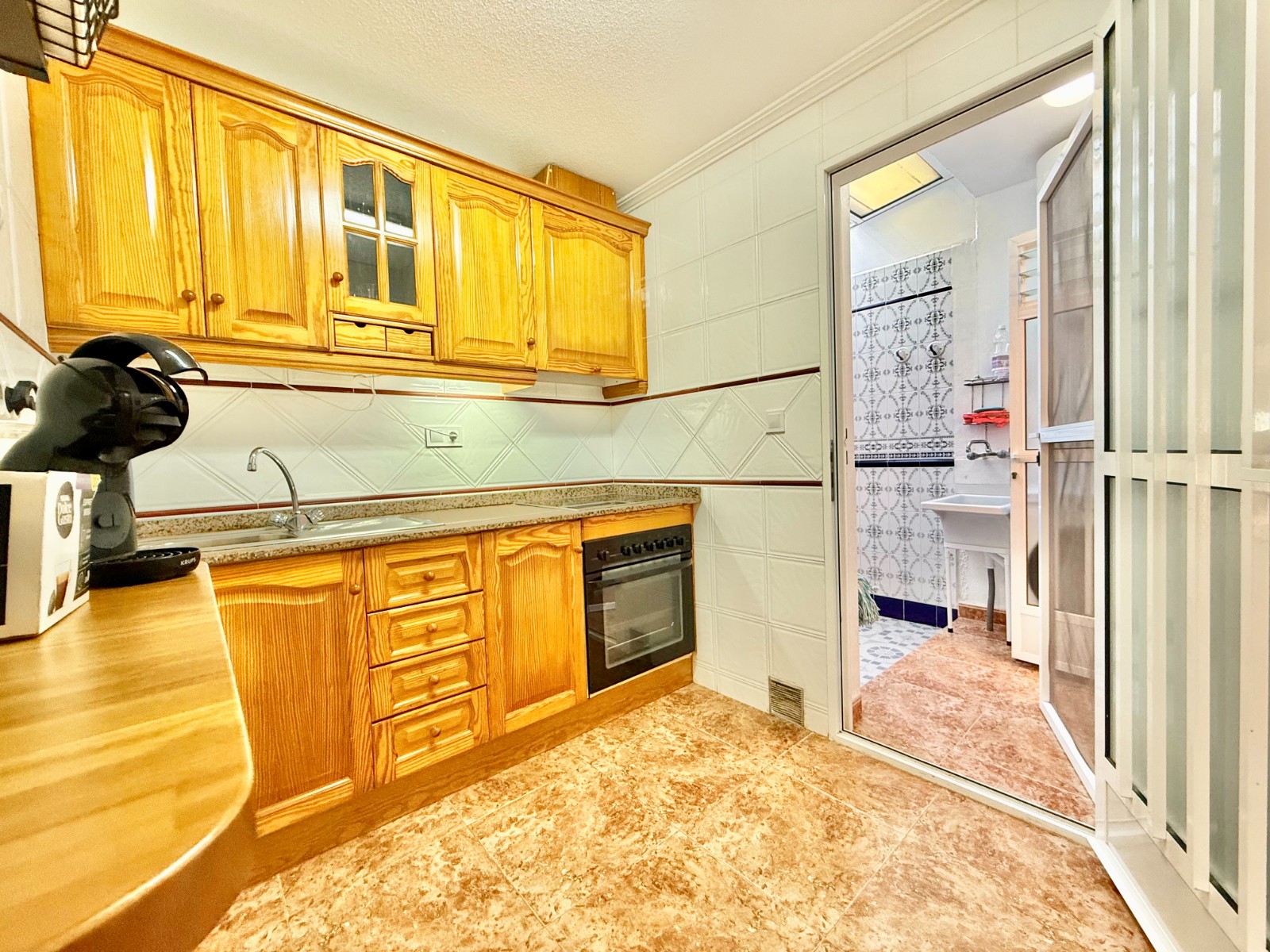 Distribución: Terraza delantera, salón/comedor, aseo y cocina independiente equipada y amueblada, pequeño patio interior con lavadora.