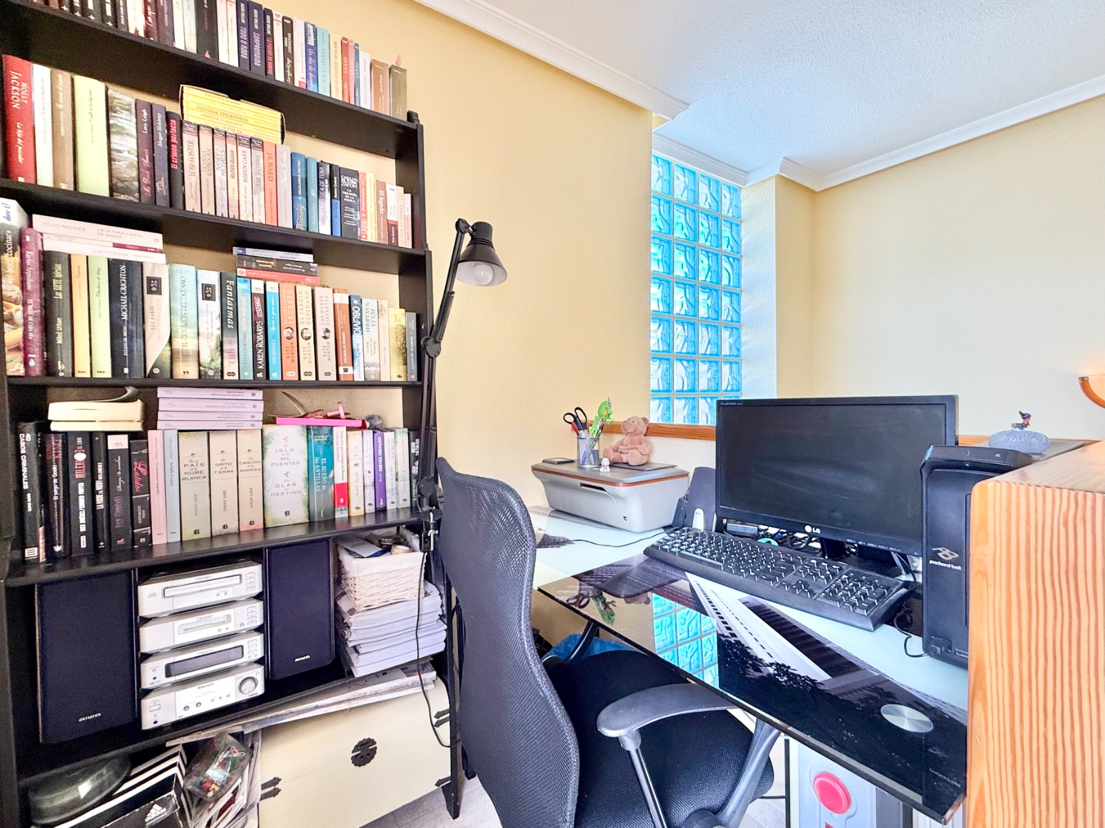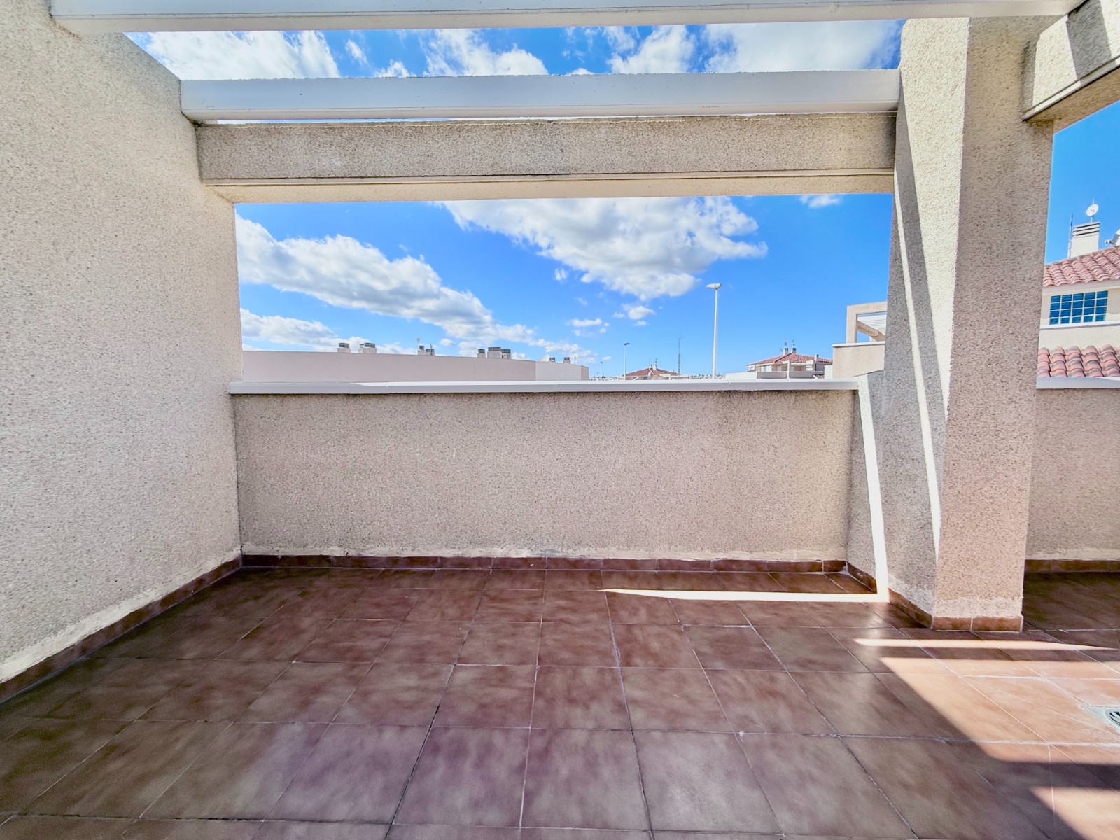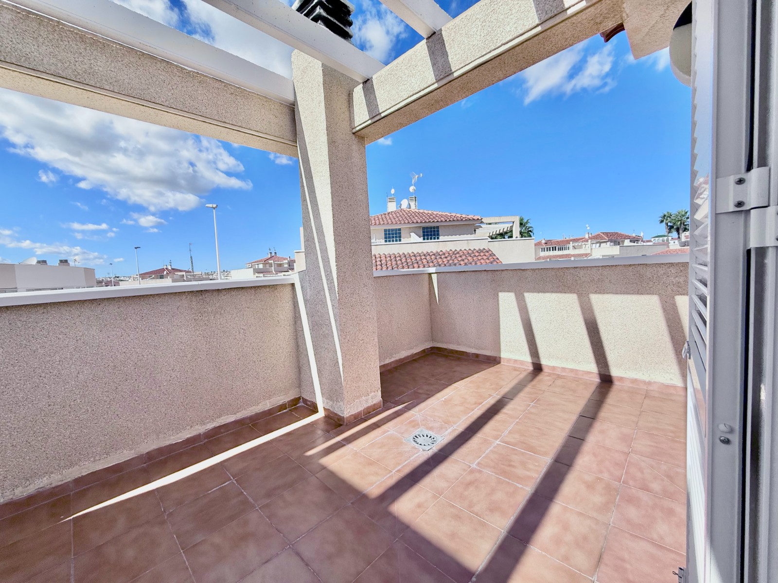 La planta superior ofrece una espaciosa buhardilla, actualmente utilizada como sala de ocio, pero con espacio suficiente para habilitar un tercer dormitorio. Desde aquí se accede a una amplia terraza solárium, perfecta para disfrutar del sol y las vistas despejadas.