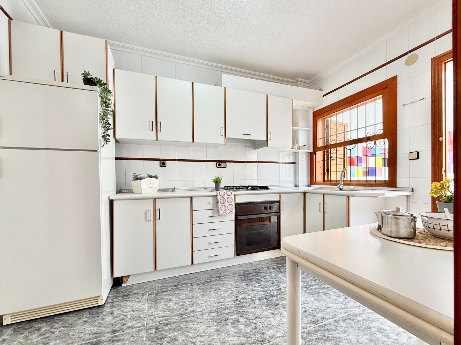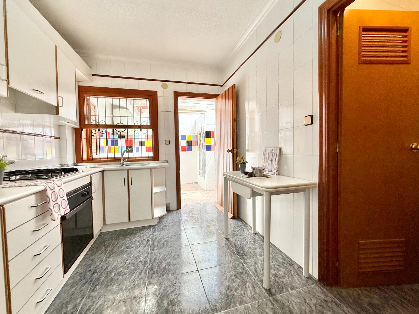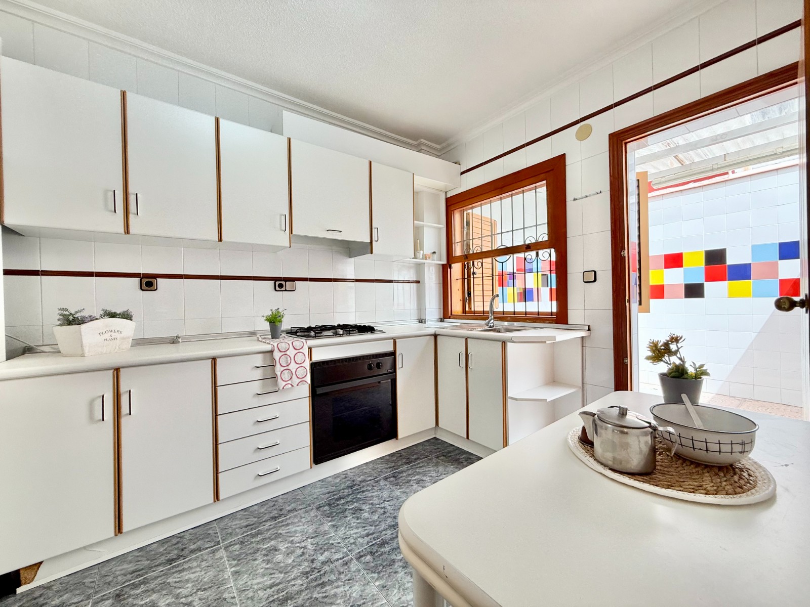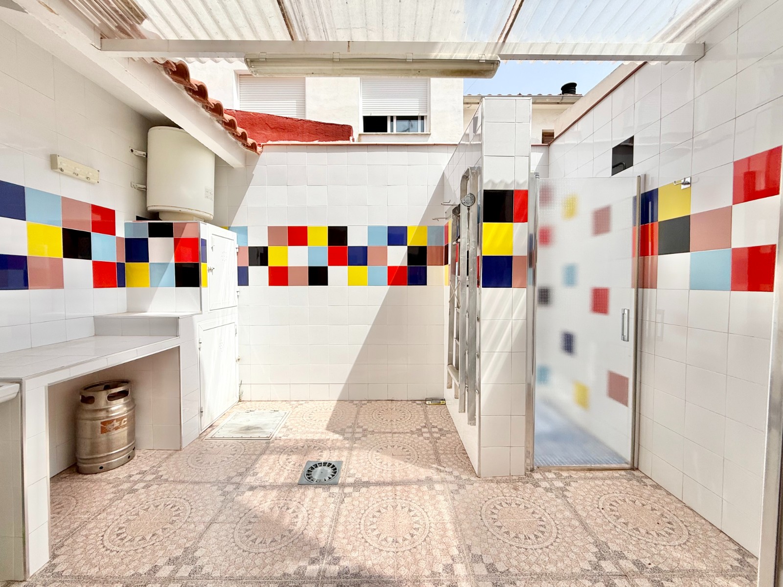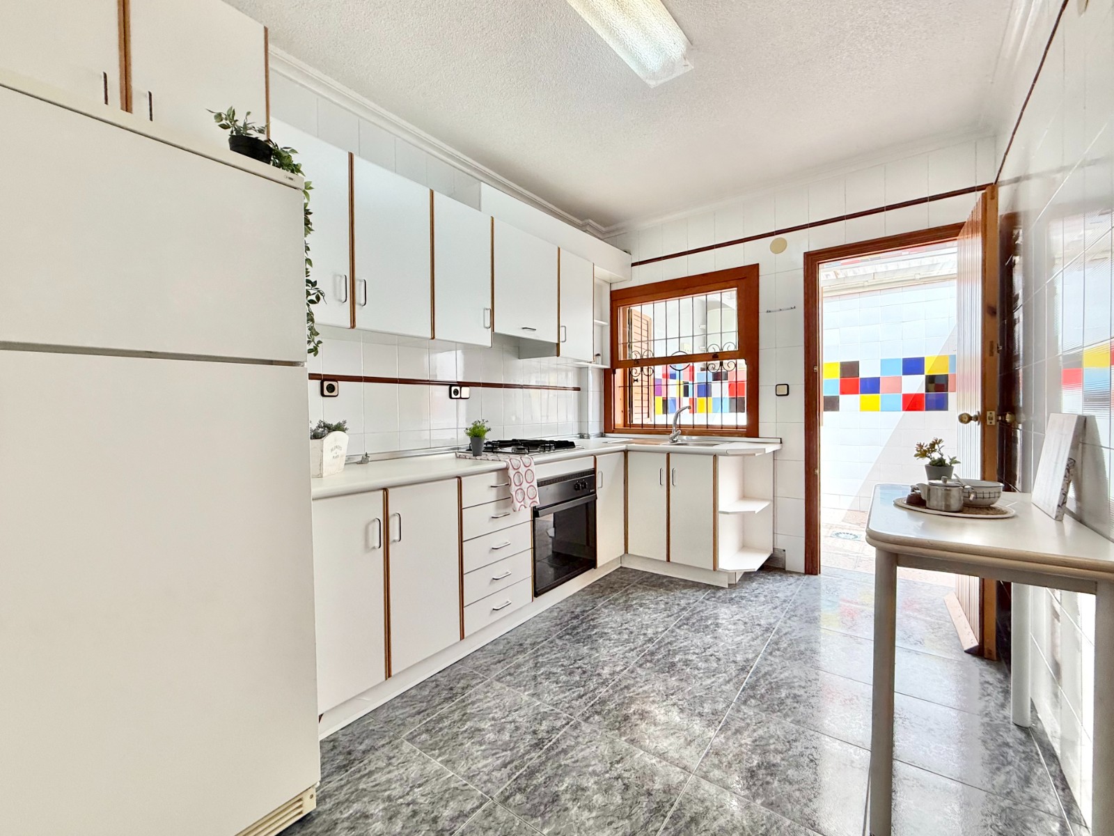 Al entrar, te recibe un salón amplio como los de antes, perfecto para reuniones familiares o con amigos. La cocina, justo a continuación, puede abrirse fácilmente tirando una pequeña pared para conseguir un concepto abierto y moderno. Desde aquí accedemos al patio trasero, donde encontrarás un baño y una práctica ducha exterior pensada para cuando vuelvas de la playa.