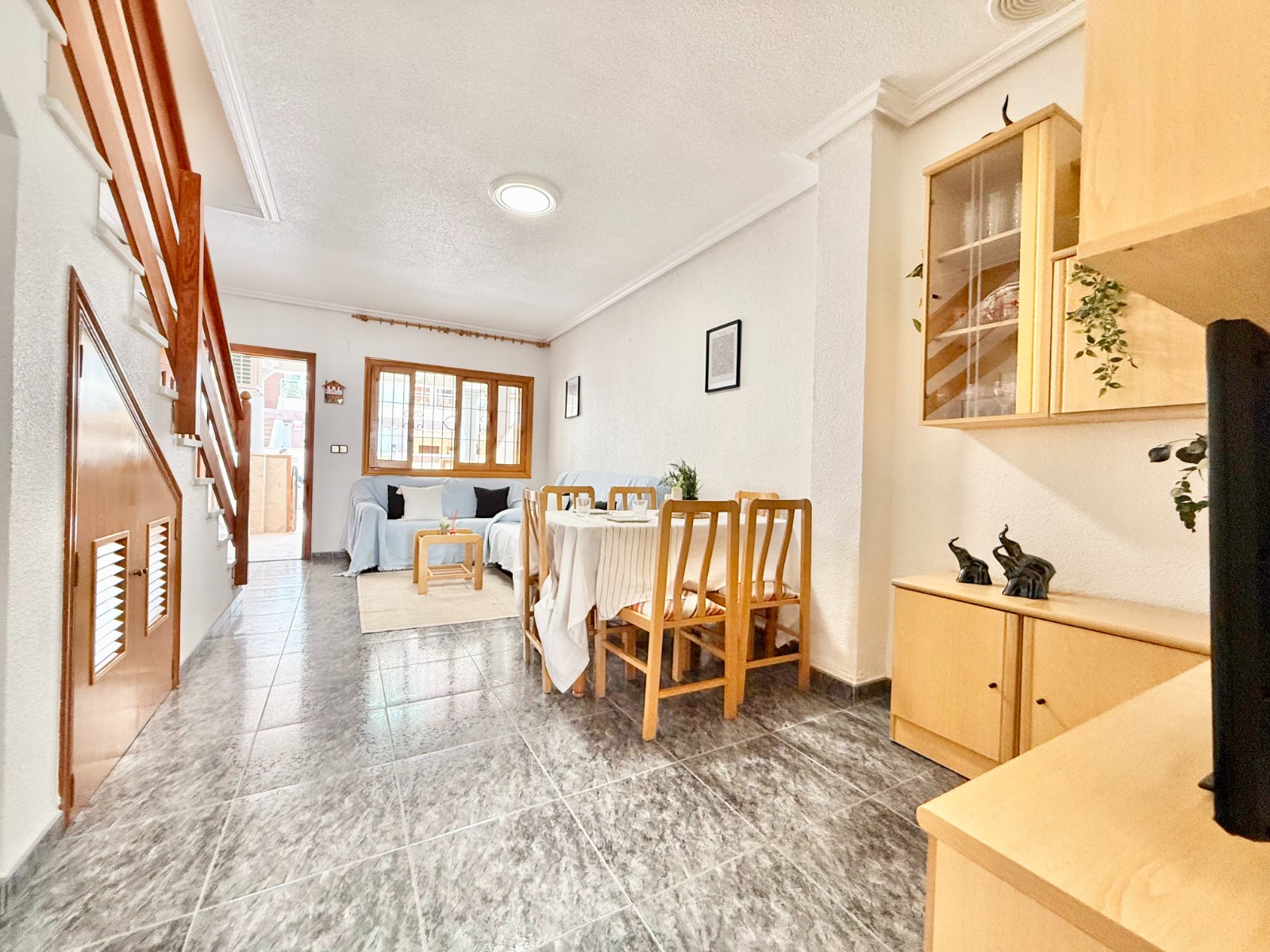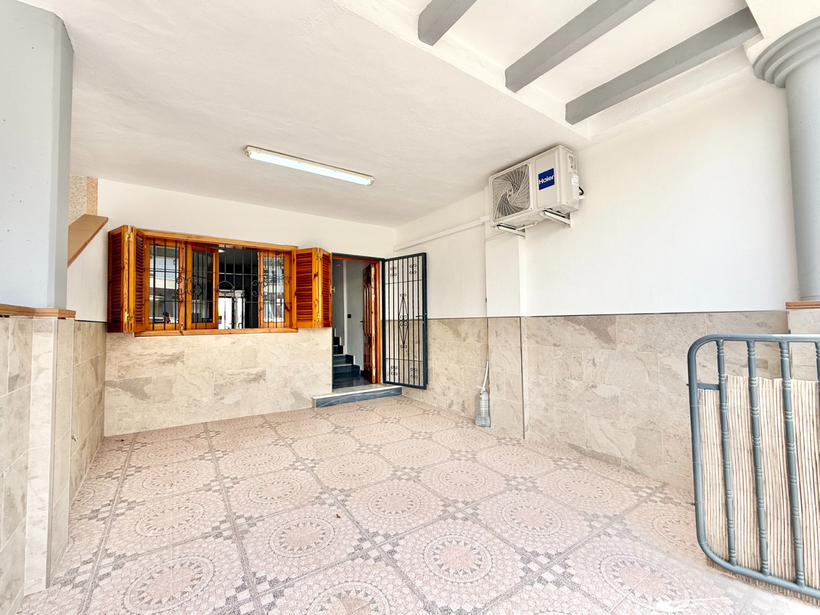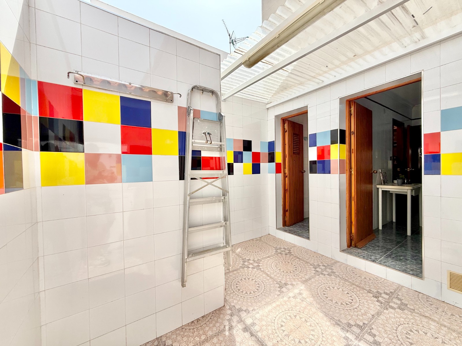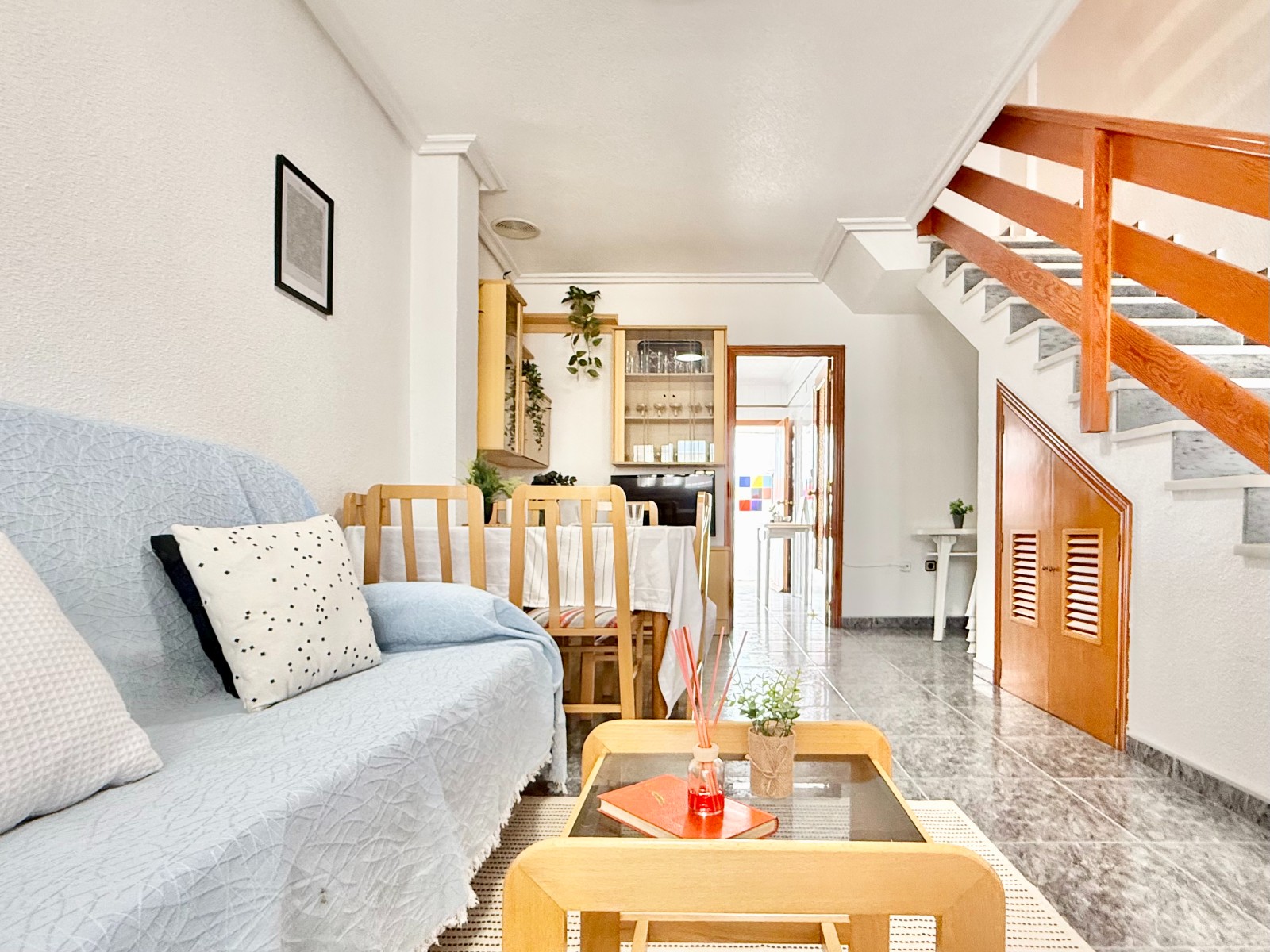 Al entrar, te recibe un salón amplio como los de antes, perfecto para reuniones familiares o con amigos. La cocina, justo a continuación, puede abrirse fácilmente tirando una pequeña pared para conseguir un concepto abierto y moderno. Desde aquí accedemos al patio trasero, donde encontrarás un baño y una práctica ducha exterior pensada para cuando vuelvas de la playa.