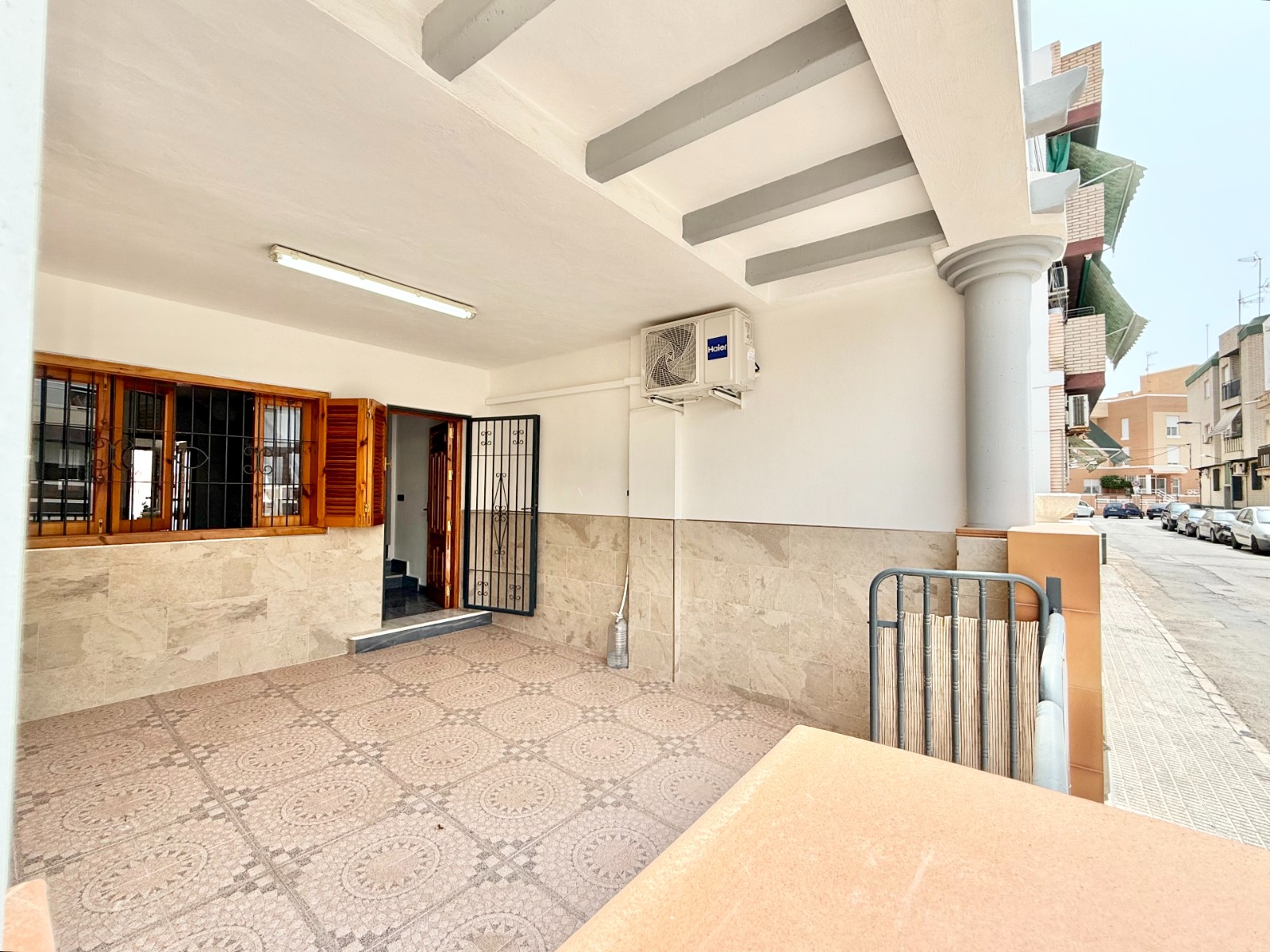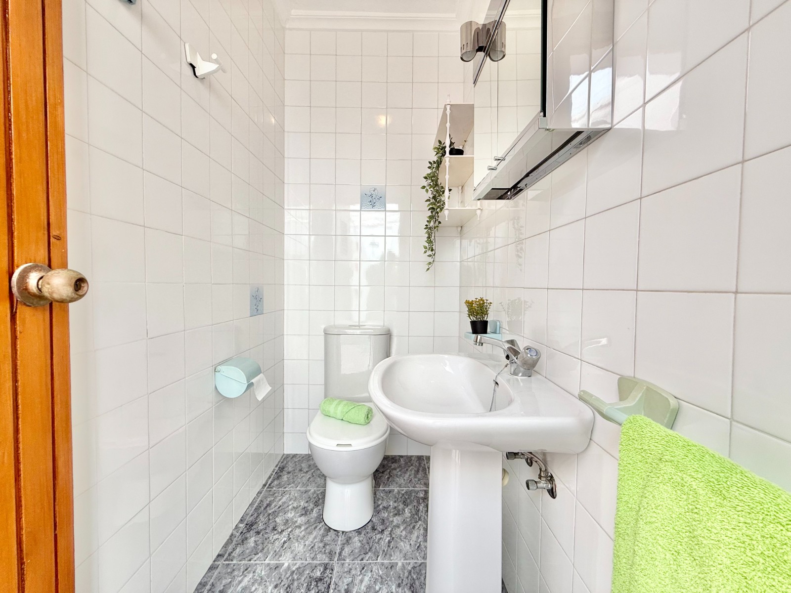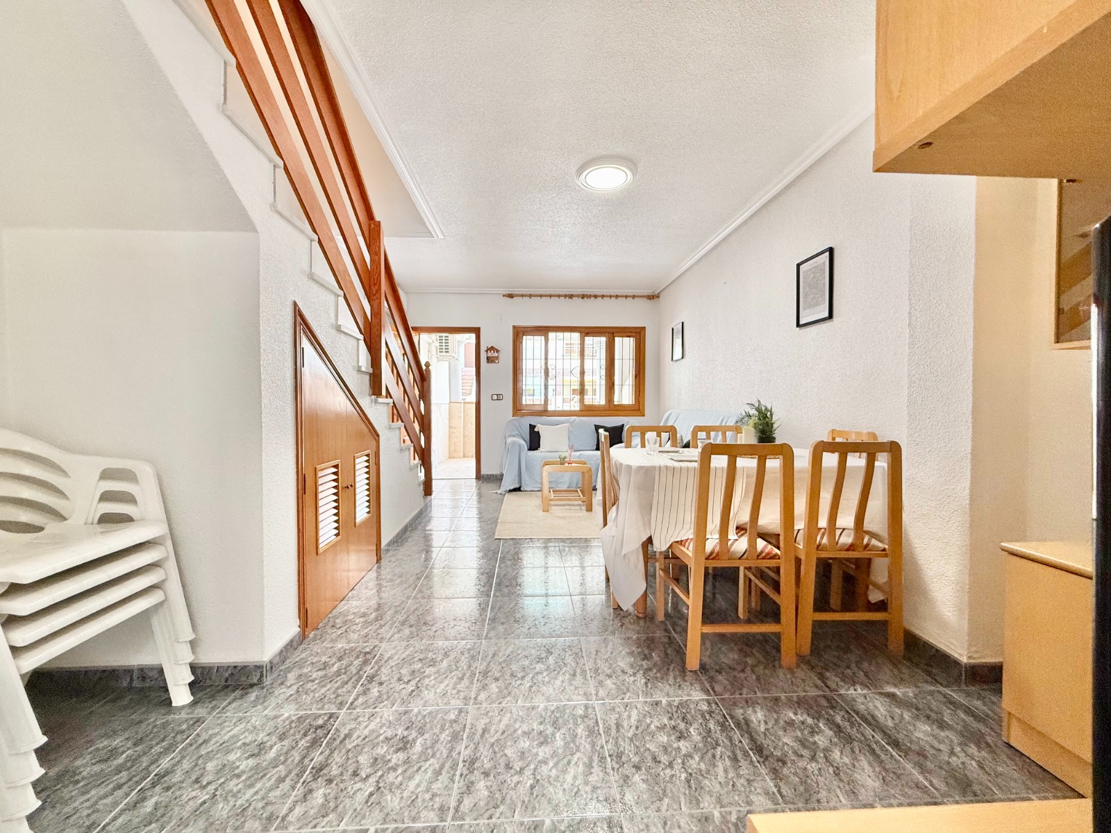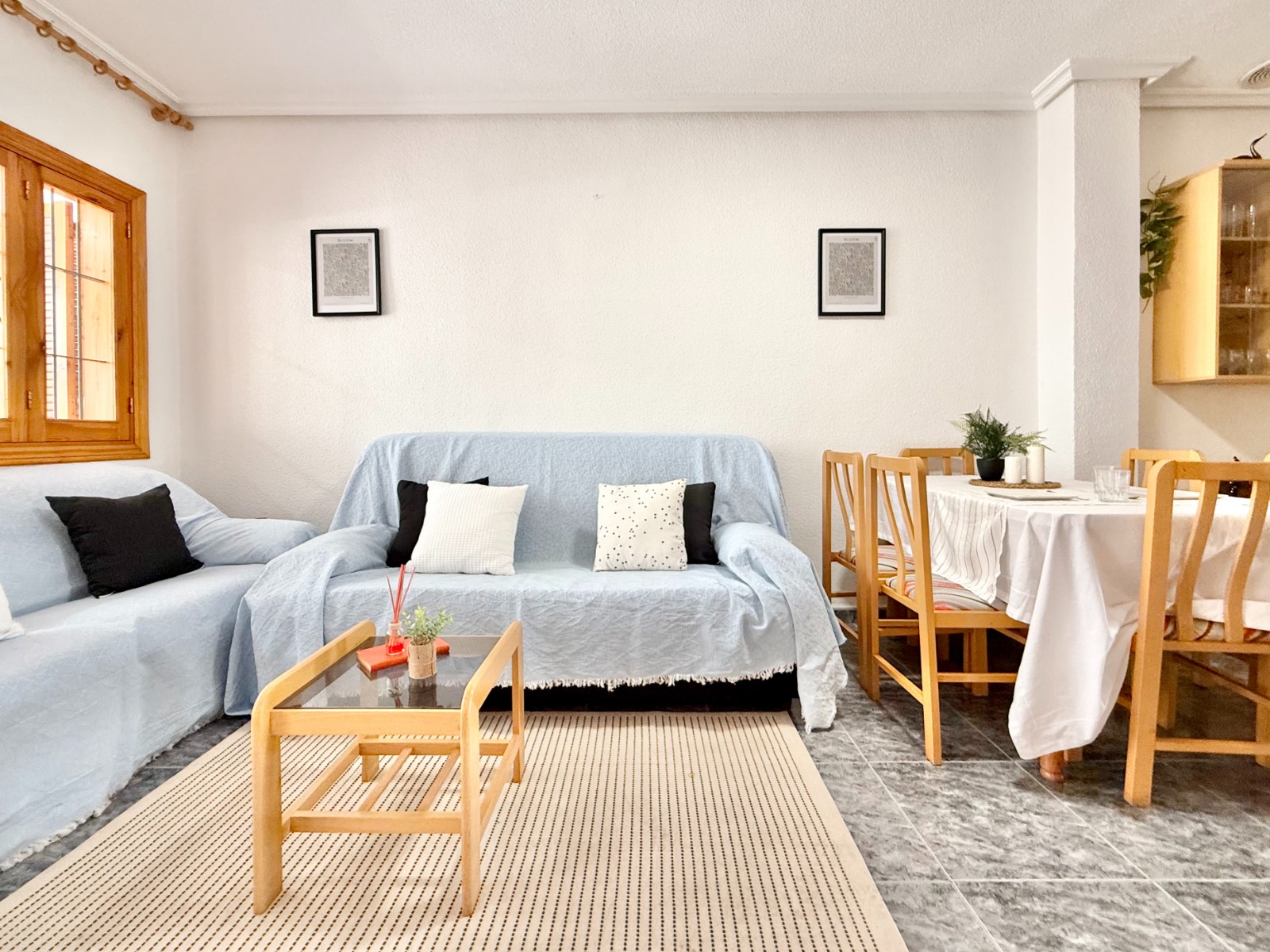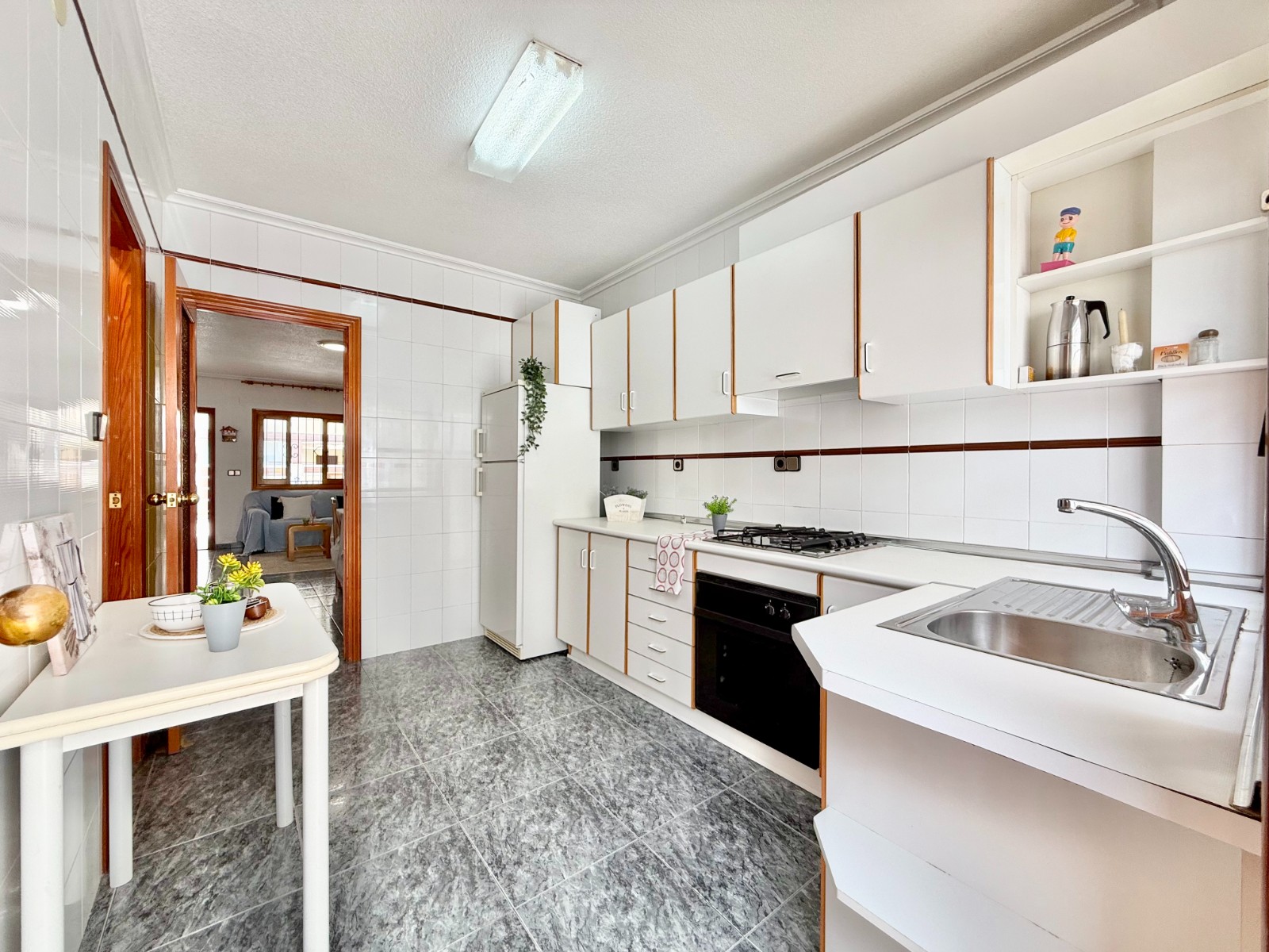 Al entrar, te recibe un salón amplio como los de antes, perfecto para reuniones familiares o con amigos. La cocina, justo a continuación, puede abrirse fácilmente tirando una pequeña pared para conseguir un concepto abierto y moderno. Desde aquí accedemos al patio trasero, donde encontrarás un baño y una práctica ducha exterior pensada para cuando vuelvas de la playa.