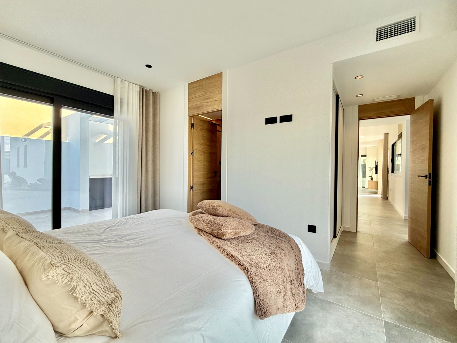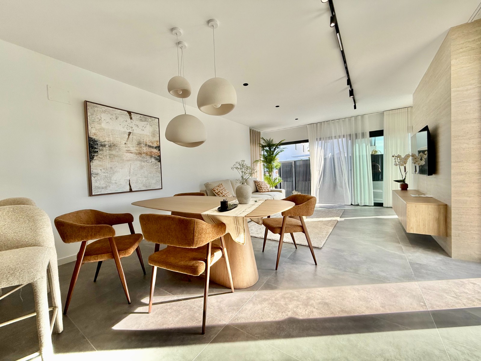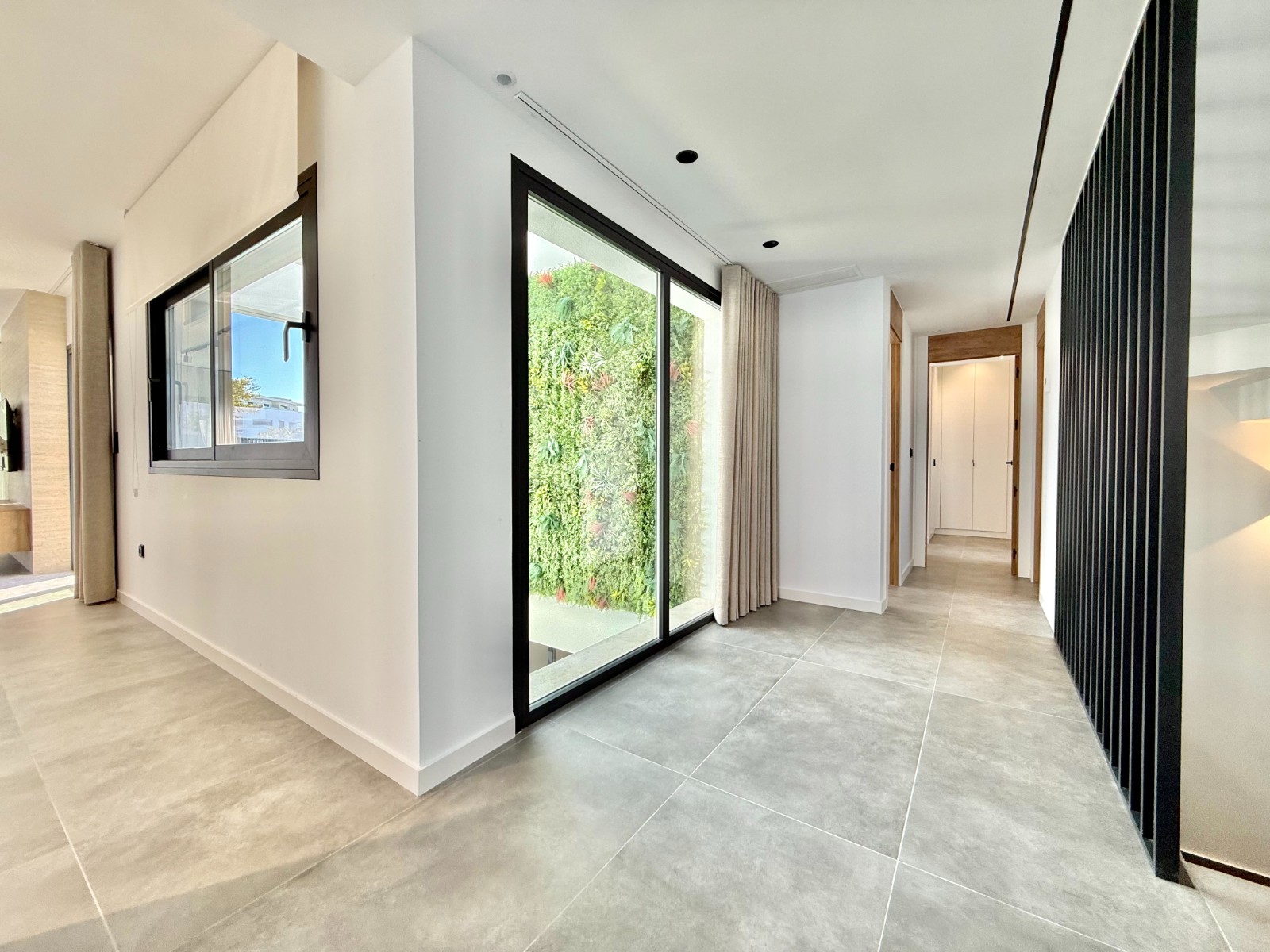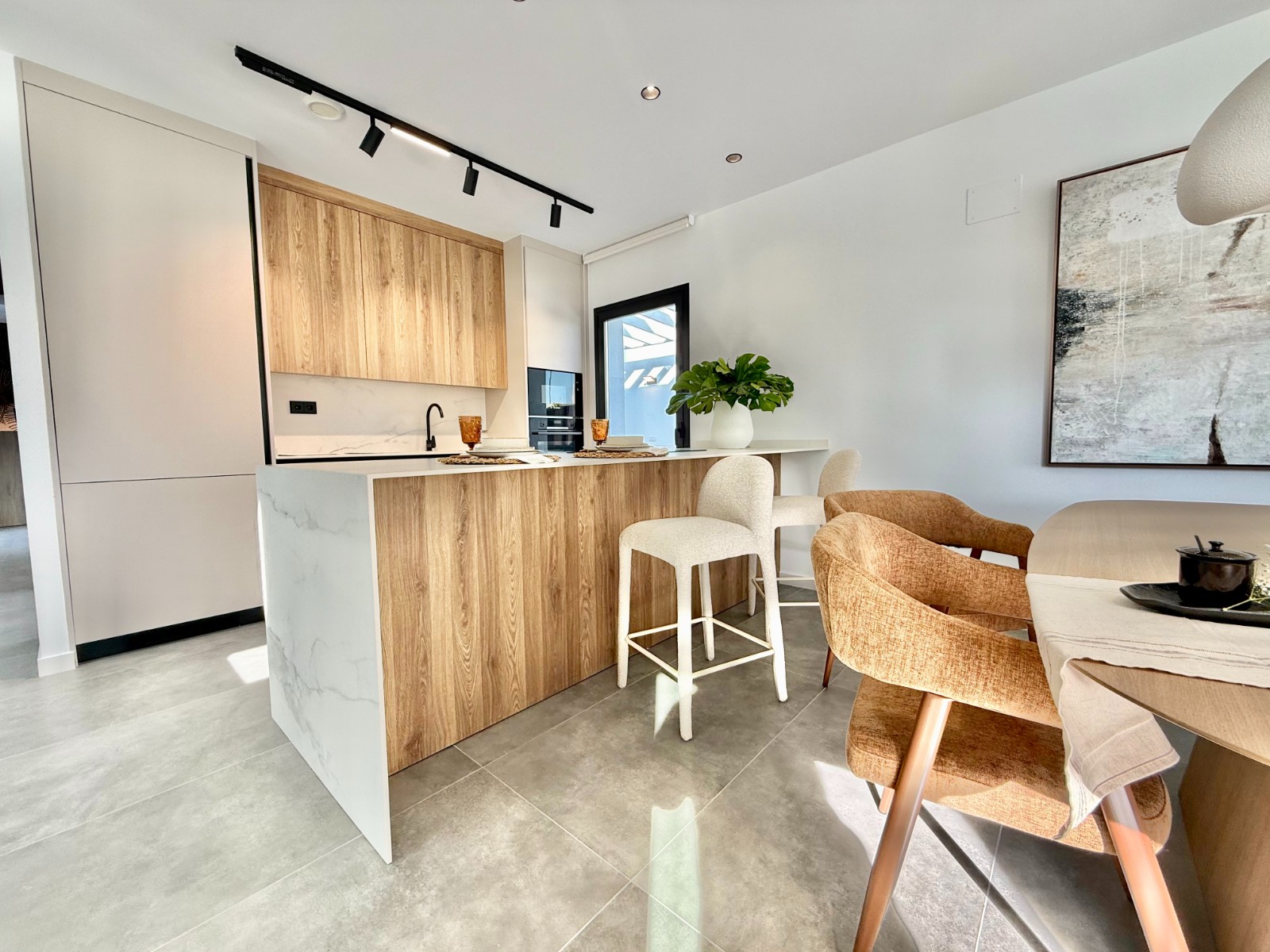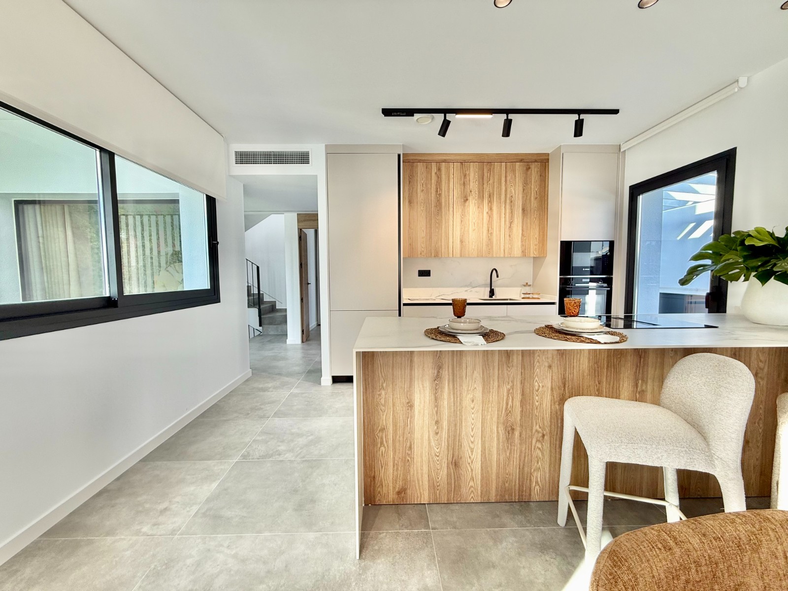 La propiedad cuenta con 140 m² en planta principal distribuidos en un gran salón con cocina integrada, recibidor independiente, tres dormitorios con armarios empotrados y dos baños completos, uno de ellos en suite con vestidor. Destaca la calidad de sus acabados y la elegante combinación de carpintería en blanco y roble.