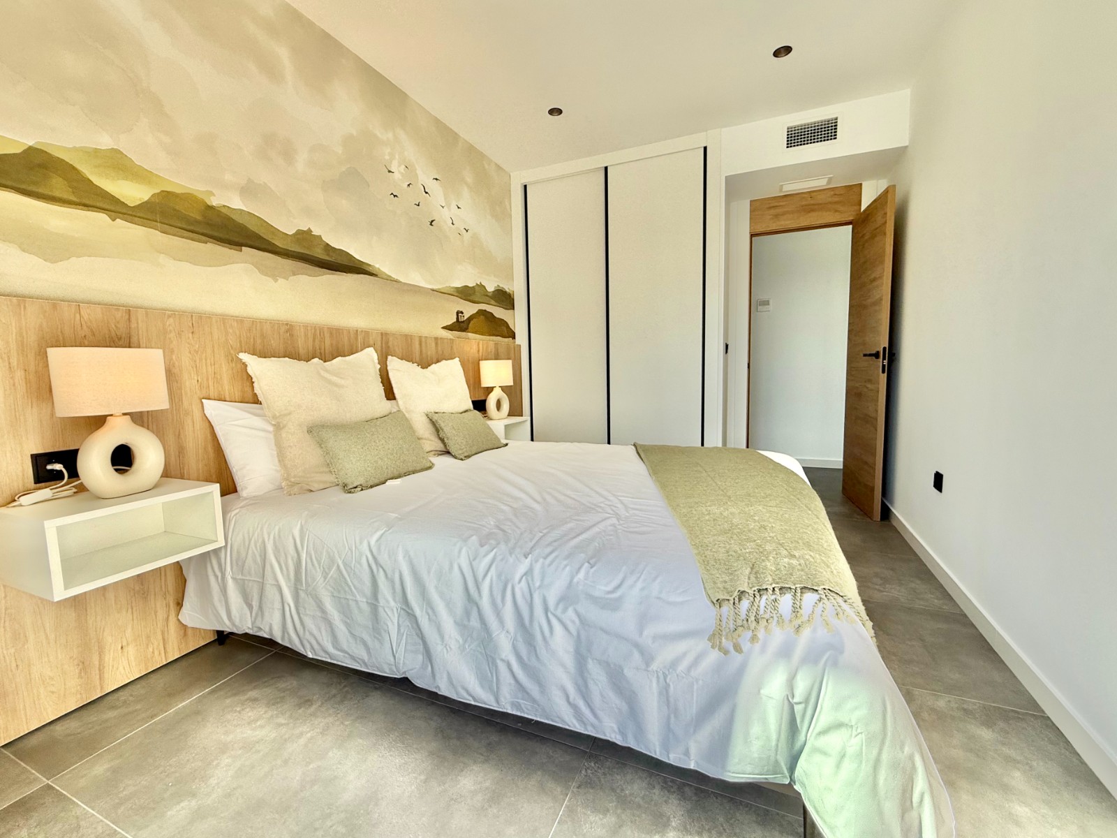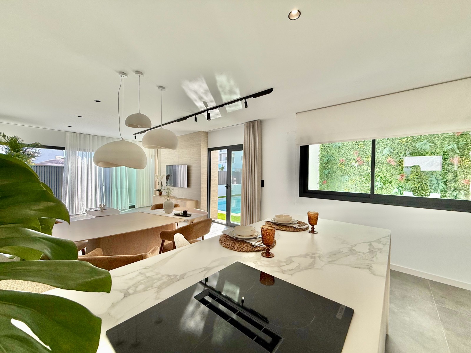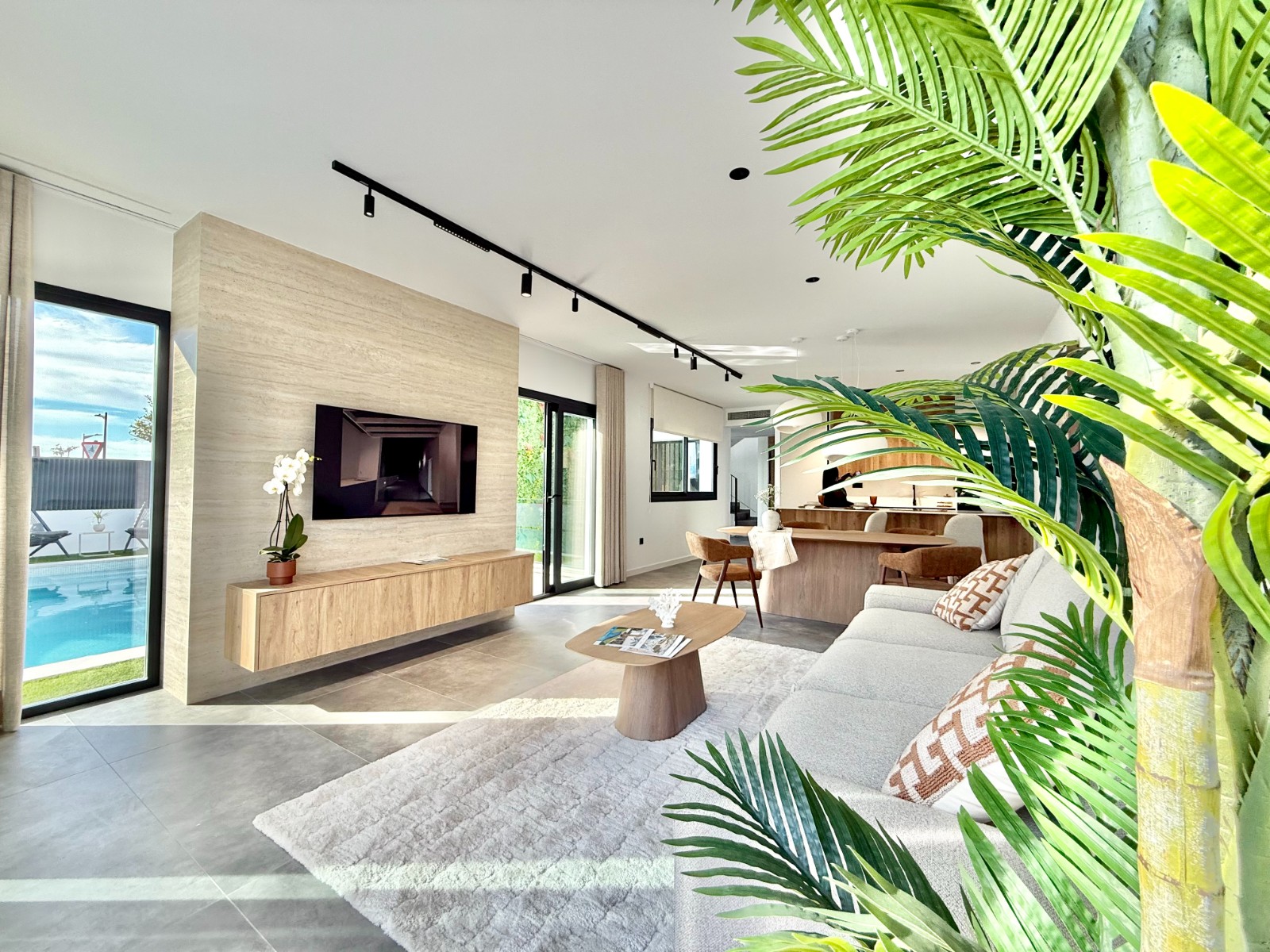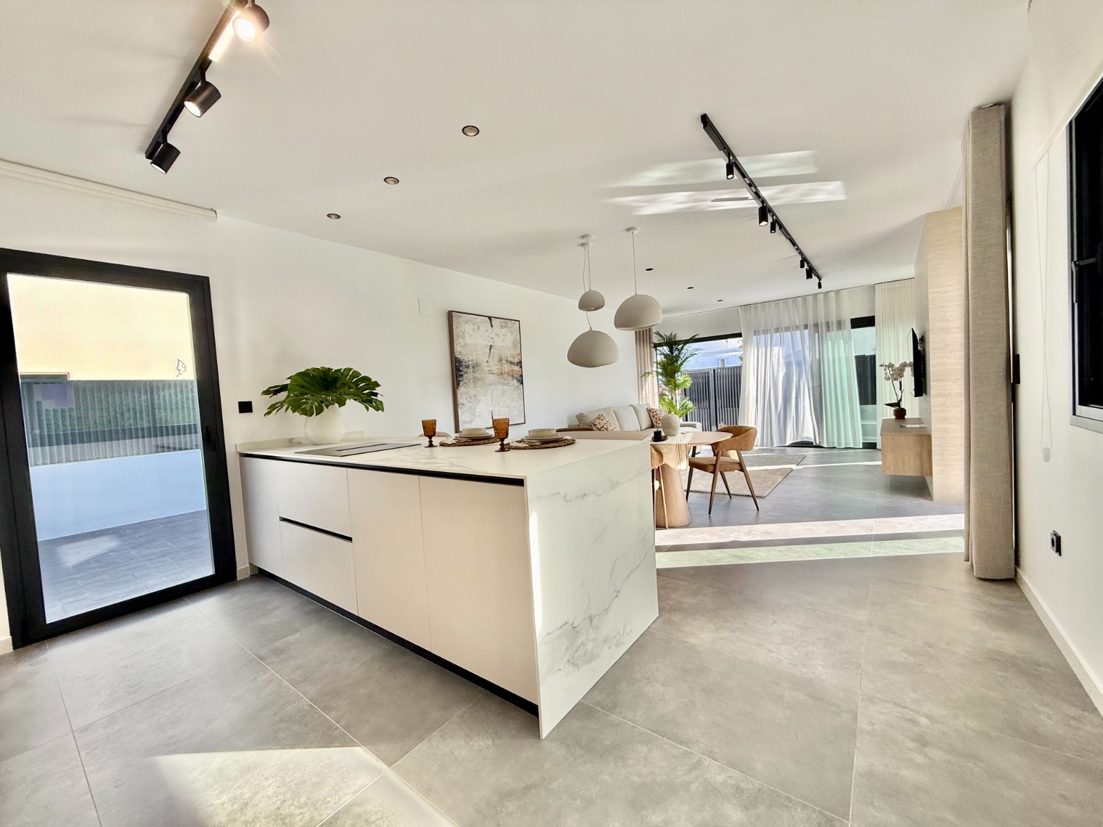 La propiedad cuenta con 140 m² en planta principal distribuidos en un gran salón con cocina integrada, recibidor independiente, tres dormitorios con armarios empotrados y dos baños completos, uno de ellos en suite con vestidor. Destaca la calidad de sus acabados y la elegante combinación de carpintería en blanco y roble.