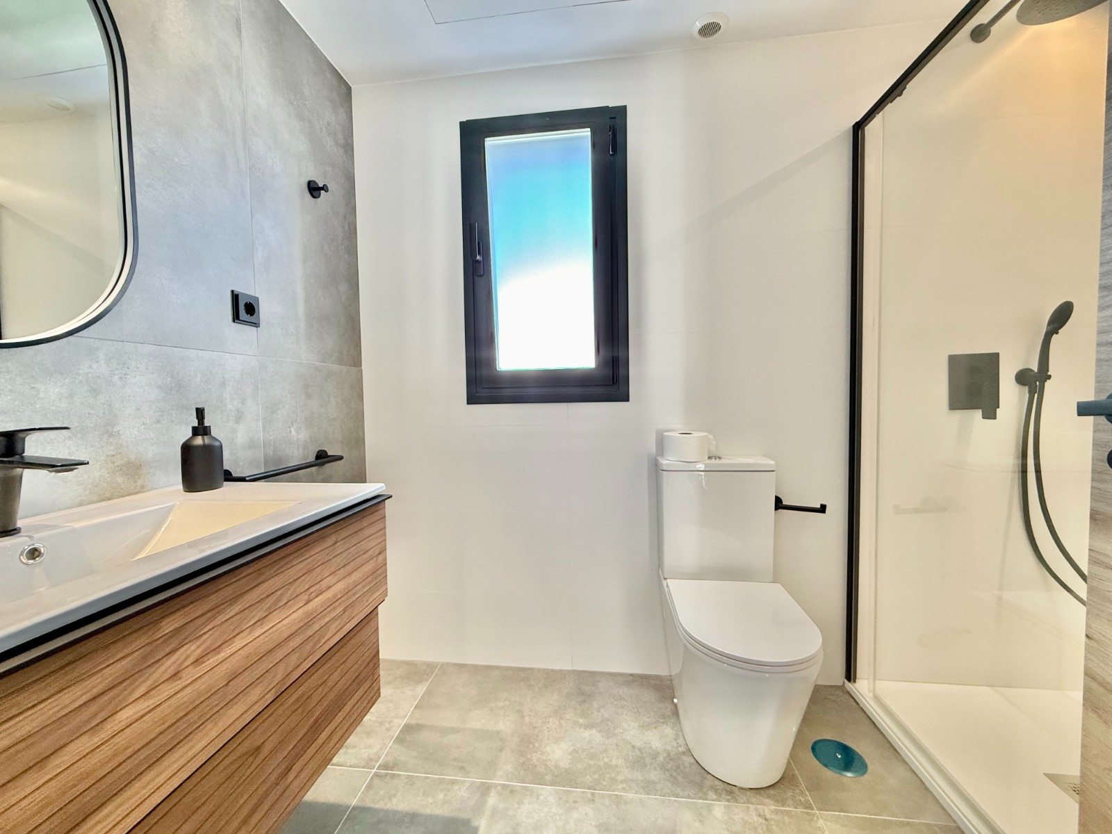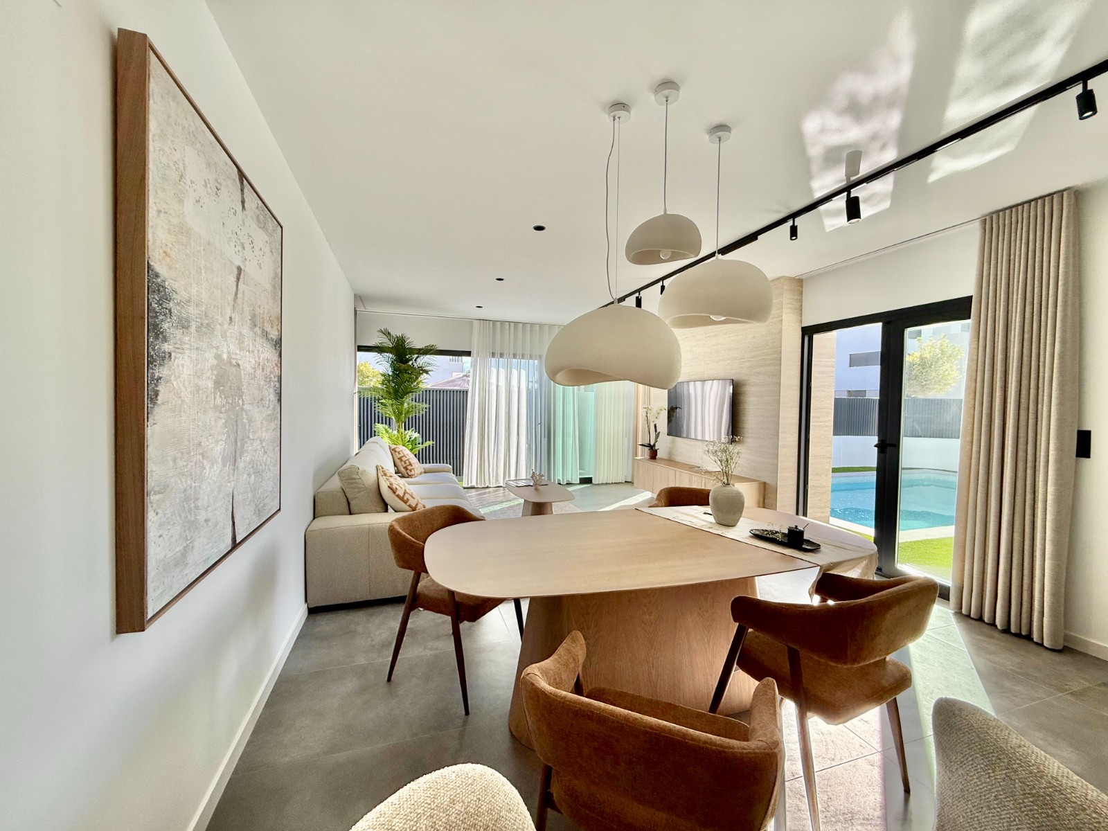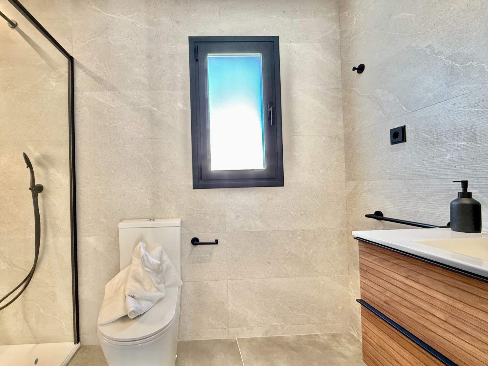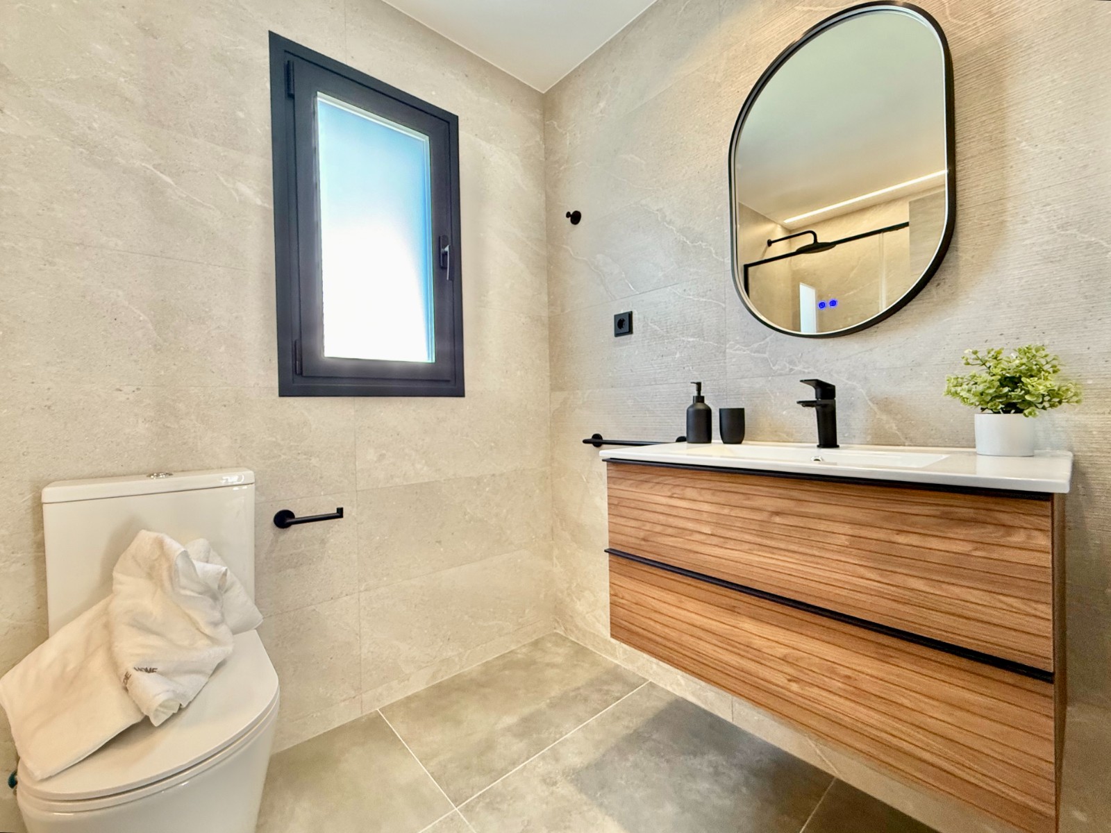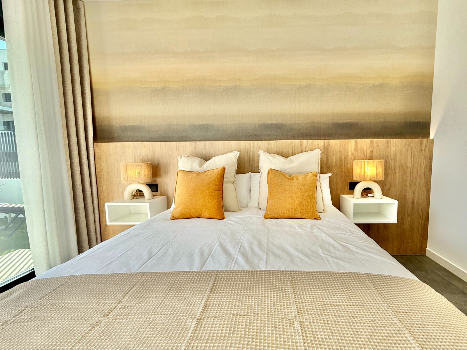 La propiedad cuenta con 140 m² en planta principal distribuidos en un gran salón con cocina integrada, recibidor independiente, tres dormitorios con armarios empotrados y dos baños completos, uno de ellos en suite con vestidor. Destaca la calidad de sus acabados y la elegante combinación de carpintería en blanco y roble.