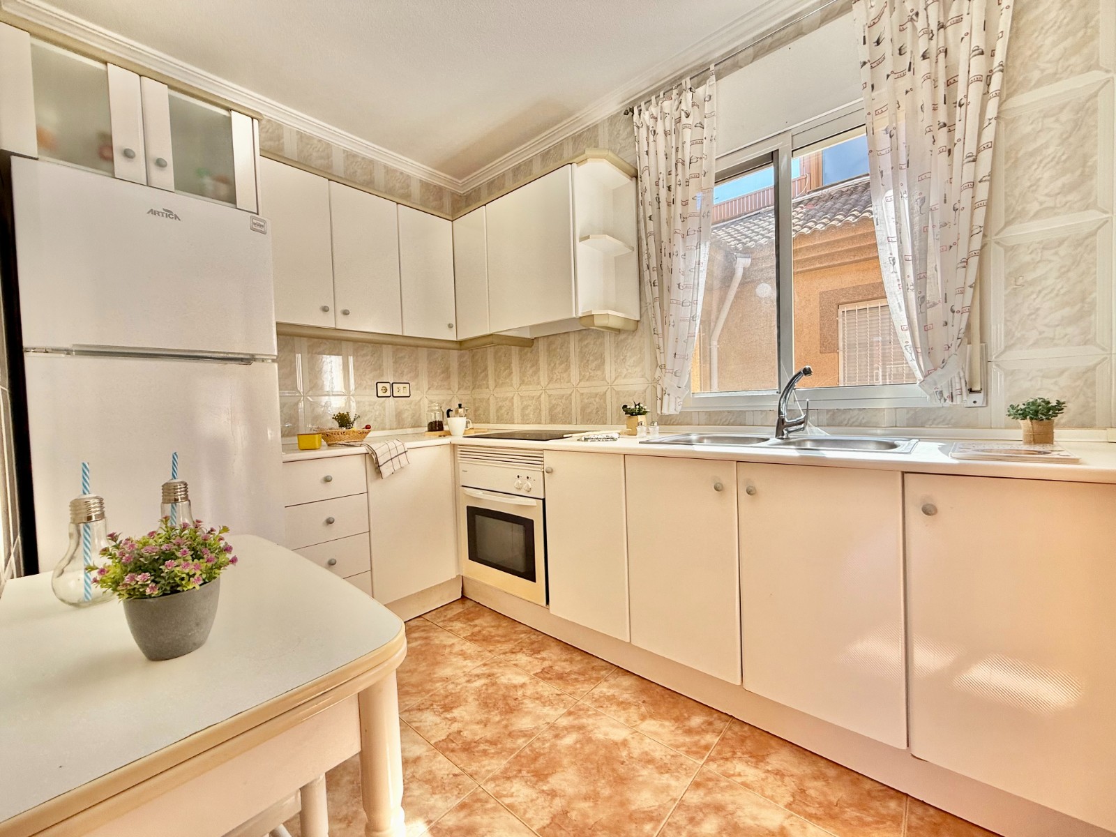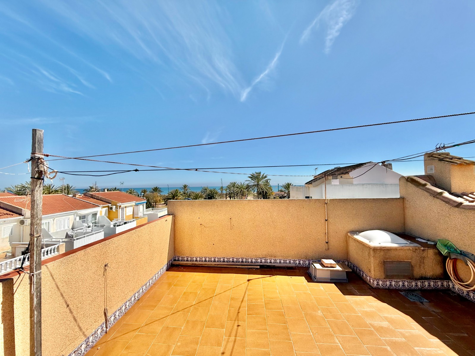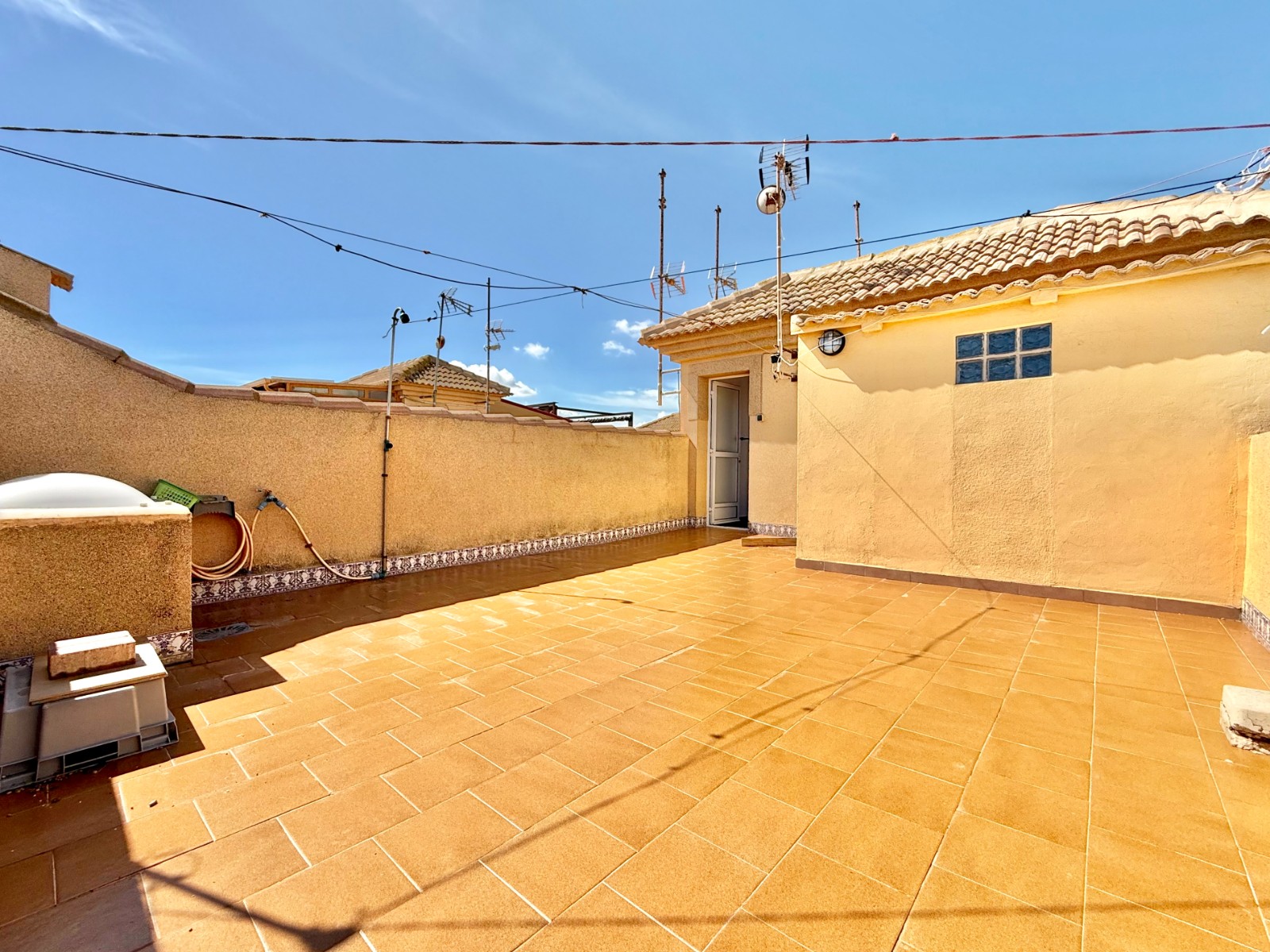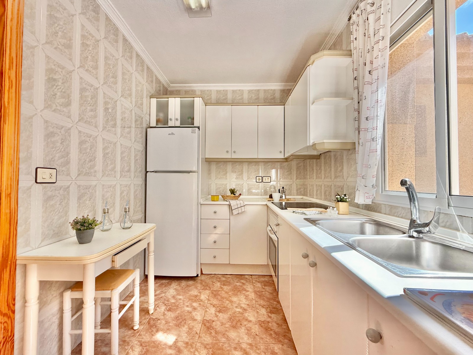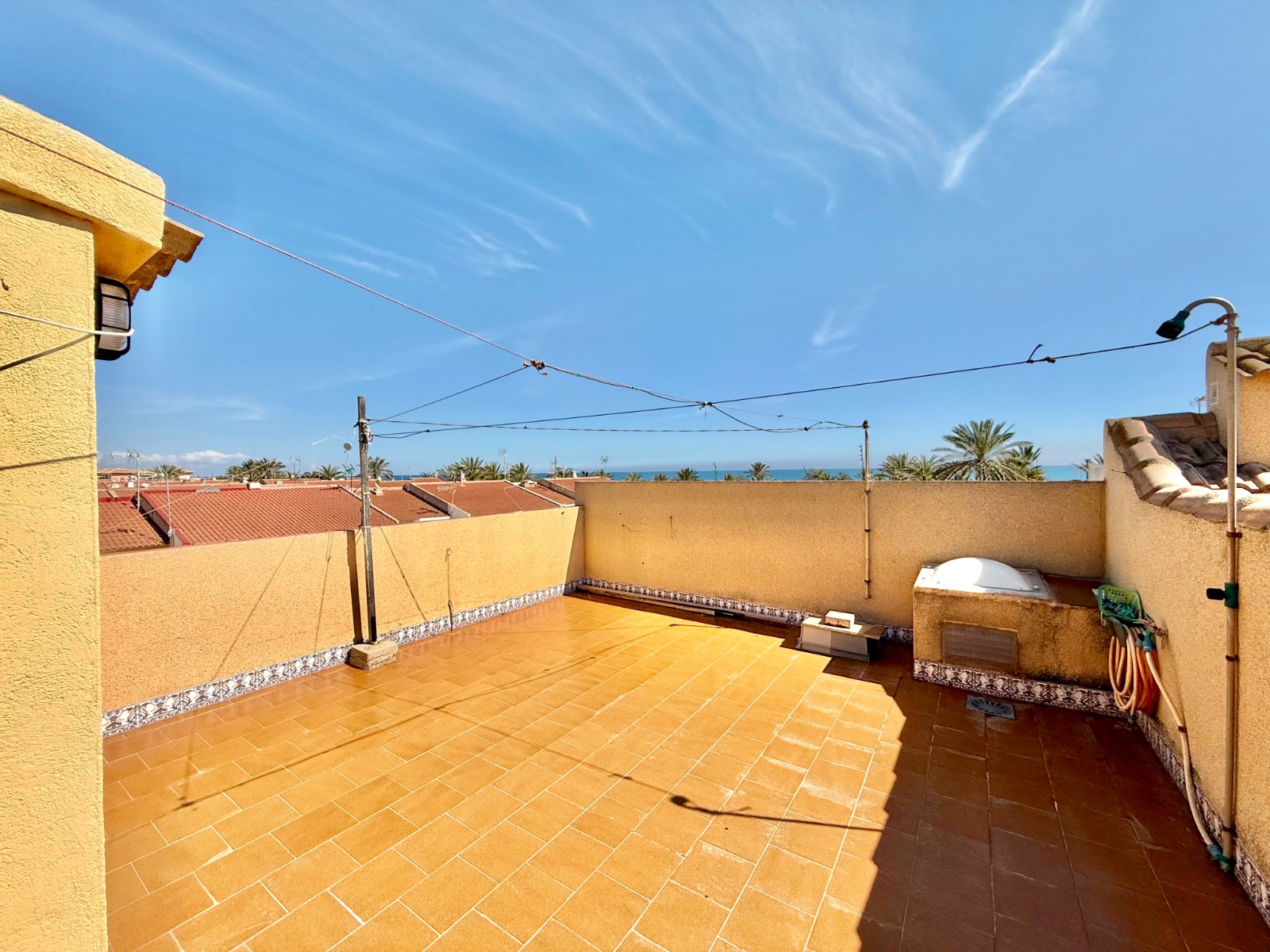Bungalow en planta alta con terraza de acceso, solarium, salón comedor con cocina, 2 habitaciones dobles y 1 baño con ducha.