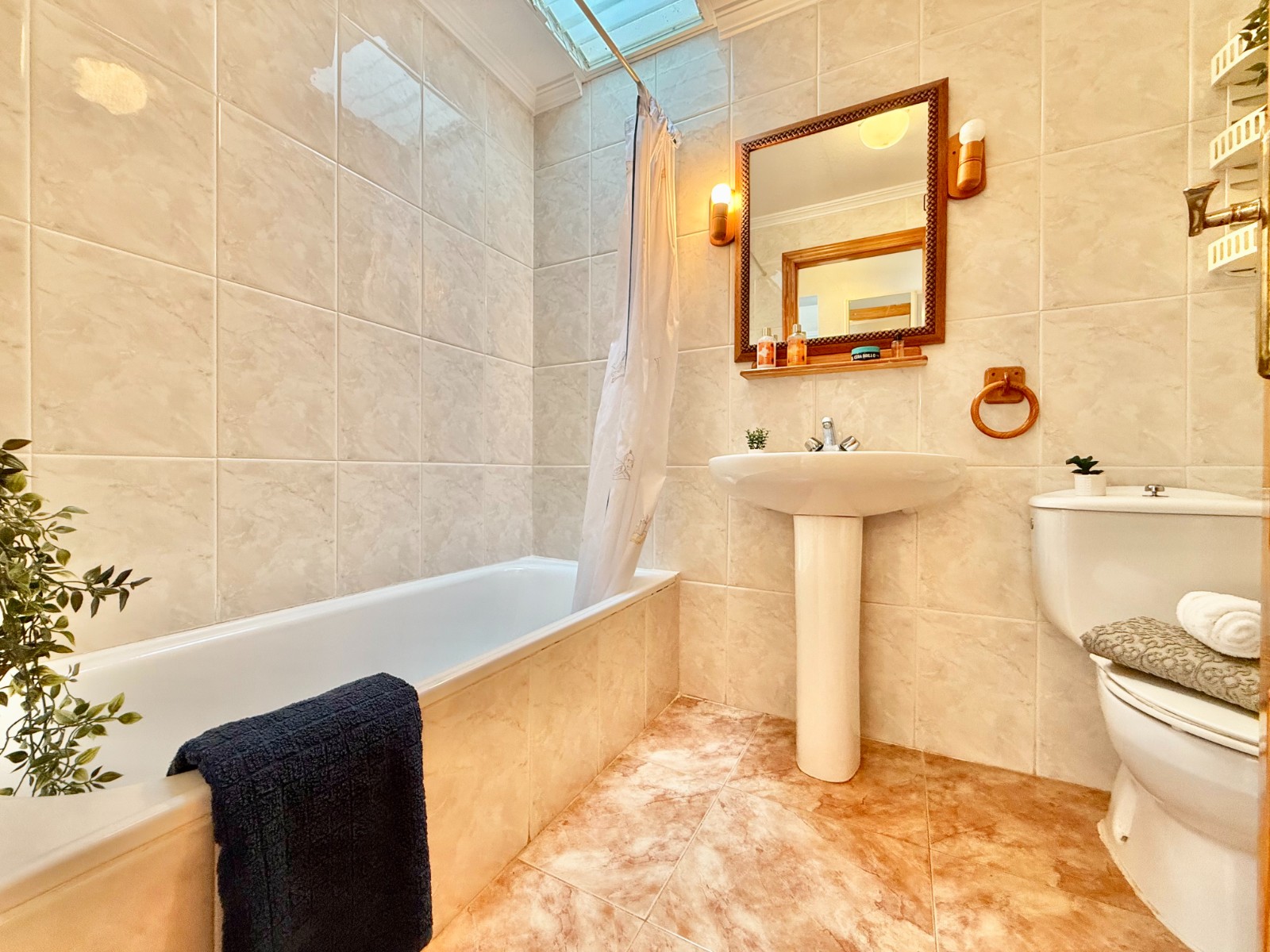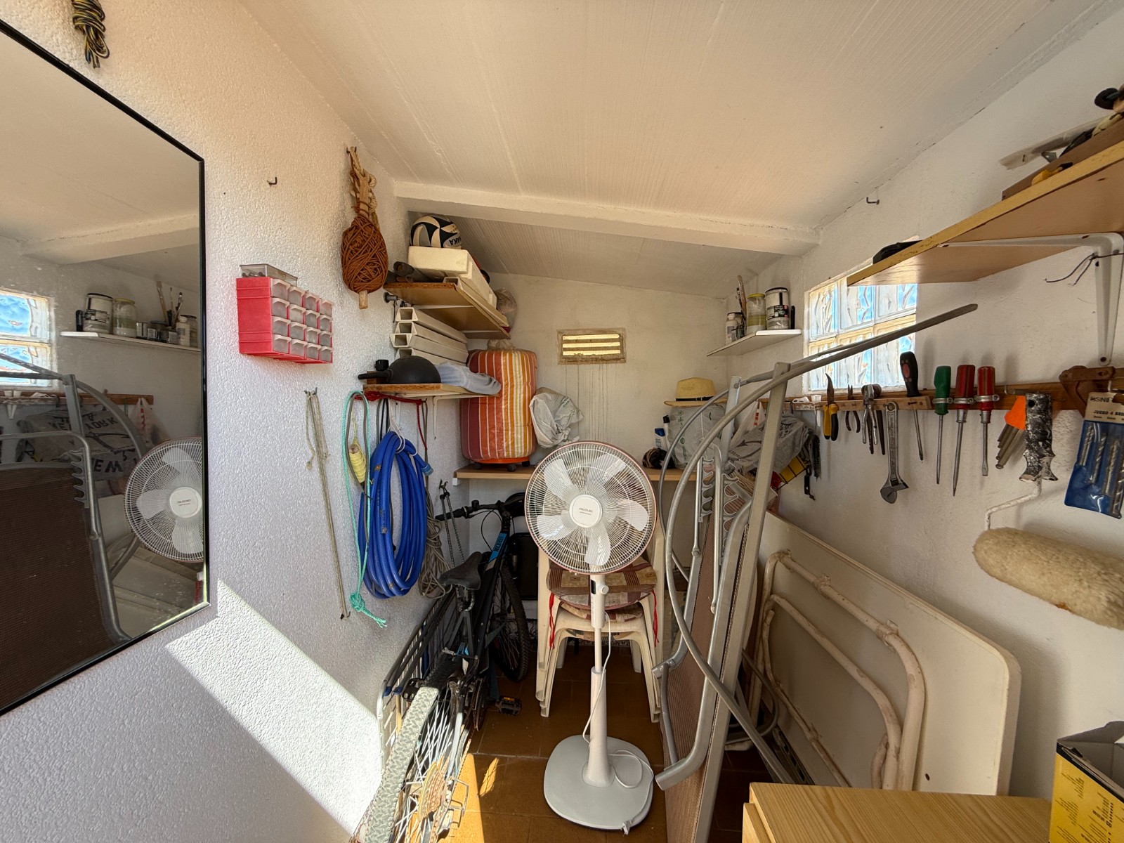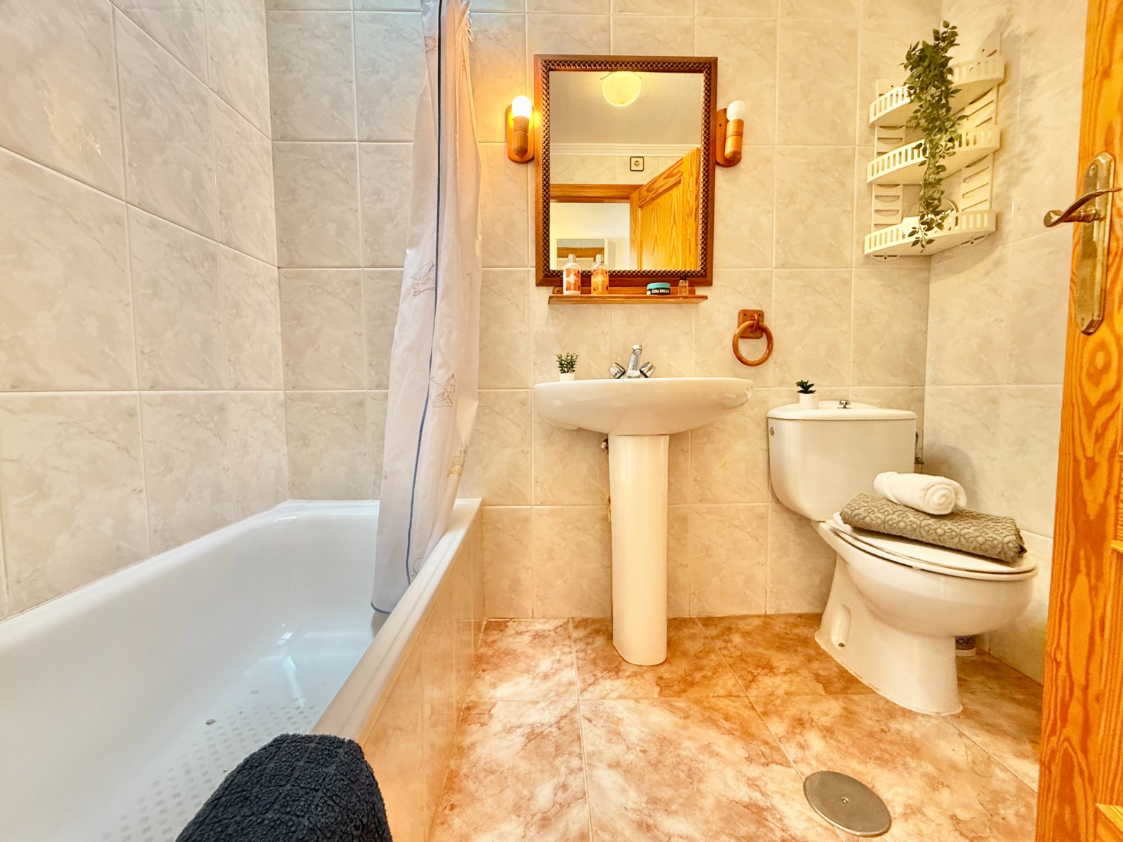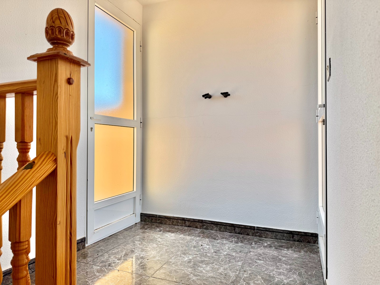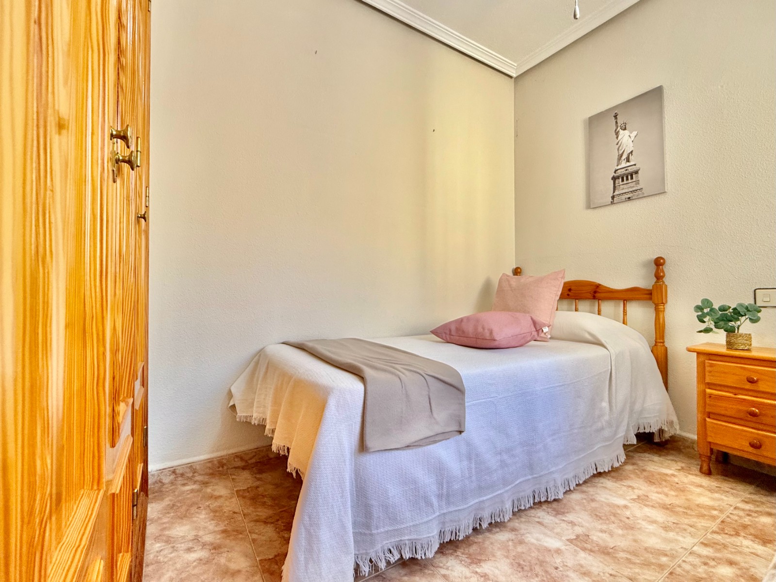 Bungalow en planta alta con terraza de acceso, solarium, salón comedor con cocina, 2 habitaciones dobles y 1 baño con ducha.