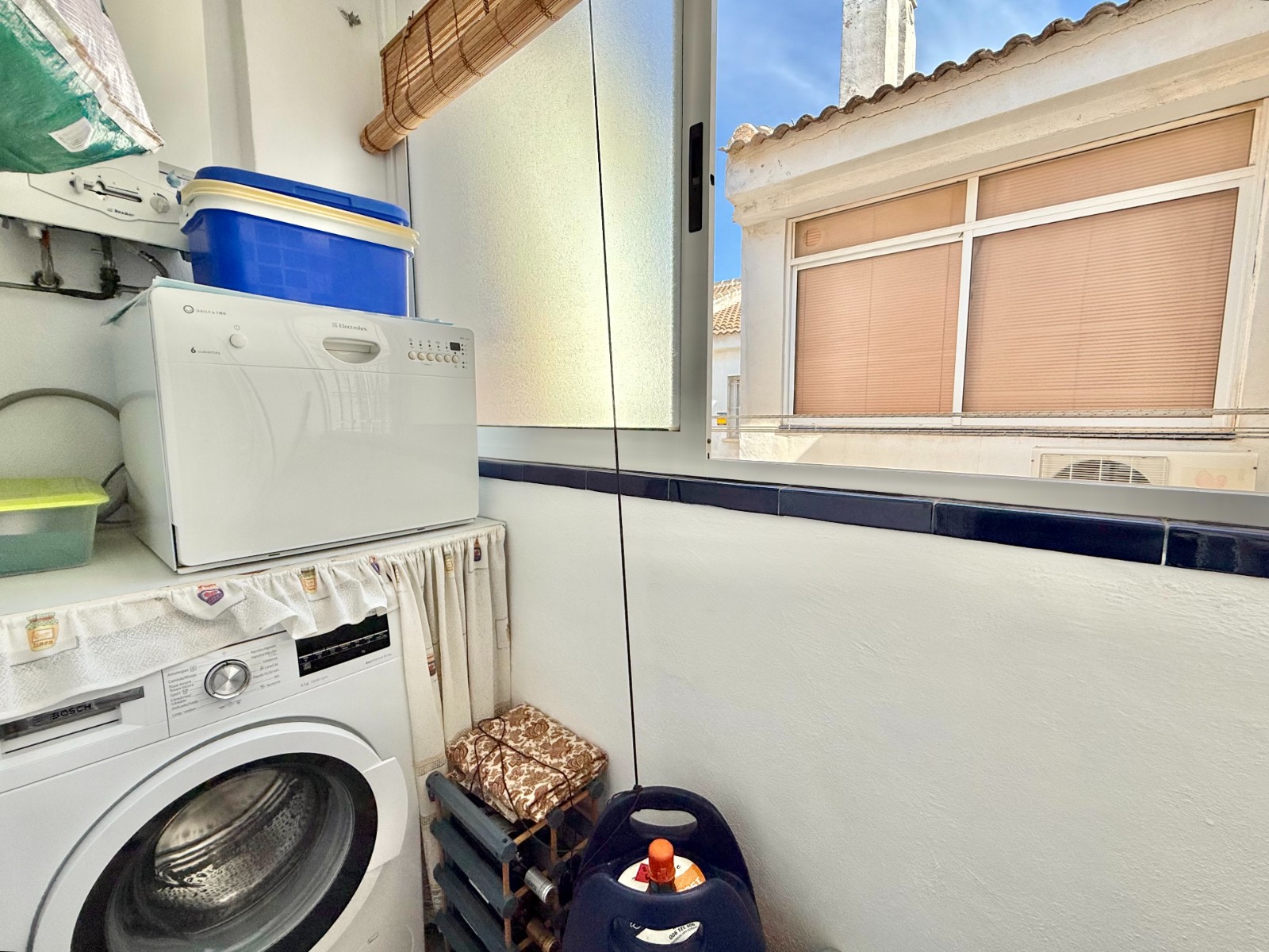 Bungalow de 2 dormitorios con una terraza delantera y lavadero.