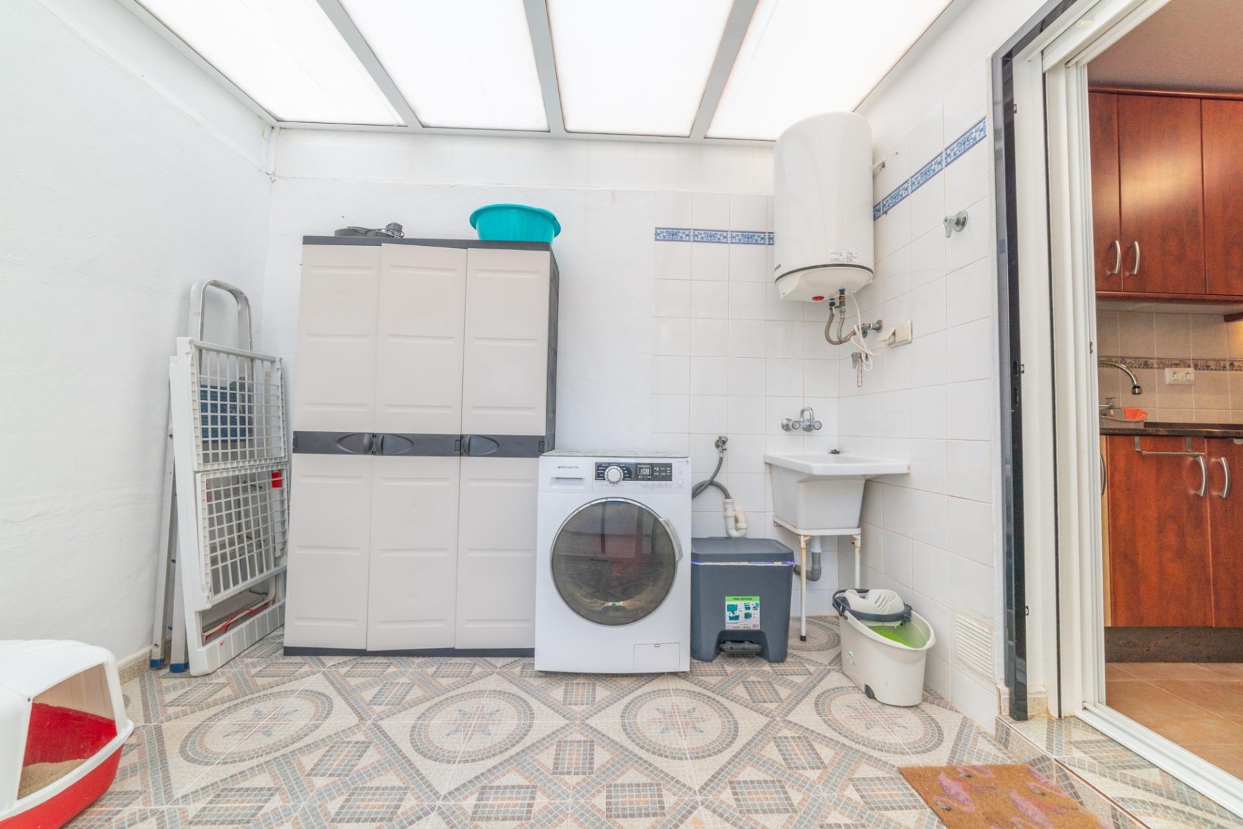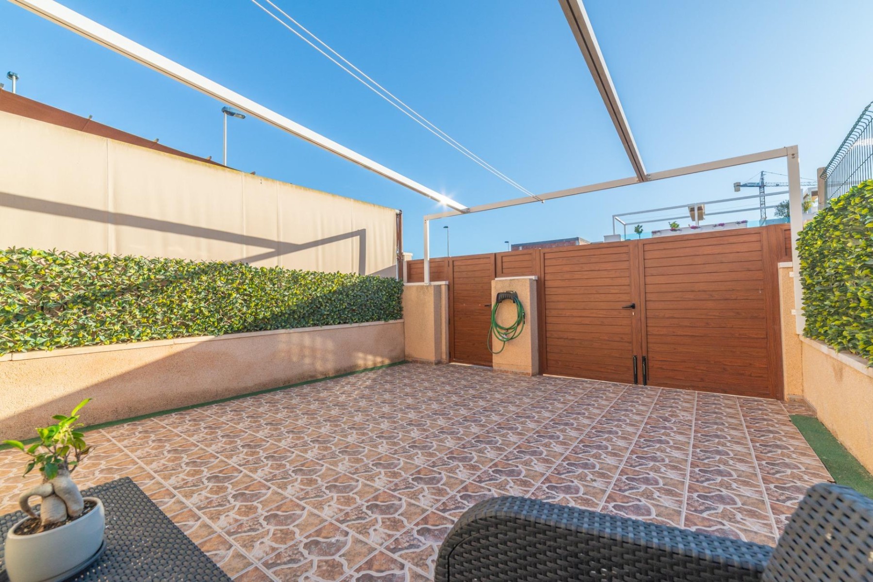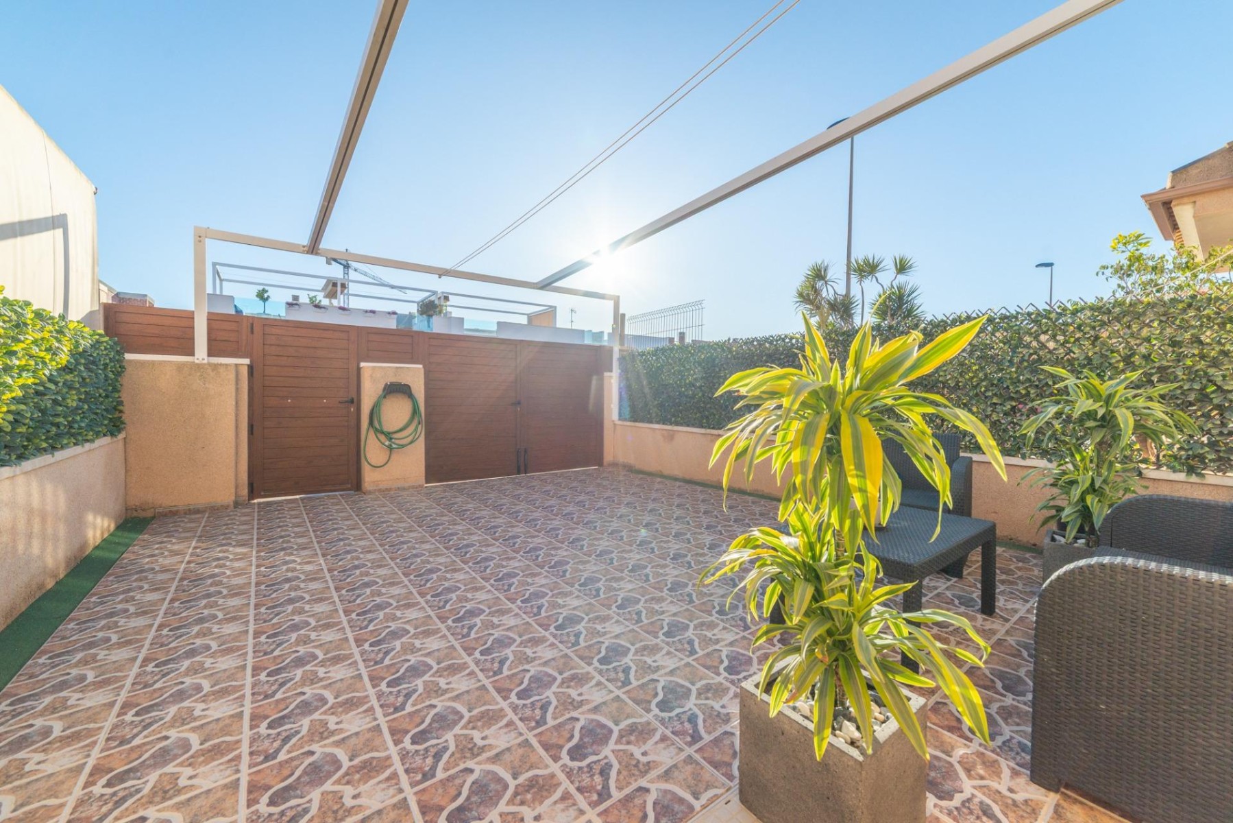 Entramos al porche delantero con la orientación más luminosa que puedas encontrar en la zona, entra el vehículo, de hecho, contamos con puerta para darle acceso, así como de toldo para no ponernos morenos antes de llegar al verano.