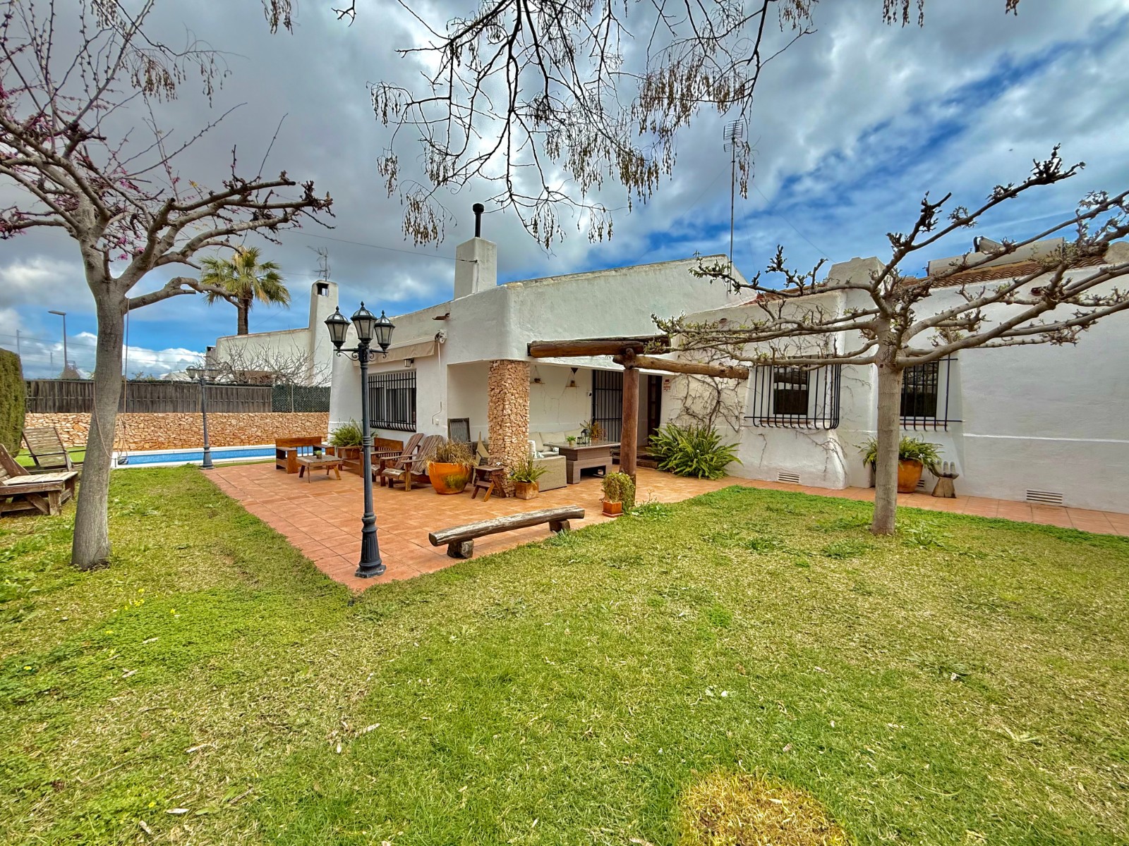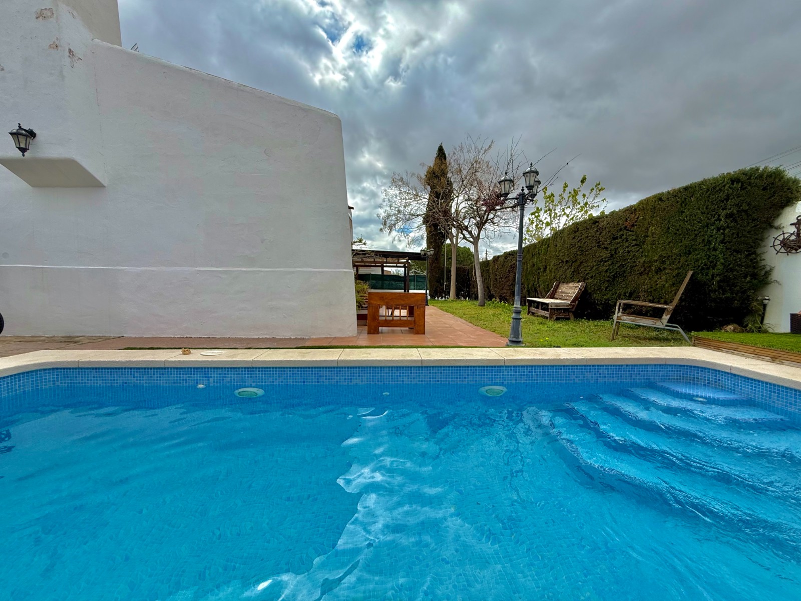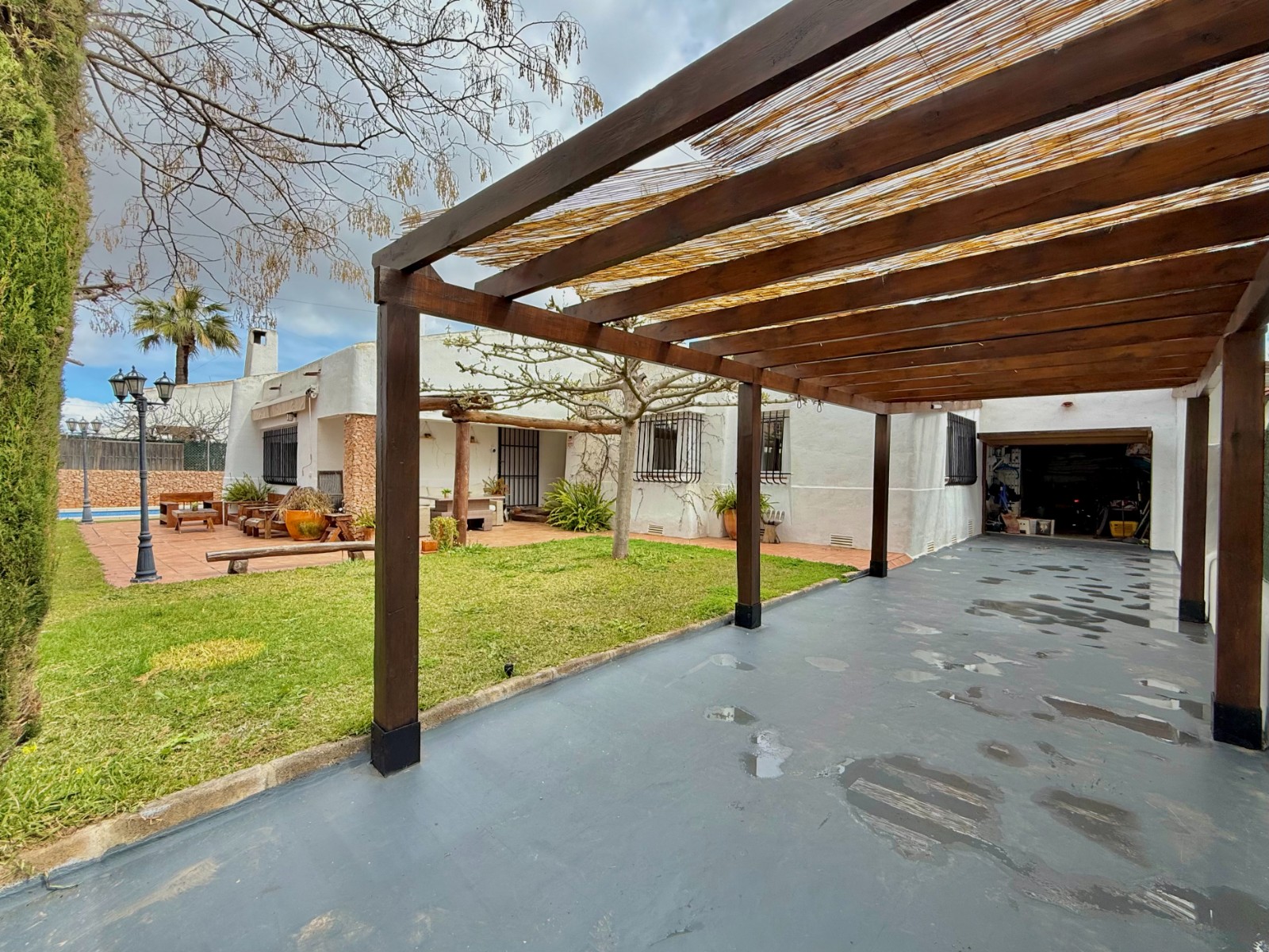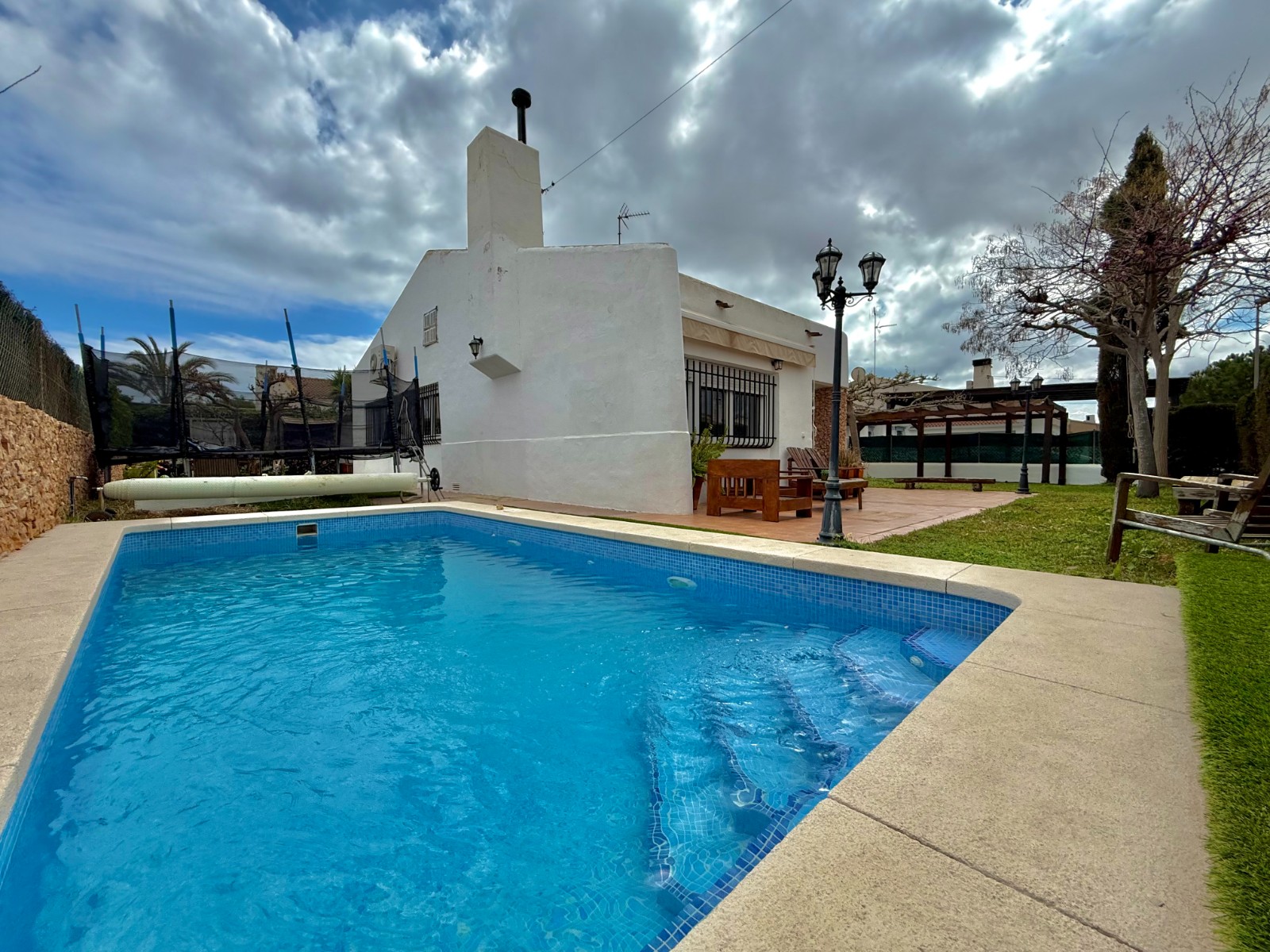 El patio incluye un trastero/lavadero con acceso desde el garaje, que tiene capacidad para un coche con espacio para ampliar. La vivienda dispone de piscina privada, jardín y orientación oeste, además de aire acondicionado, calefacción individual y fontanería y electricidad renovadas hace 8 años. Existe la posibilidad de construir una segunda planta.