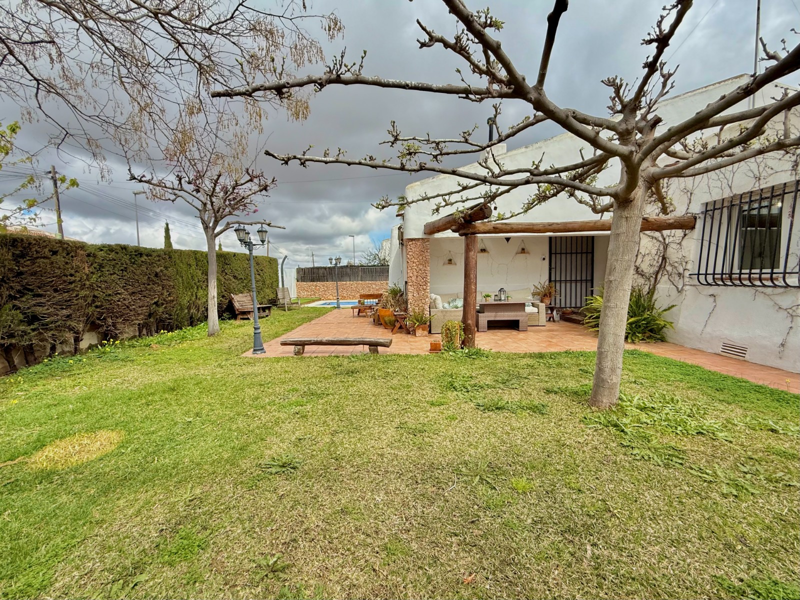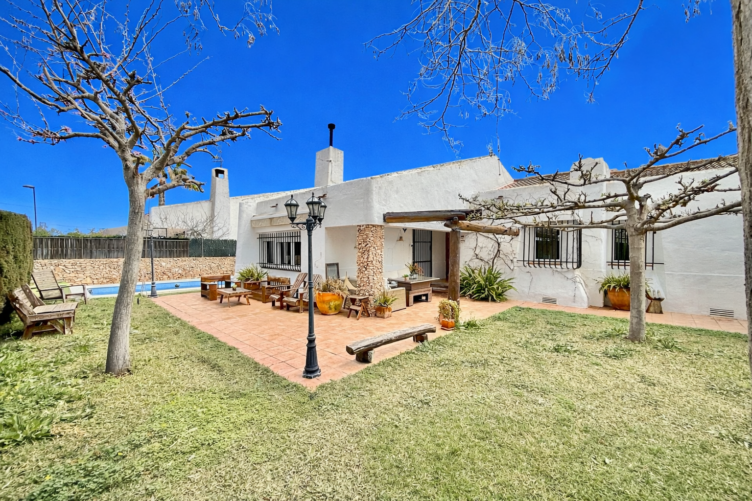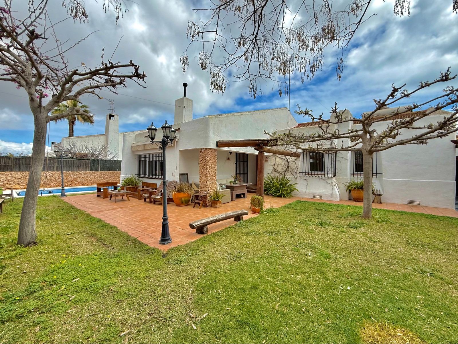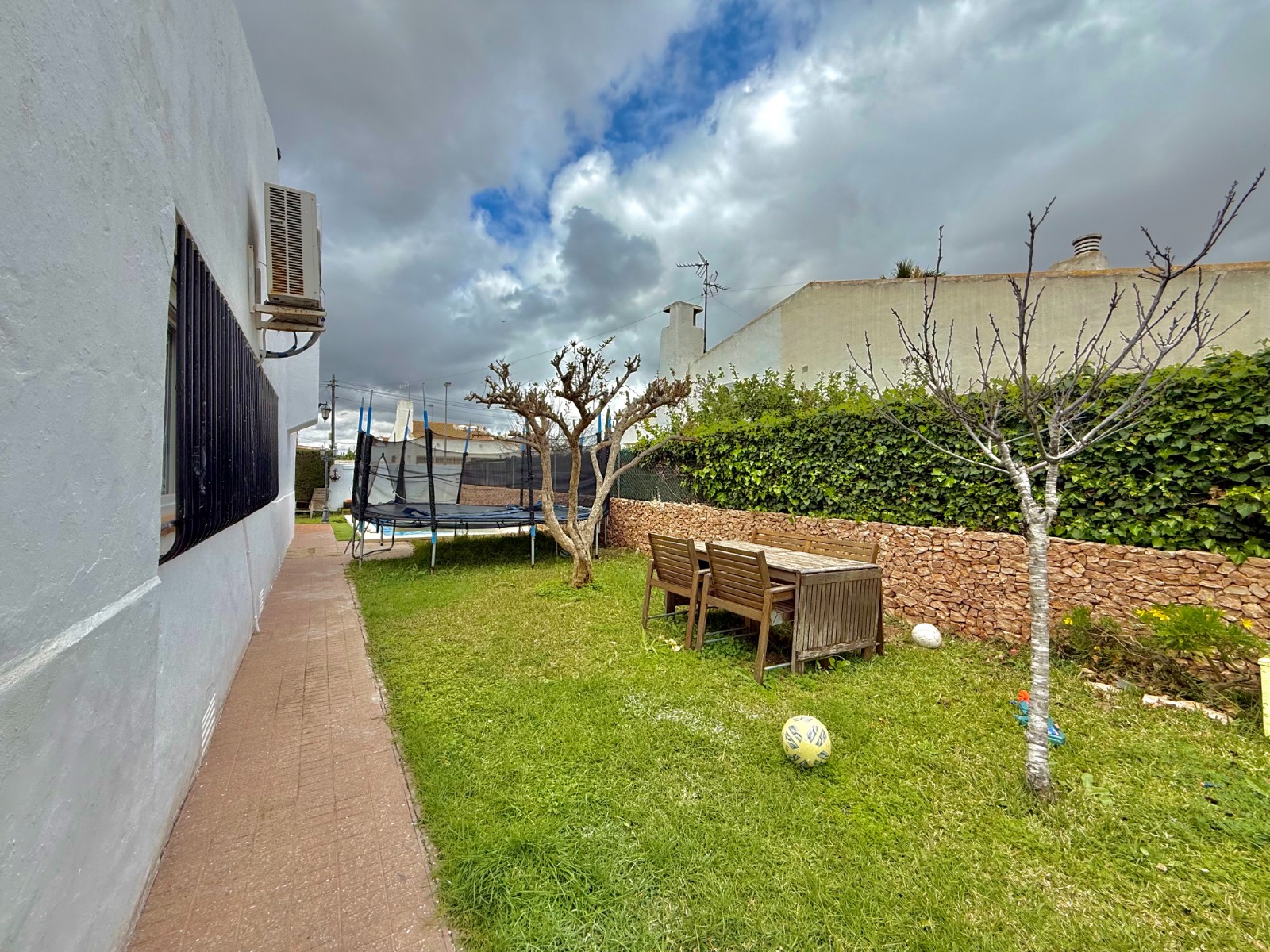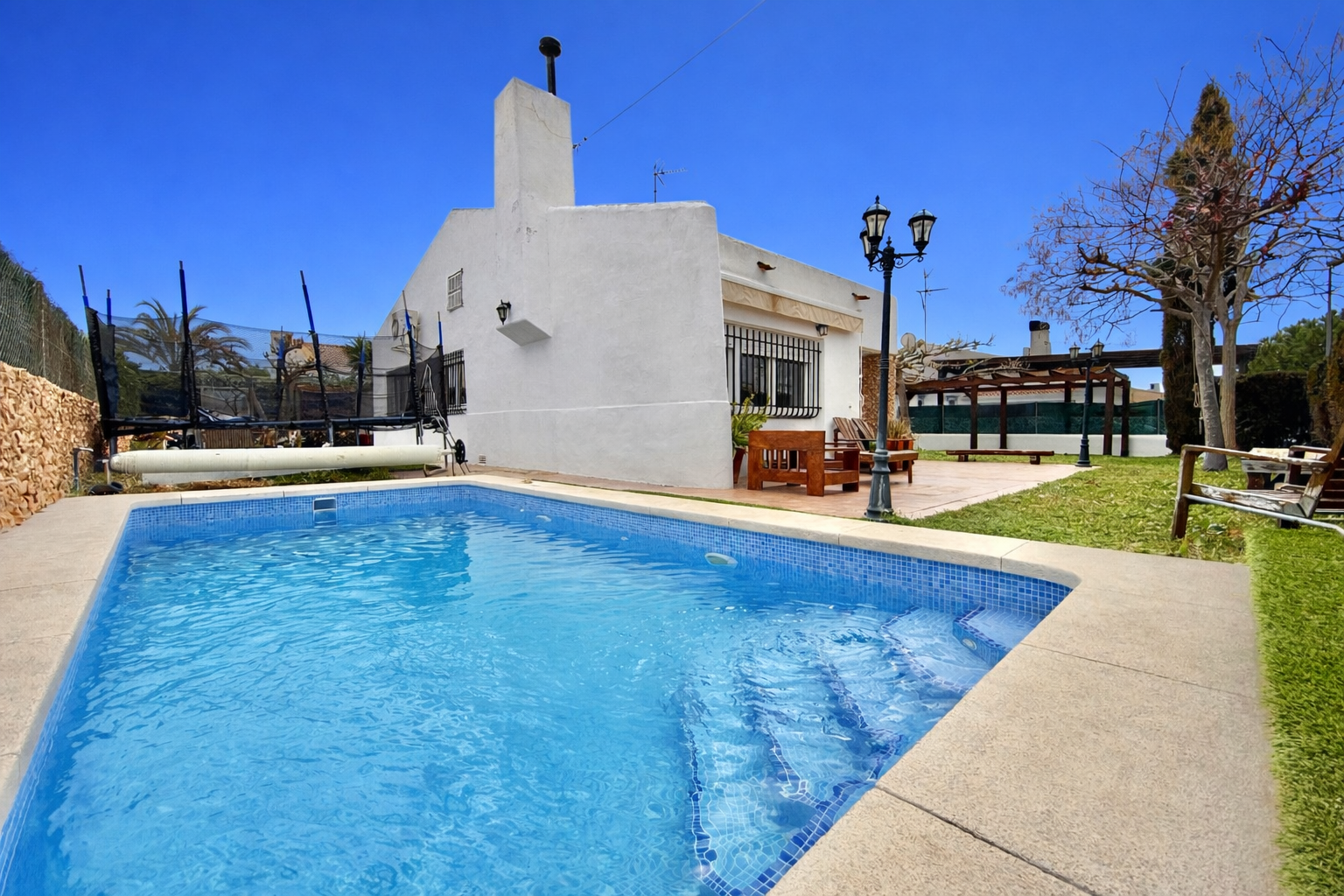 El patio incluye un trastero/lavadero con acceso desde el garaje, que tiene capacidad para un coche con espacio para ampliar. La vivienda dispone de piscina privada, jardín y orientación oeste, además de aire acondicionado, calefacción individual y fontanería y electricidad renovadas hace 8 años. Existe la posibilidad de construir una segunda planta.