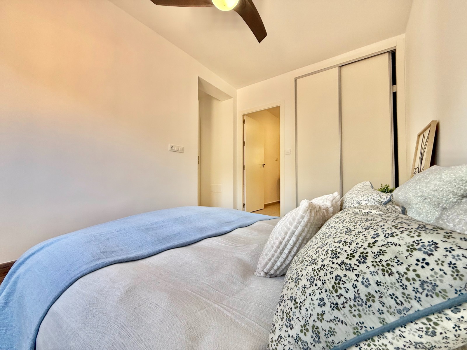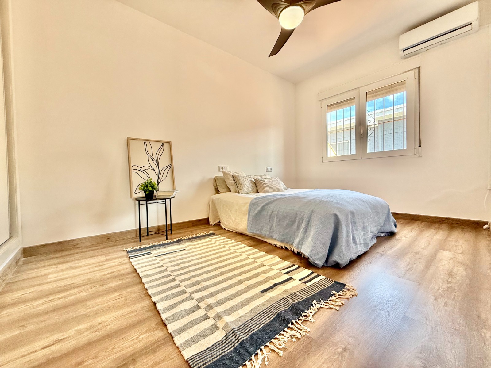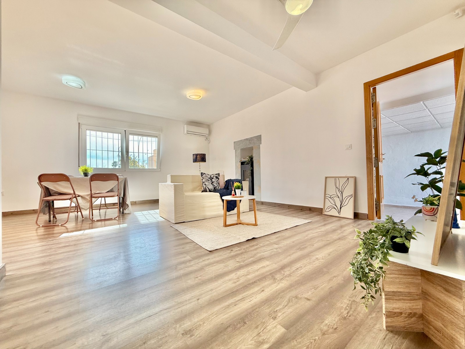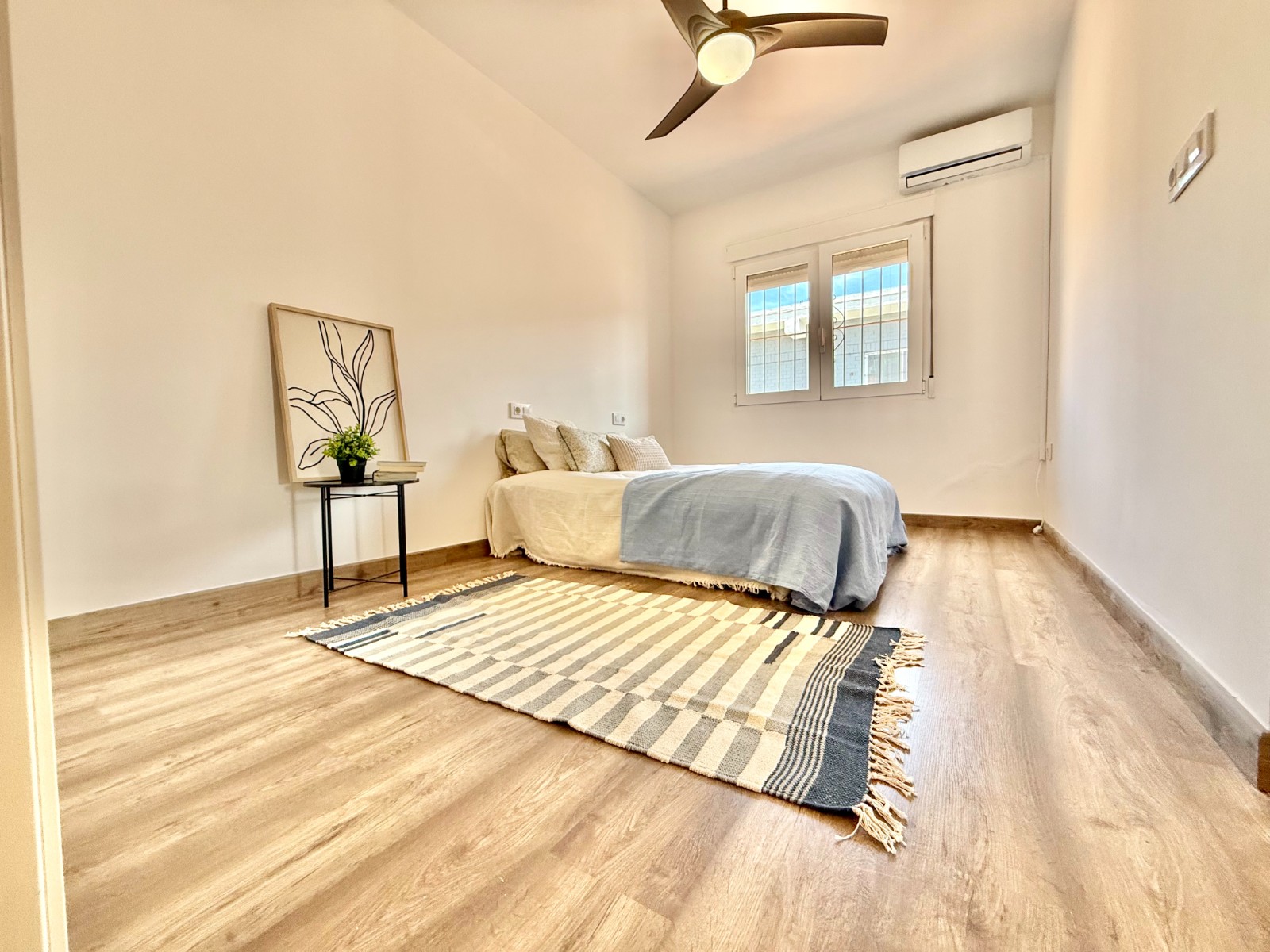 Dispone de 3 dormitorios y 2 baños, uno de ellos en suite en el dormitorio principal. Cuenta con un amplio salón con múltiples posibilidades de distribución, cocina independiente con opción de integrarla al espacio principal, suelos laminados imitación madera, carpintería blanca, aire acondicionado y ventanas oscilobatientes con mosquiteras.