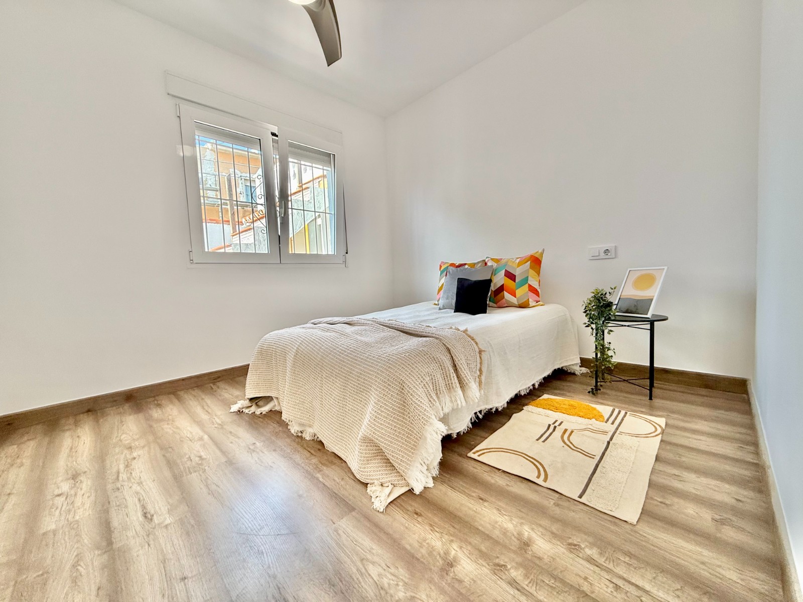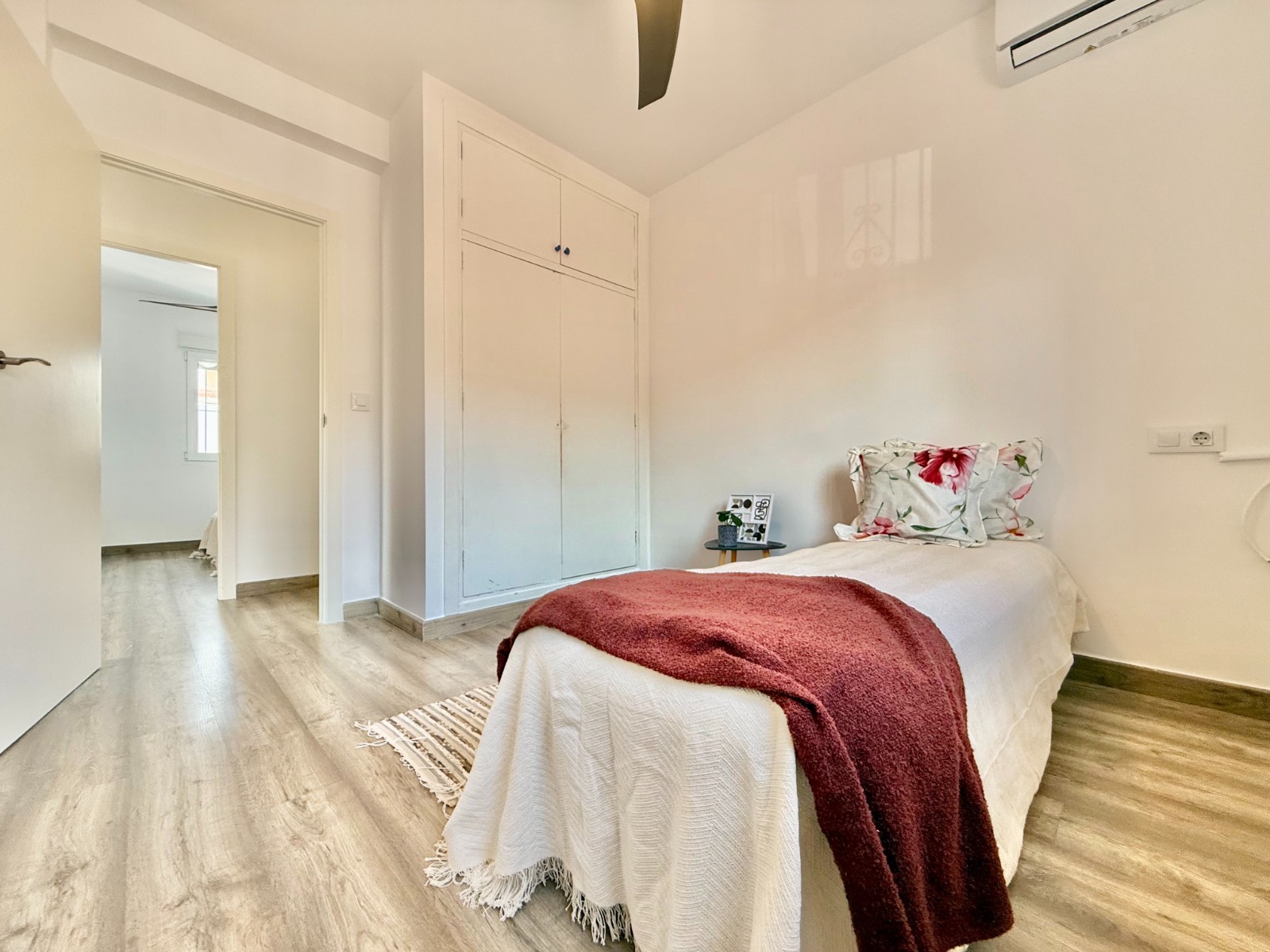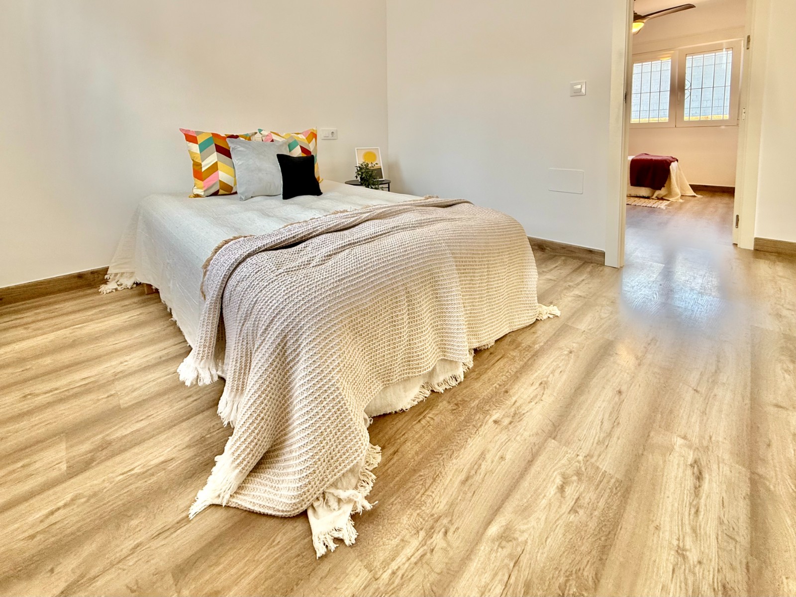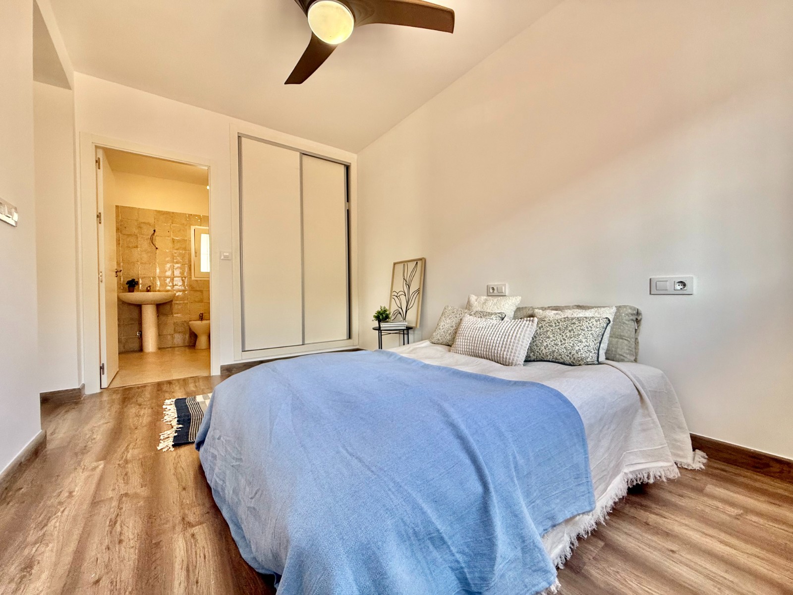 Dispone de 3 dormitorios y 2 baños, uno de ellos en suite en el dormitorio principal. Cuenta con un amplio salón con múltiples posibilidades de distribución, cocina independiente con opción de integrarla al espacio principal, suelos laminados imitación madera, carpintería blanca, aire acondicionado y ventanas oscilobatientes con mosquiteras.