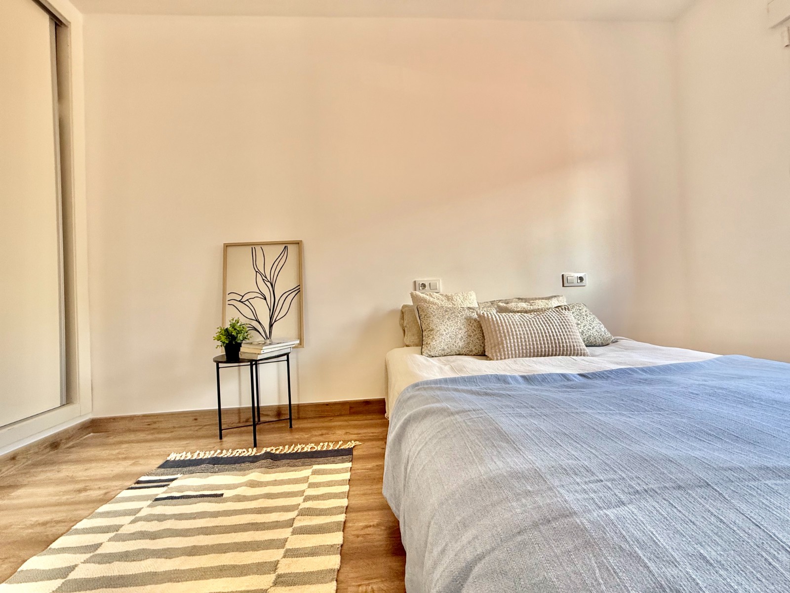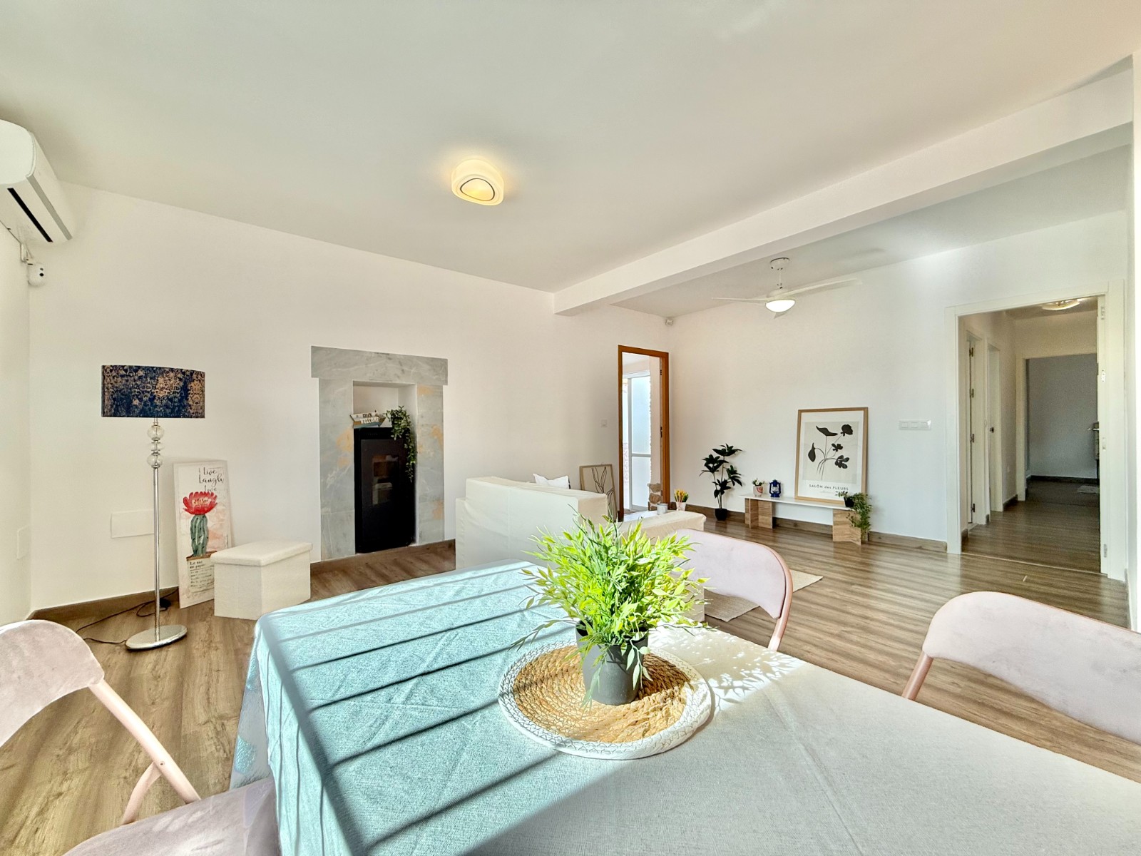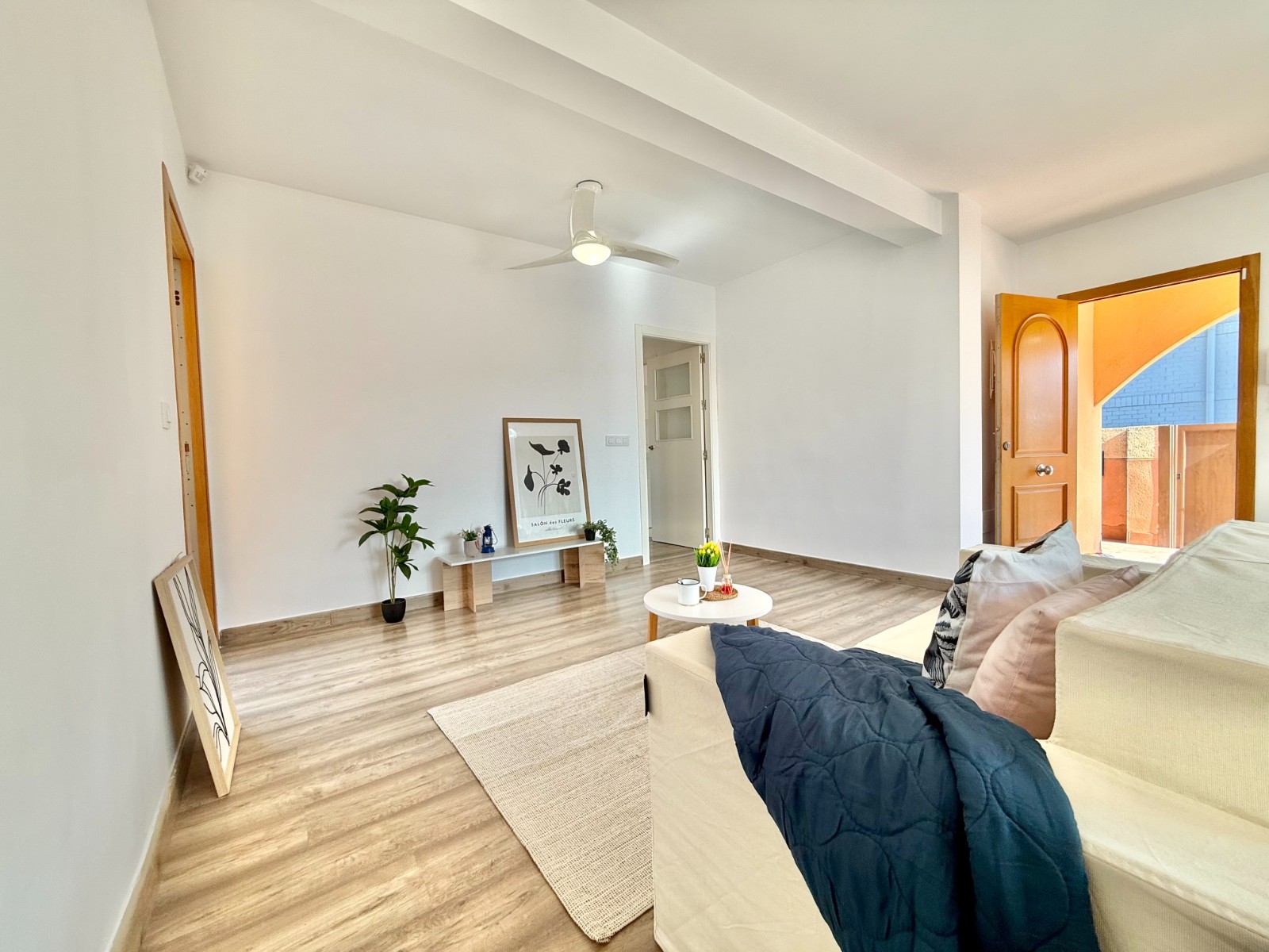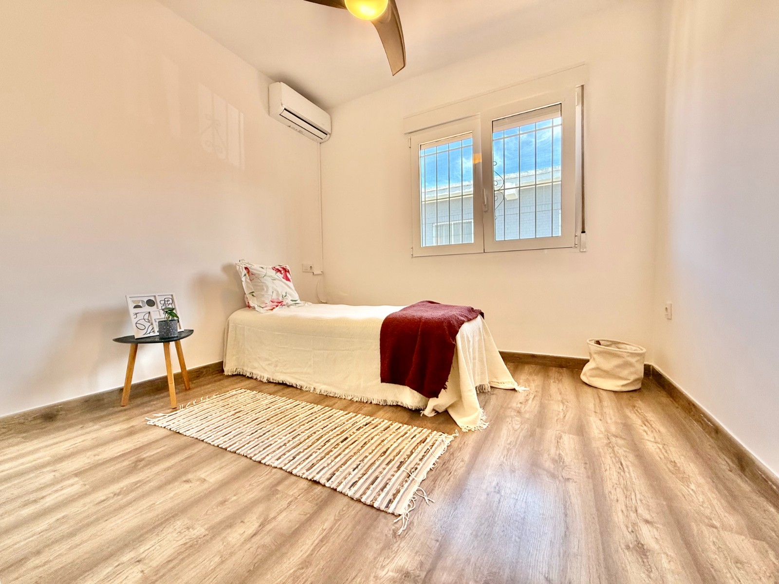 Dispone de 3 dormitorios y 2 baños, uno de ellos en suite en el dormitorio principal. Cuenta con un amplio salón con múltiples posibilidades de distribución, cocina independiente con opción de integrarla al espacio principal, suelos laminados imitación madera, carpintería blanca, aire acondicionado y ventanas oscilobatientes con mosquiteras.