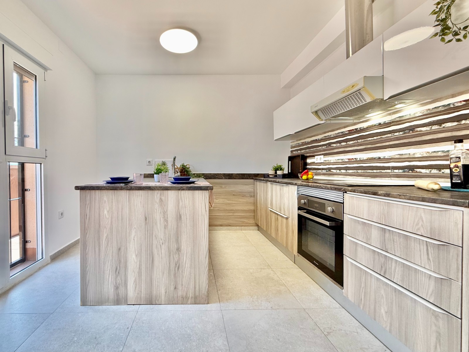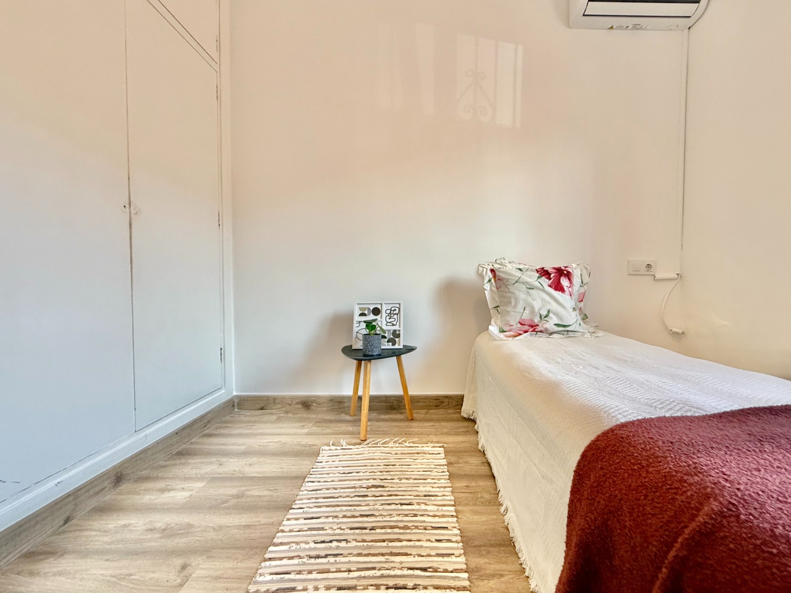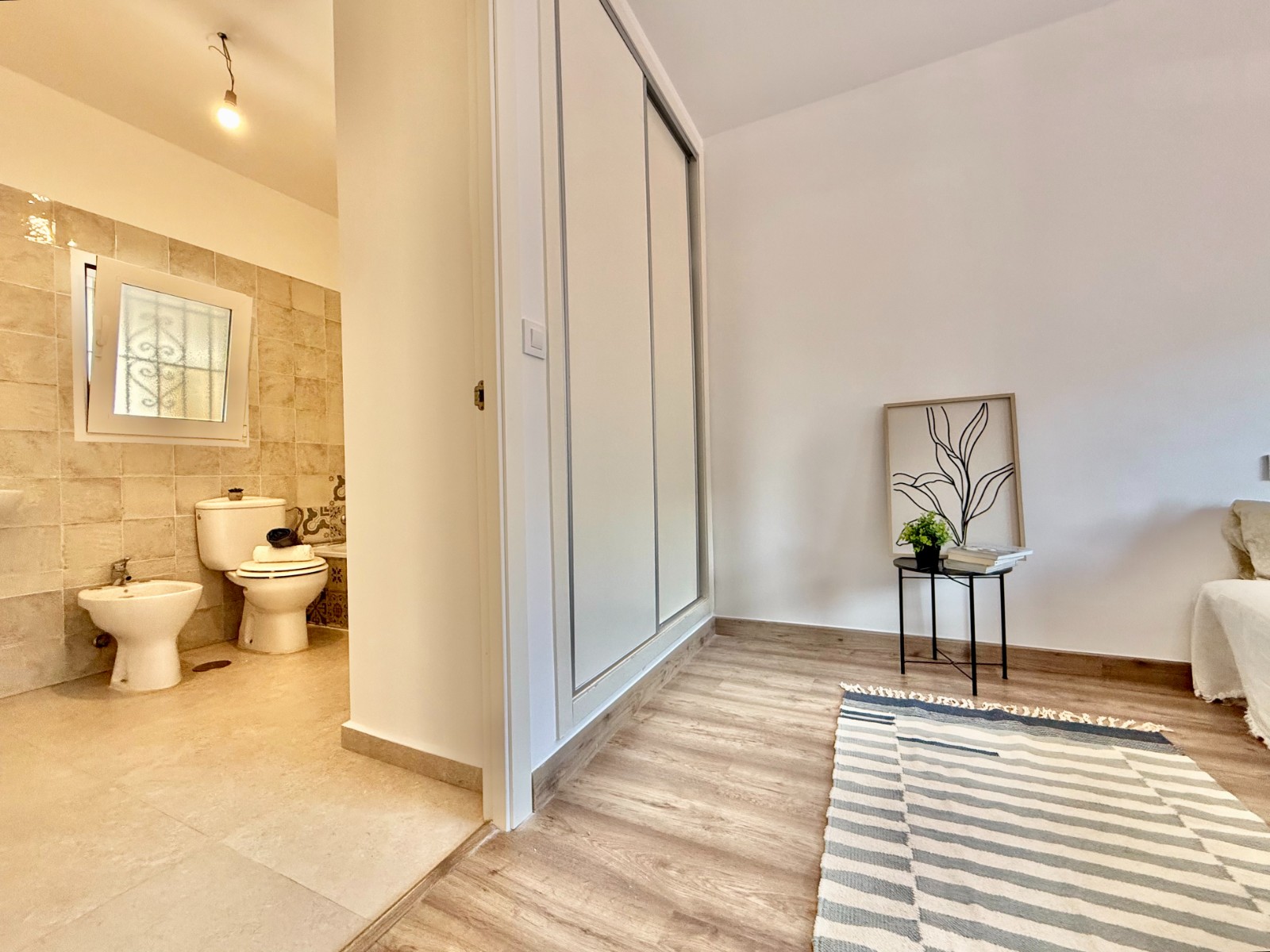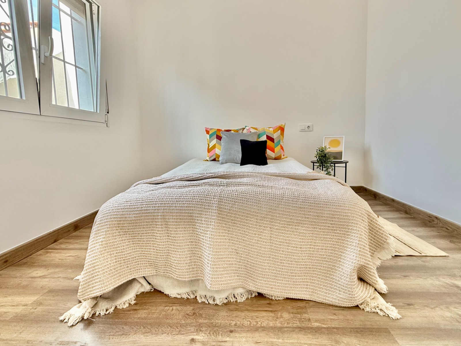 Dispone de 3 dormitorios y 2 baños, uno de ellos en suite en el dormitorio principal. Cuenta con un amplio salón con múltiples posibilidades de distribución, cocina independiente con opción de integrarla al espacio principal, suelos laminados imitación madera, carpintería blanca, aire acondicionado y ventanas oscilobatientes con mosquiteras.