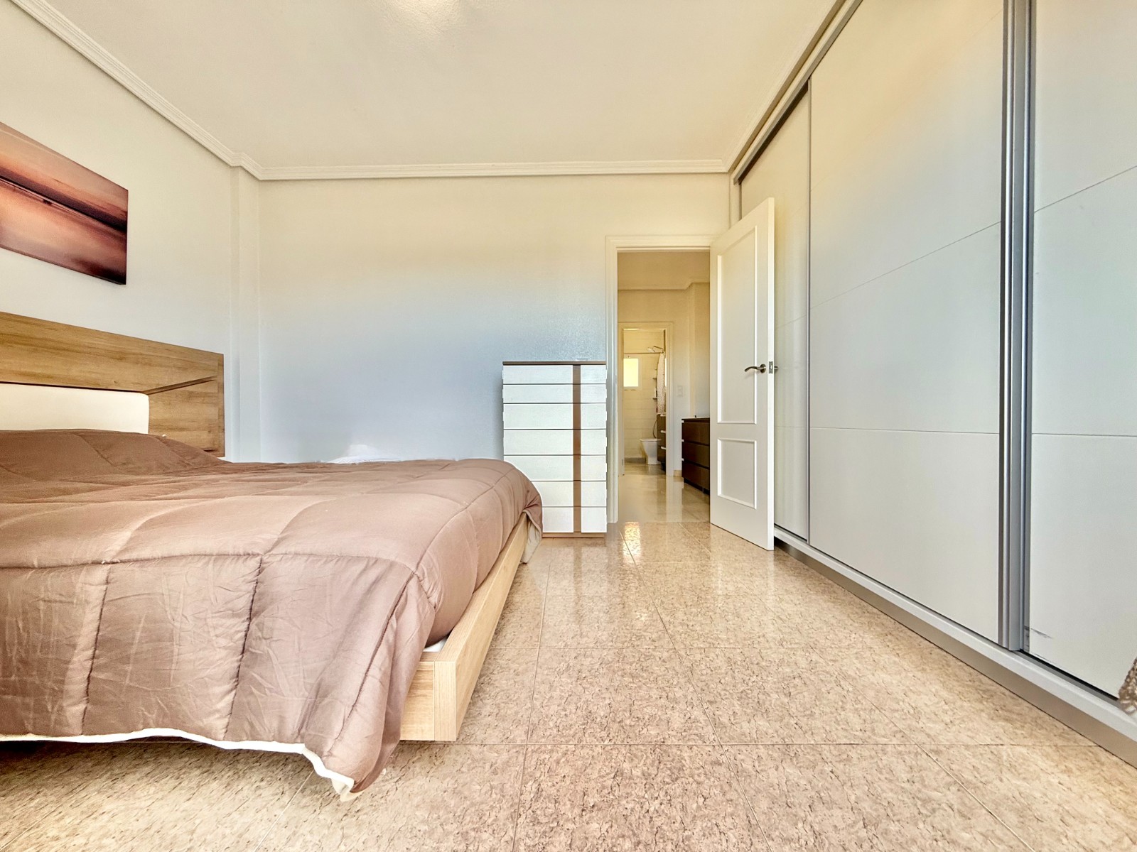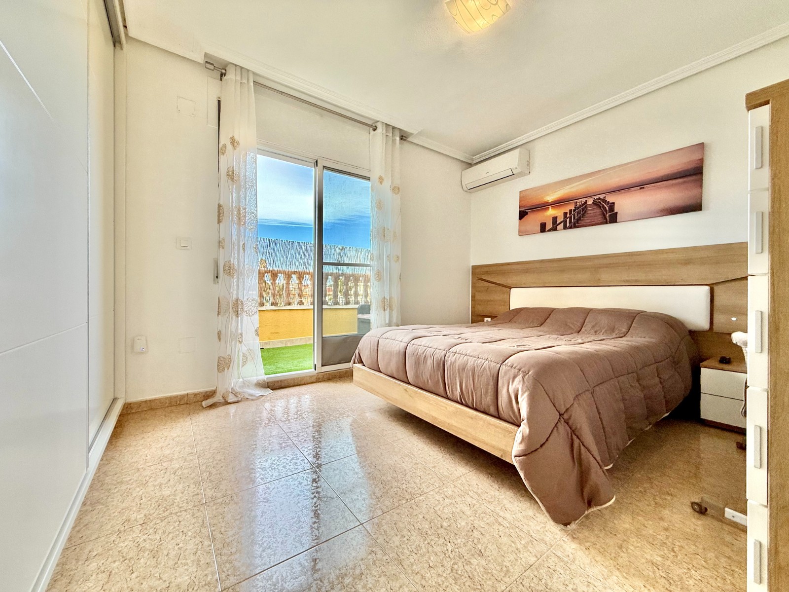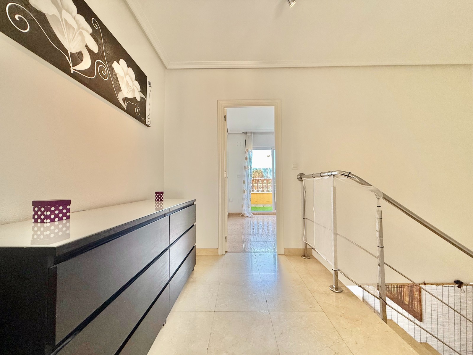En la planta superior, un elegante recibidor distribuye dos dormitorios, ambos con armarios empotrados y acceso a terraza, y un baño completo.