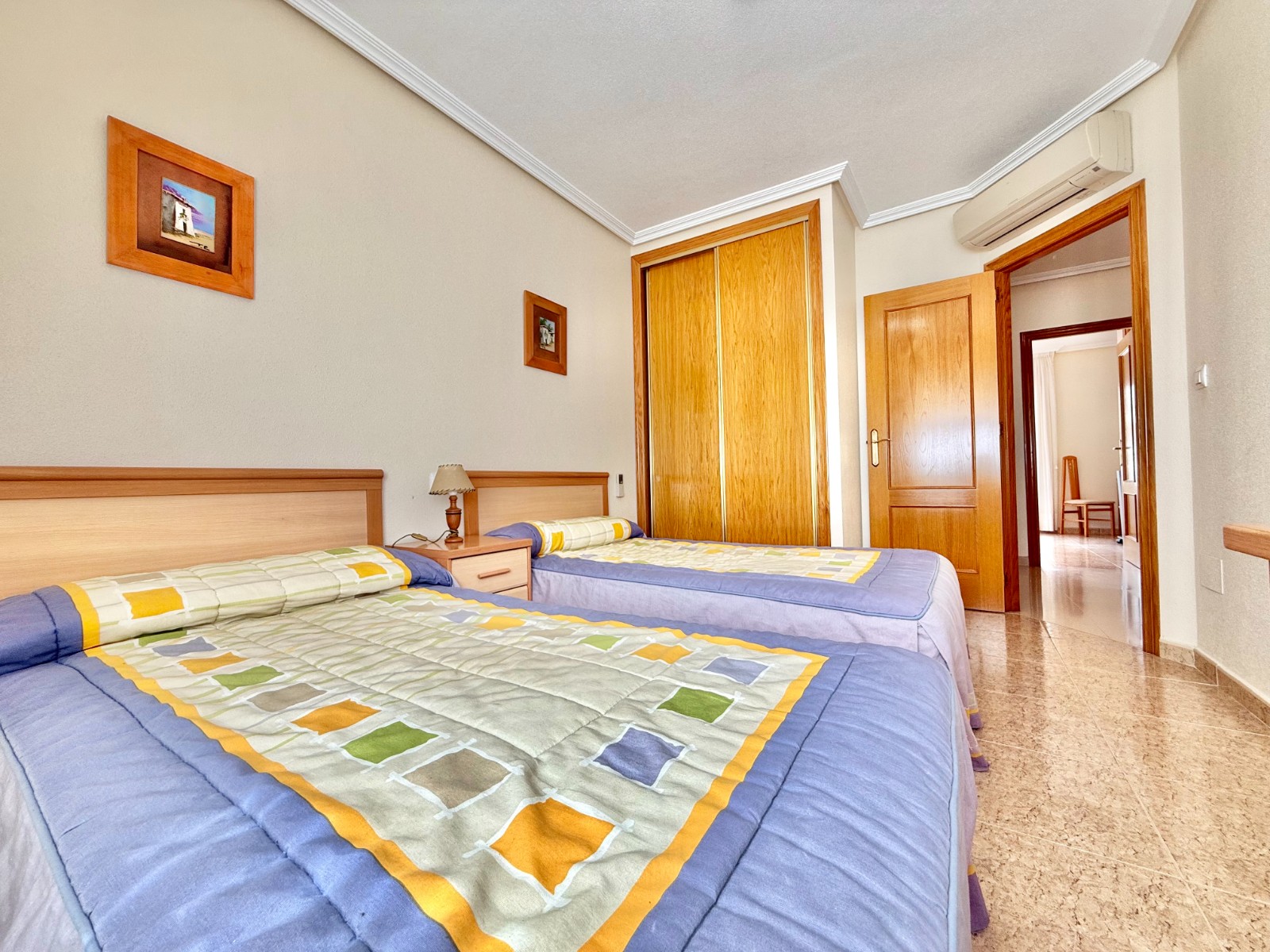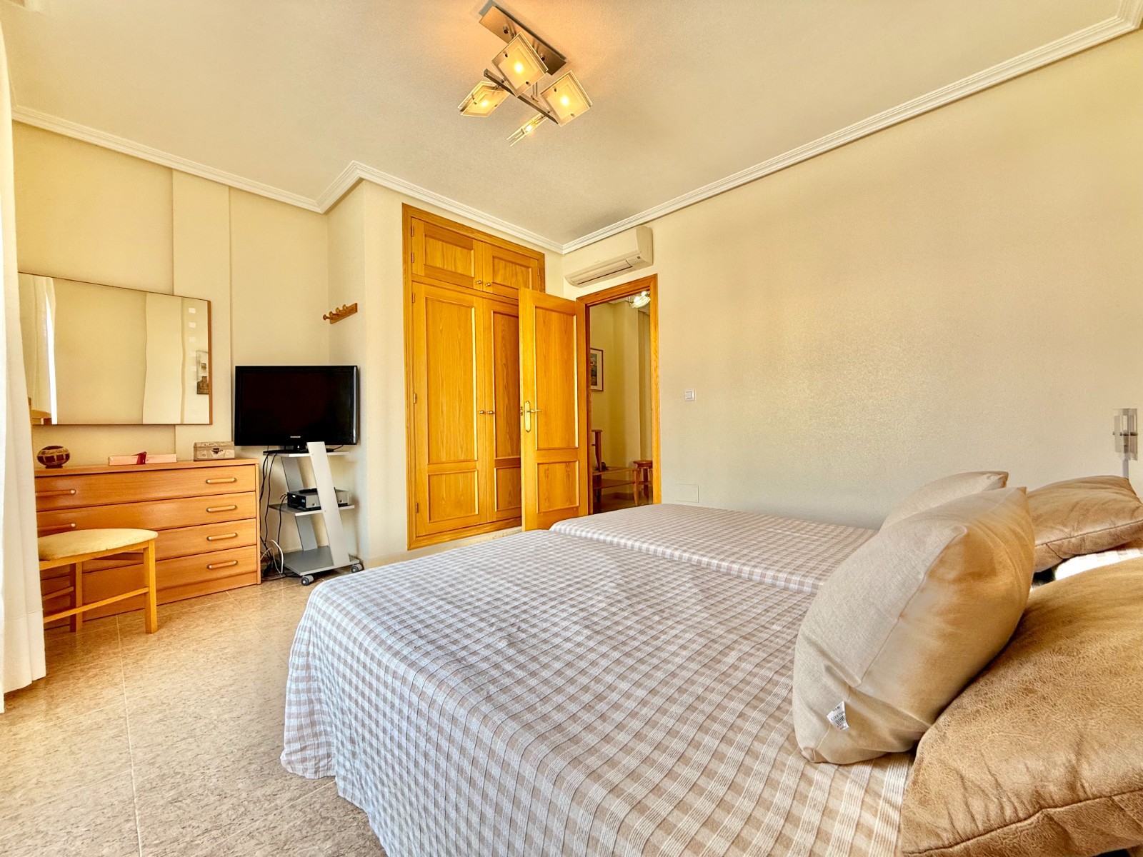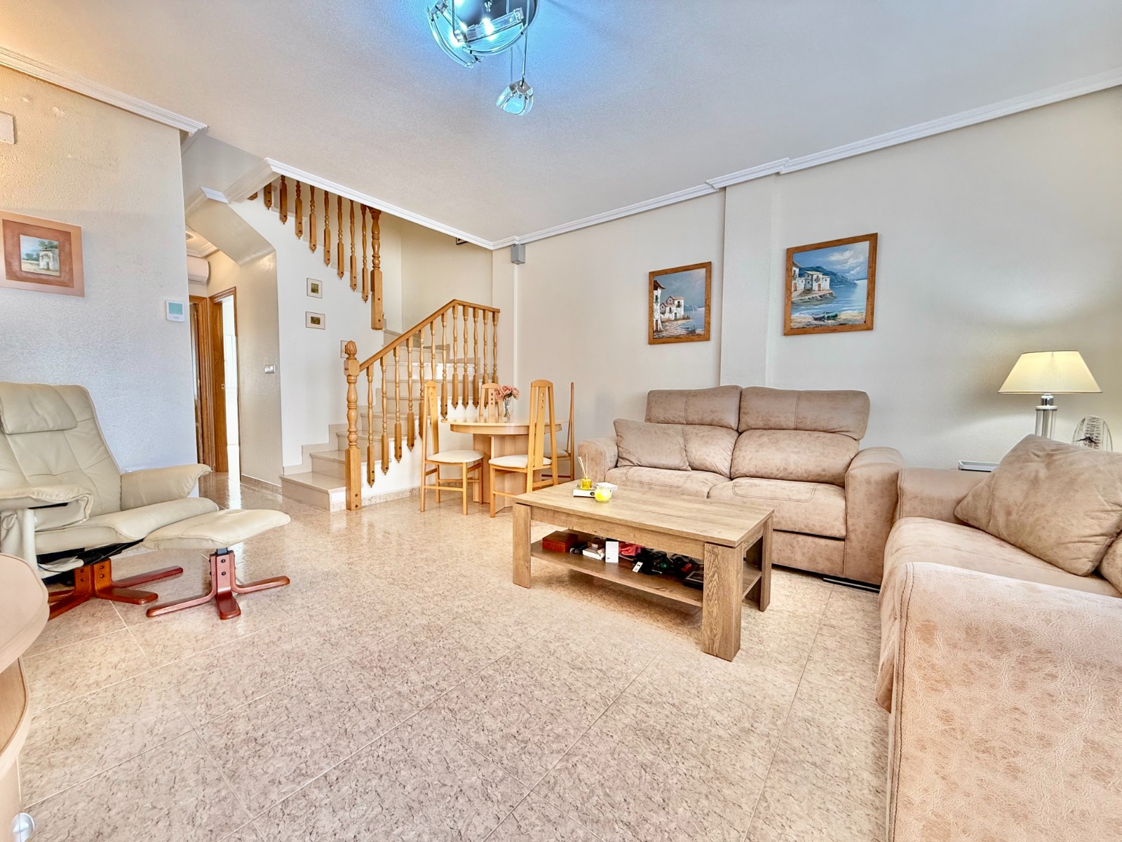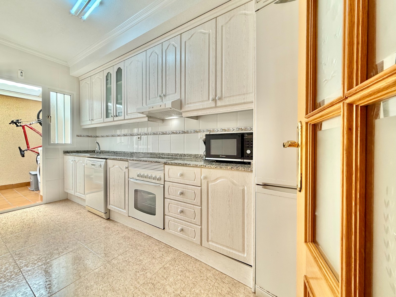 Cuenta con aire acondicionado, dos orientaciones y salón amplio. En planta baja encontramos habitación con armario empotrado y baño, además de cocina renovada con despensa y salida a patio-lavadero semiabierto con techo móvil corredero.