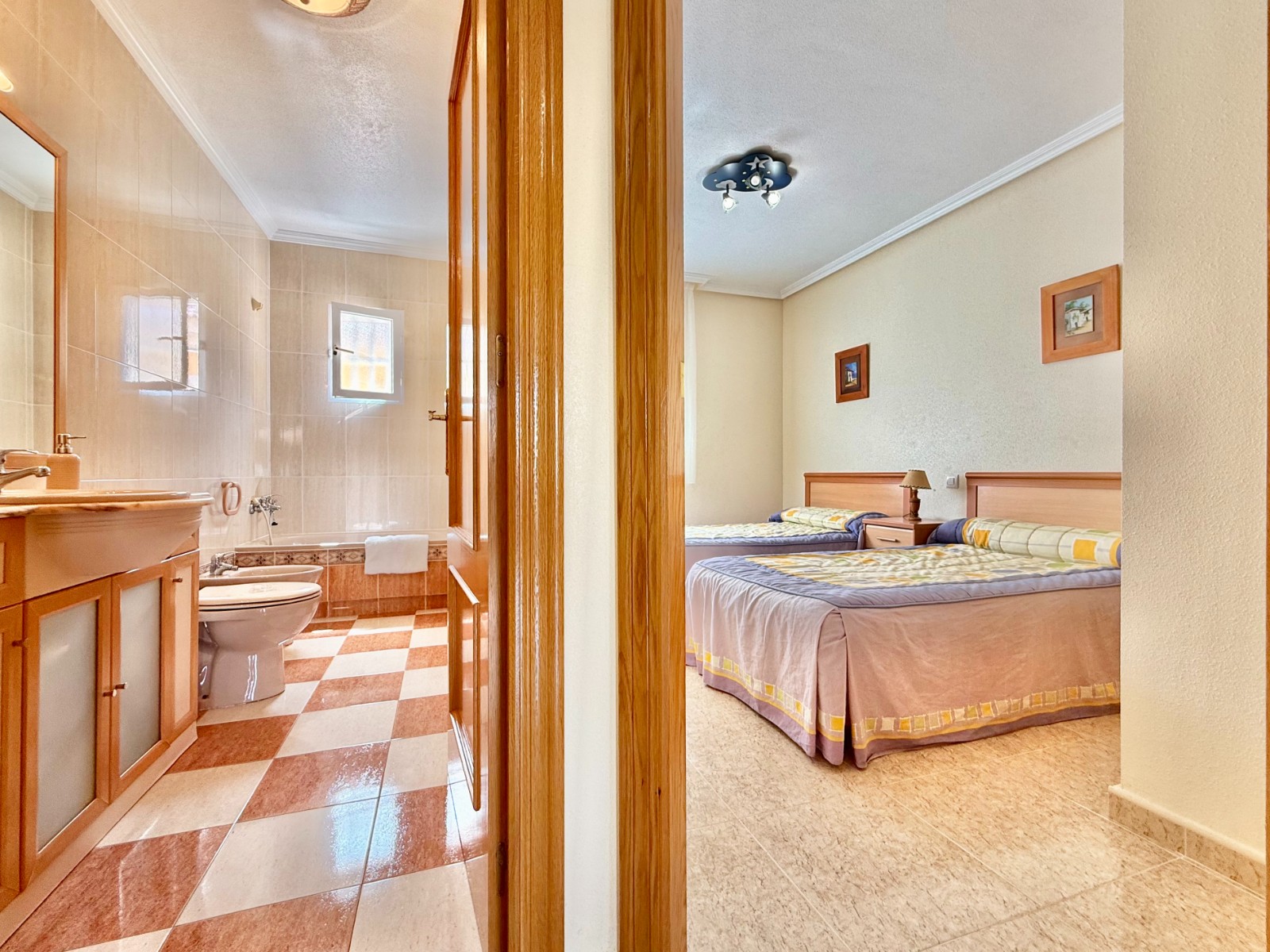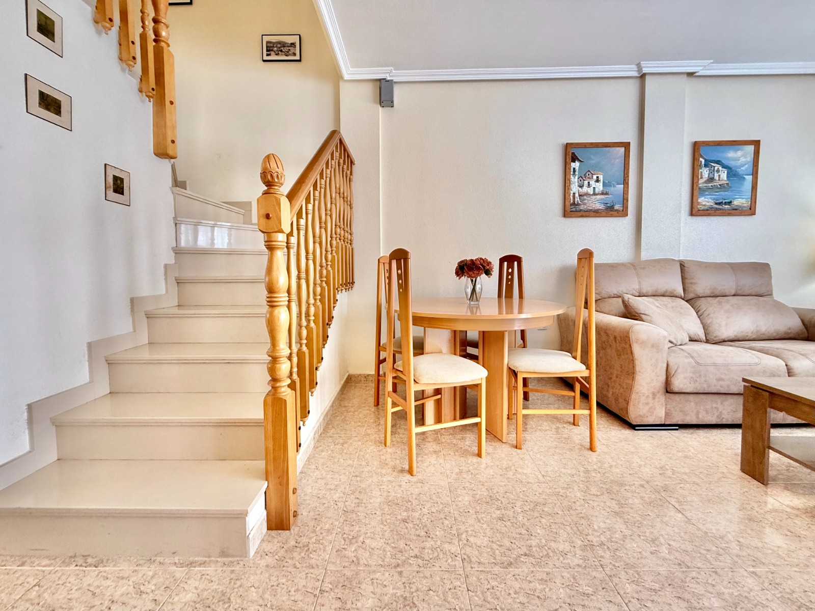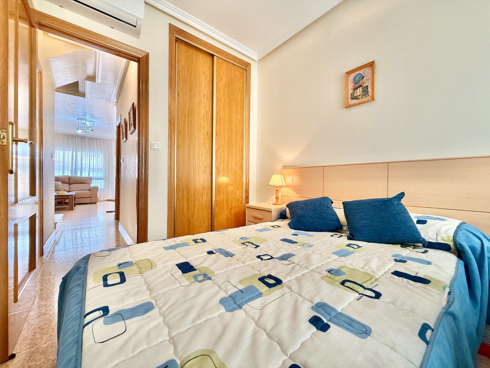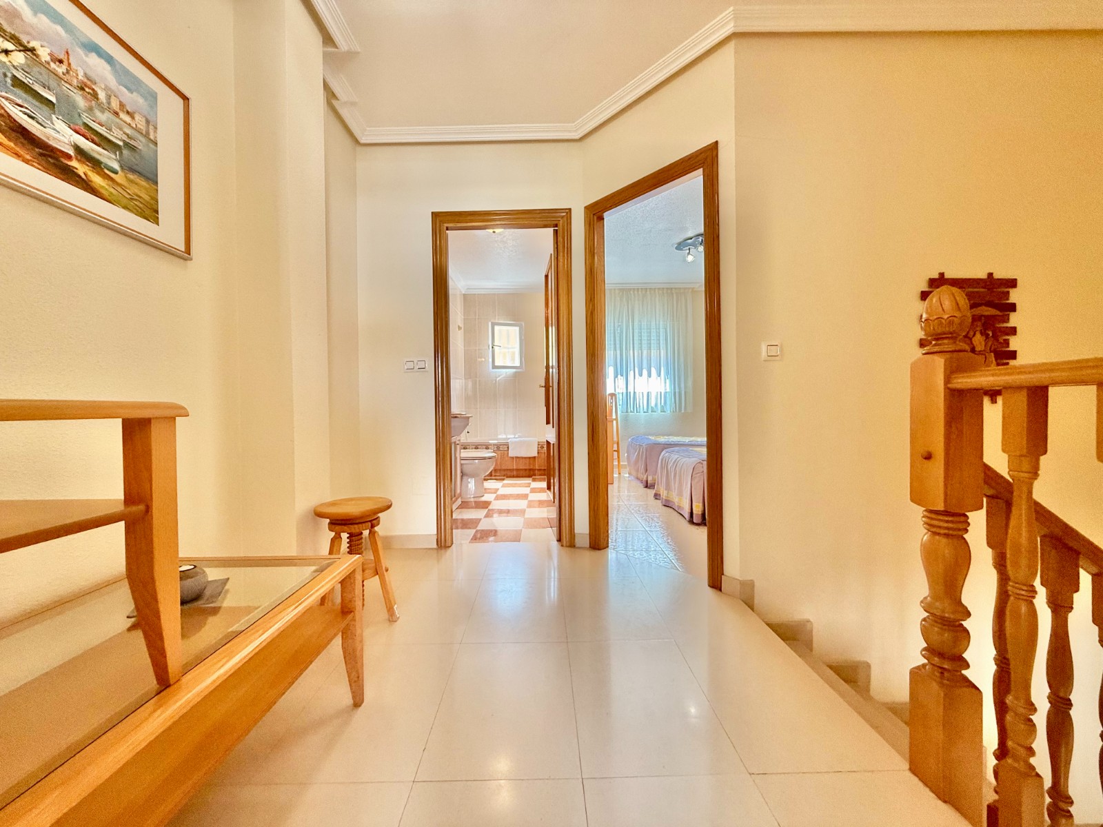 En la planta superior, un elegante recibidor distribuye dos dormitorios, ambos con armarios empotrados y acceso a terraza, y un baño completo.