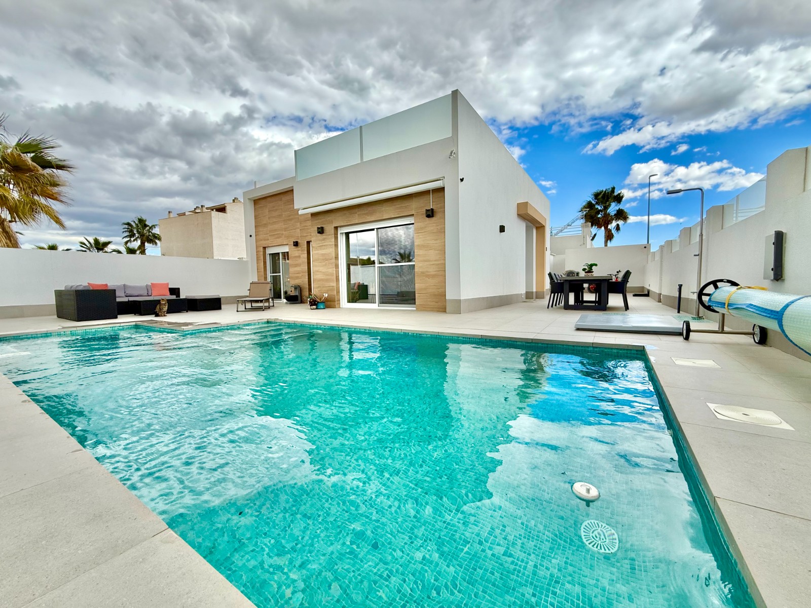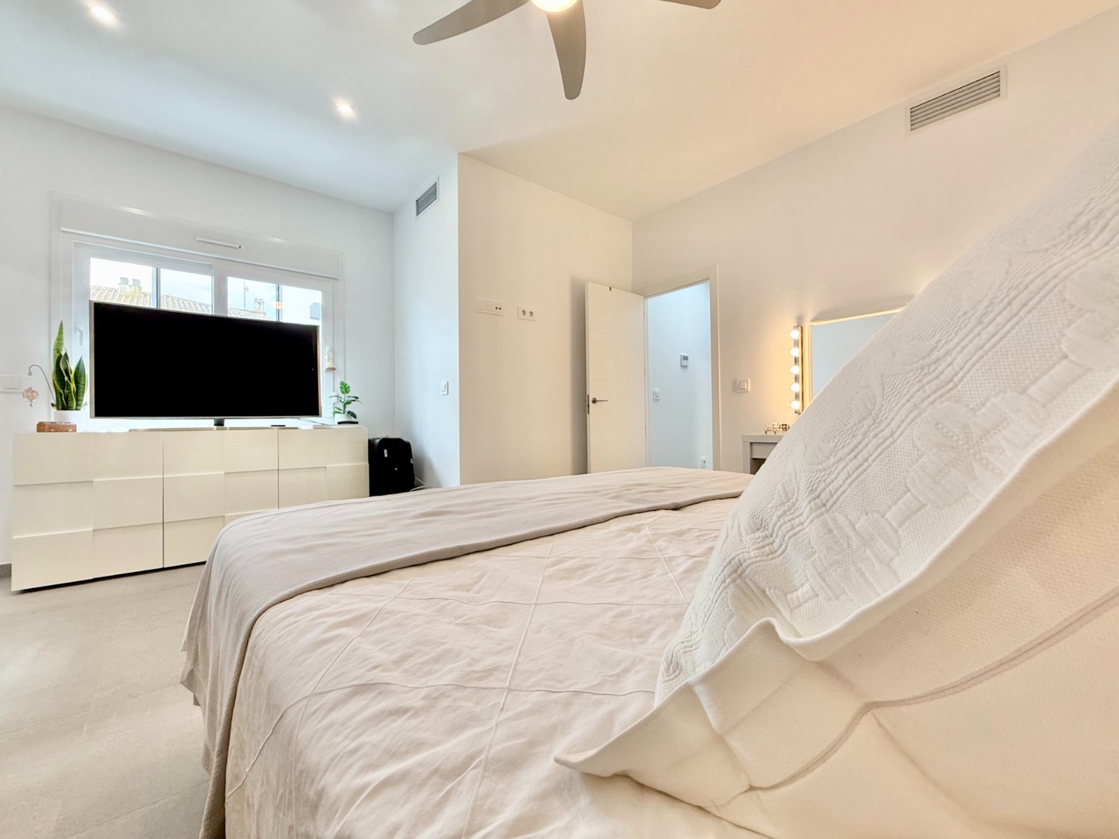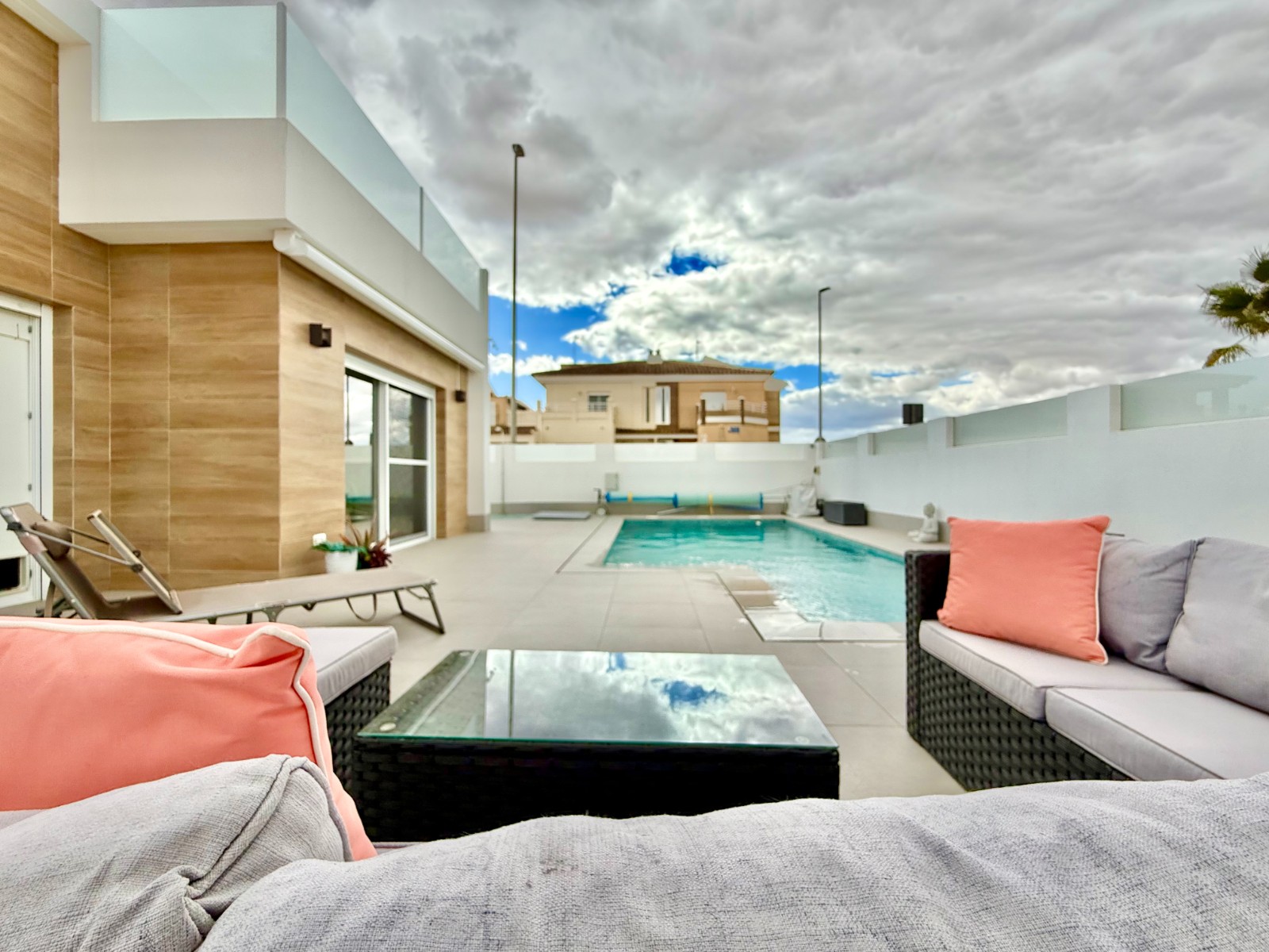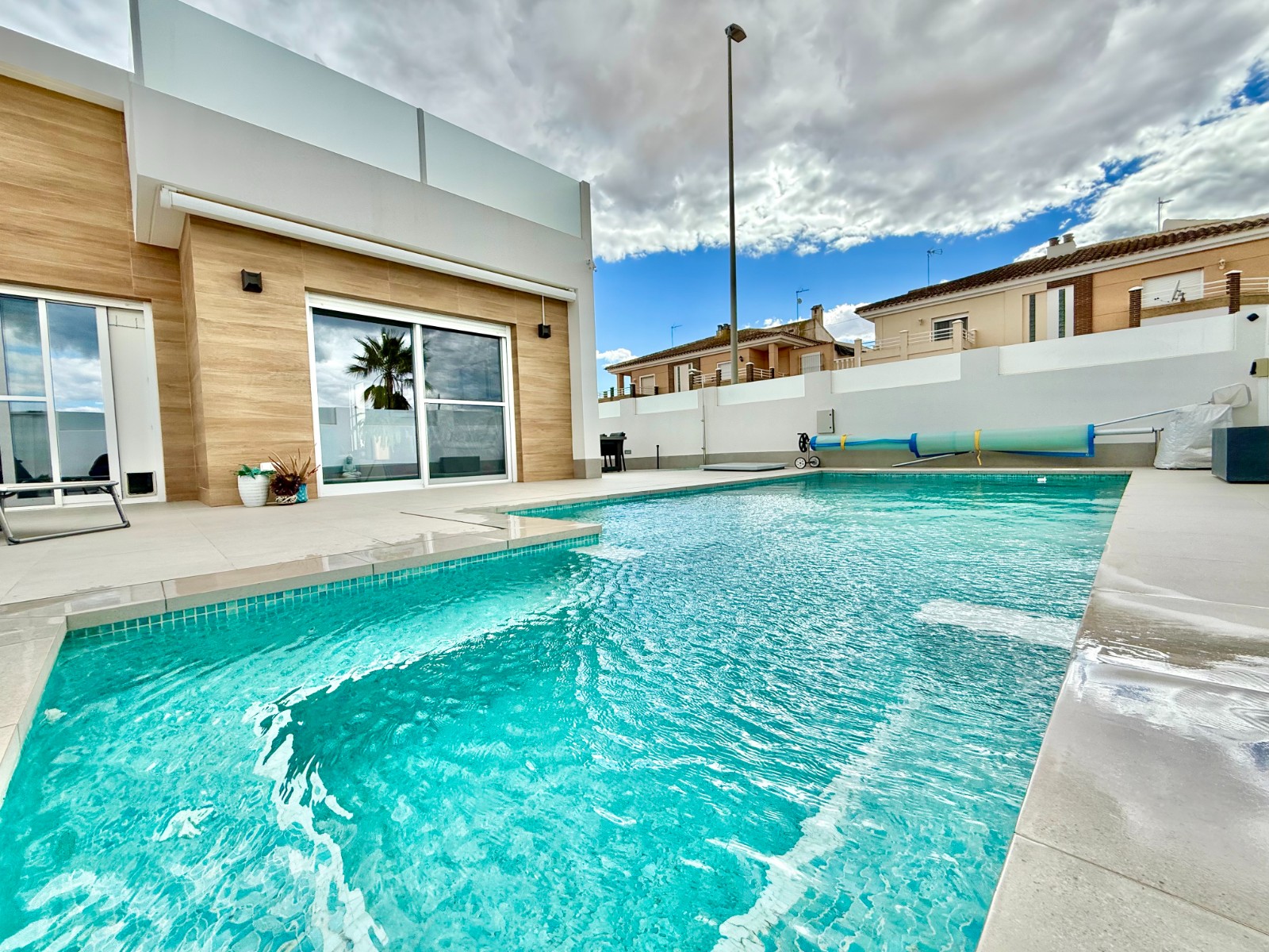 La vivienda es muy luminosa, amplia y ventilada, con 3 dormitorios dobles (uno de ellos con vestidor y baño en suite), baño con claraboya, amplio salón y cocina abierta espaciosa aunque lo mejor, además de la zona, es su terraza a pie de calle en forma de U con piscina y patio, su solarium y su entorno y vecinos.