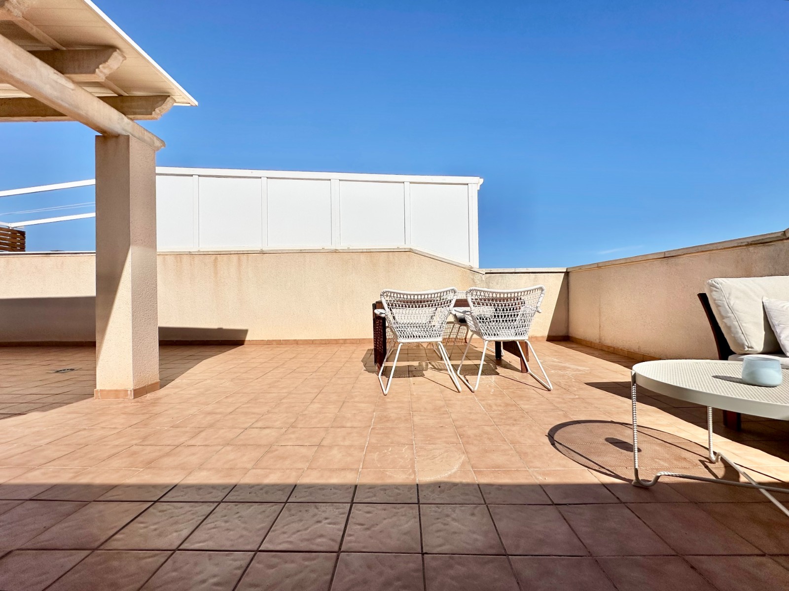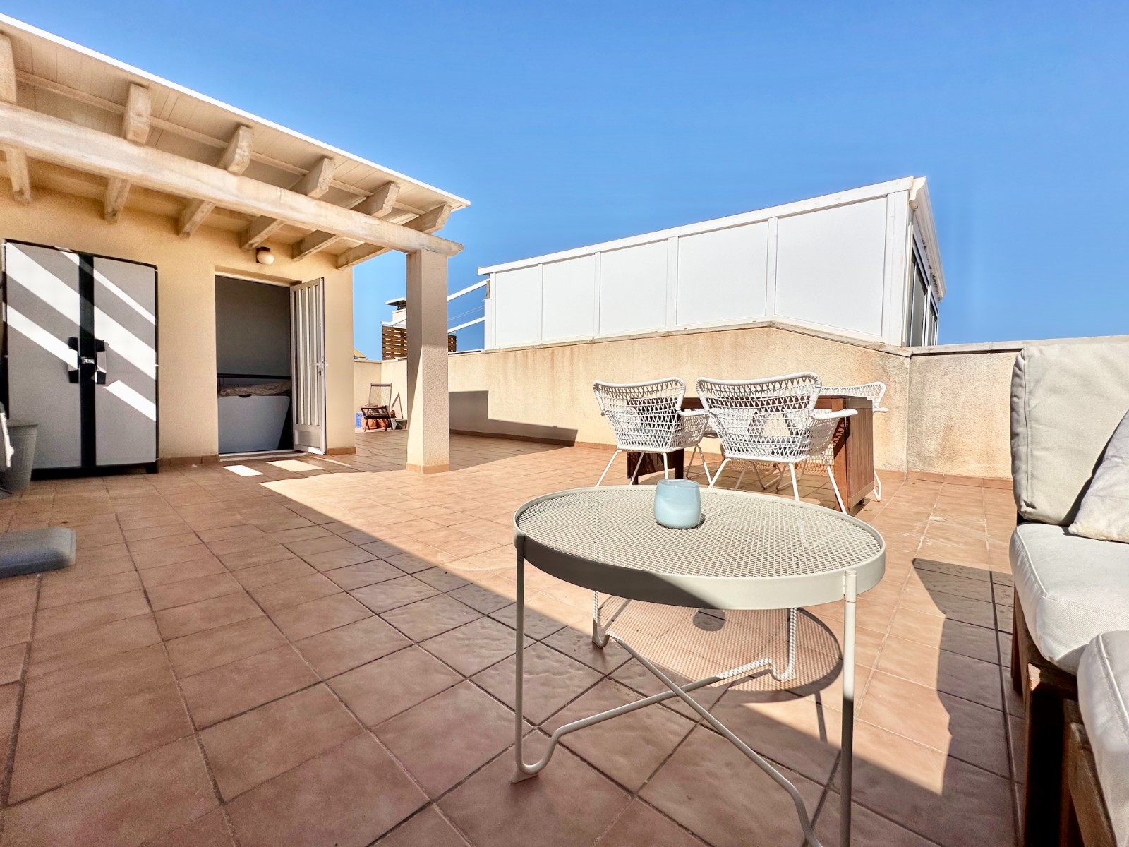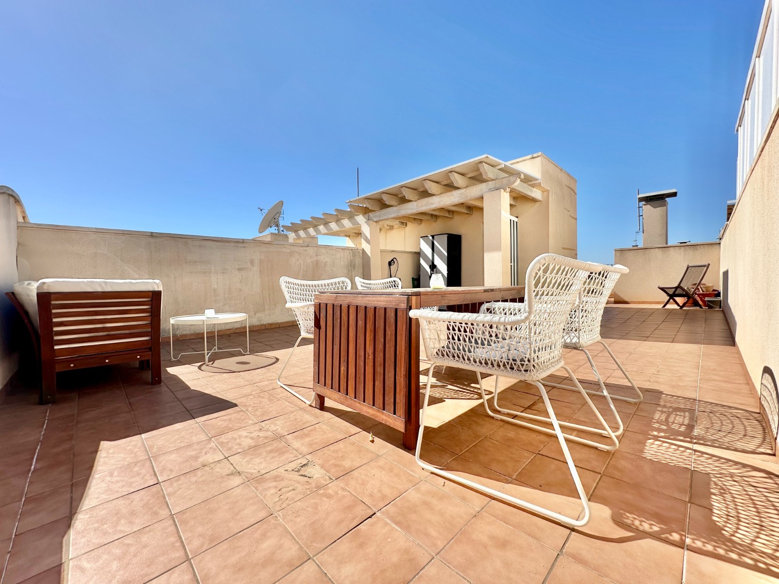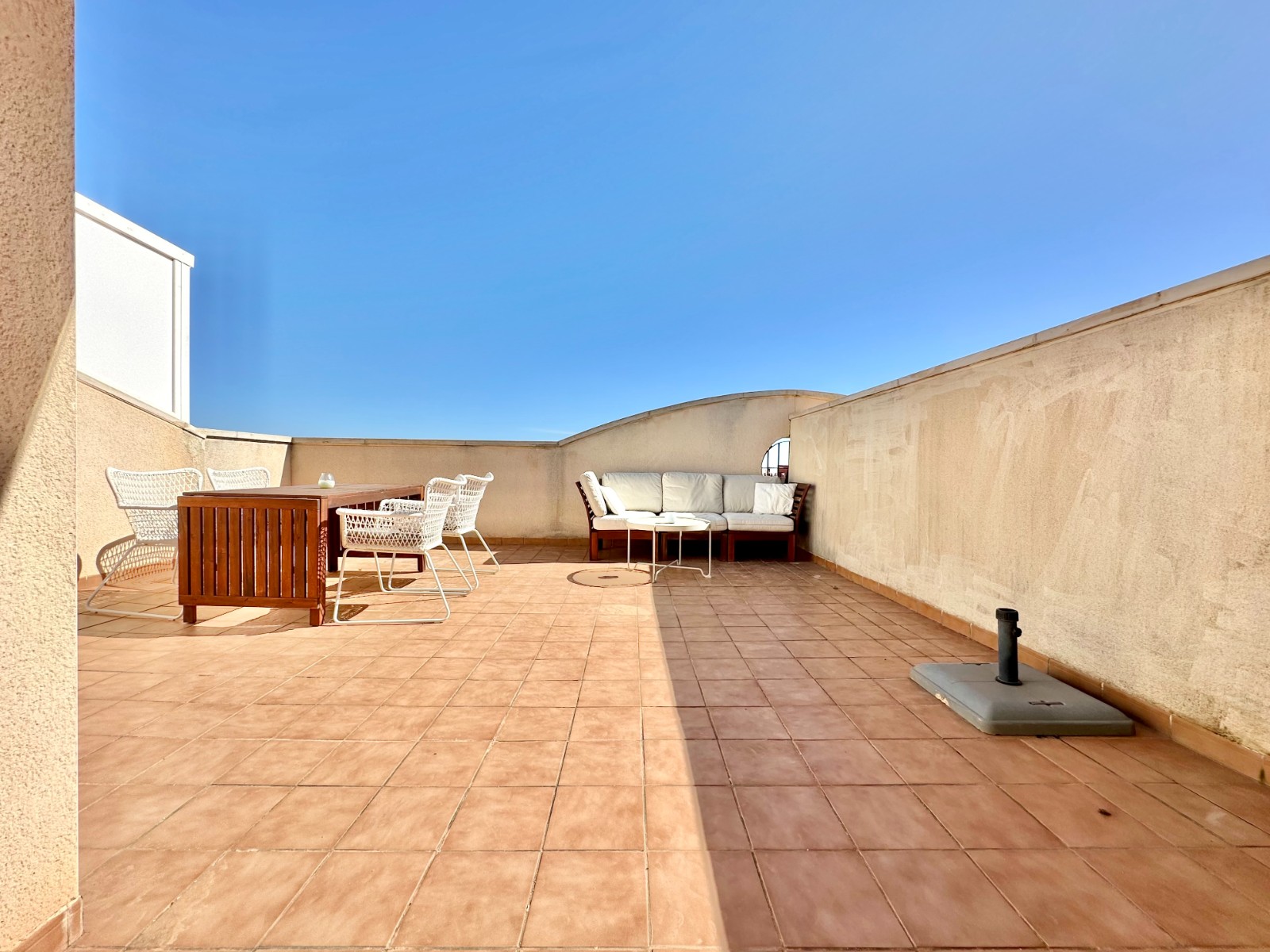Piso ático con terraza solarium y vistas despejadas por ambos lados. De 2 habitaciones, cocina abierta al salón equipada con lavadero, salón comedor con subida a la terraza solarium muy grande y soleada donde si quieres, puedes hacer un cerramiento. 1 baño reformado completa la vivienda (además del garaje, la piscina y el trastero).