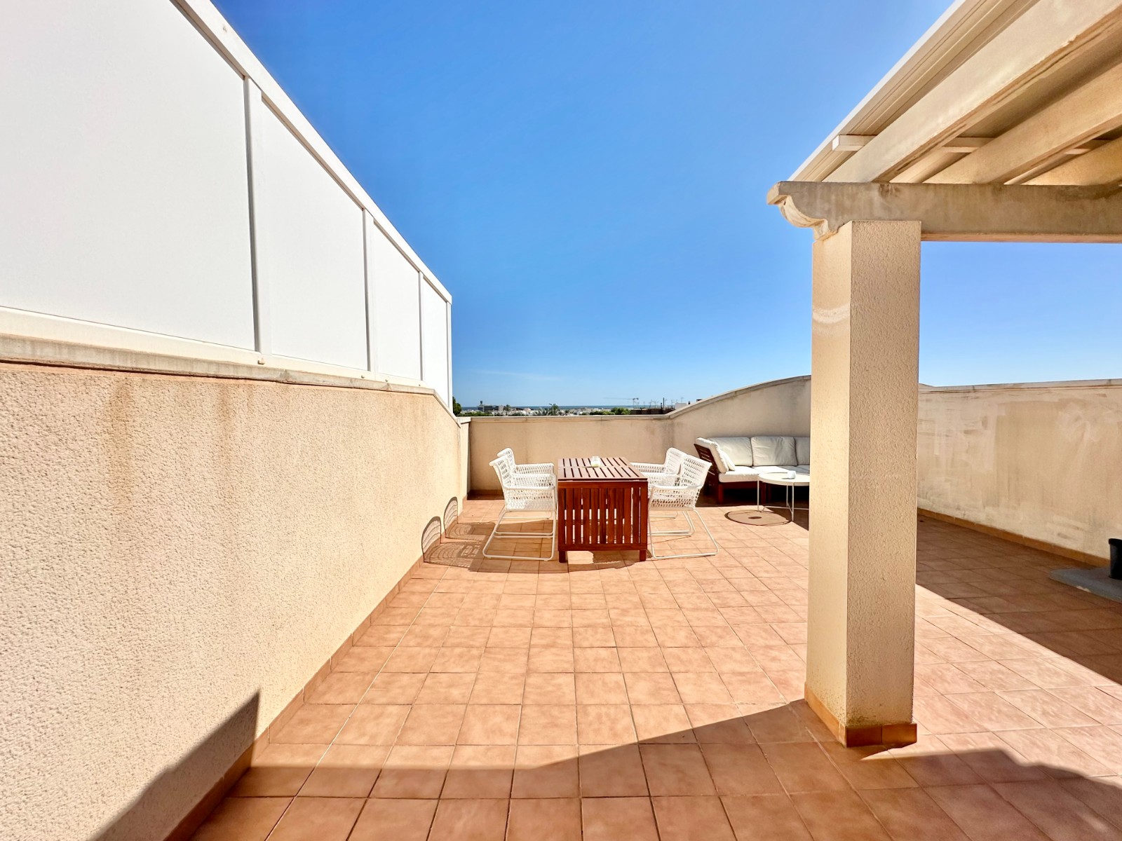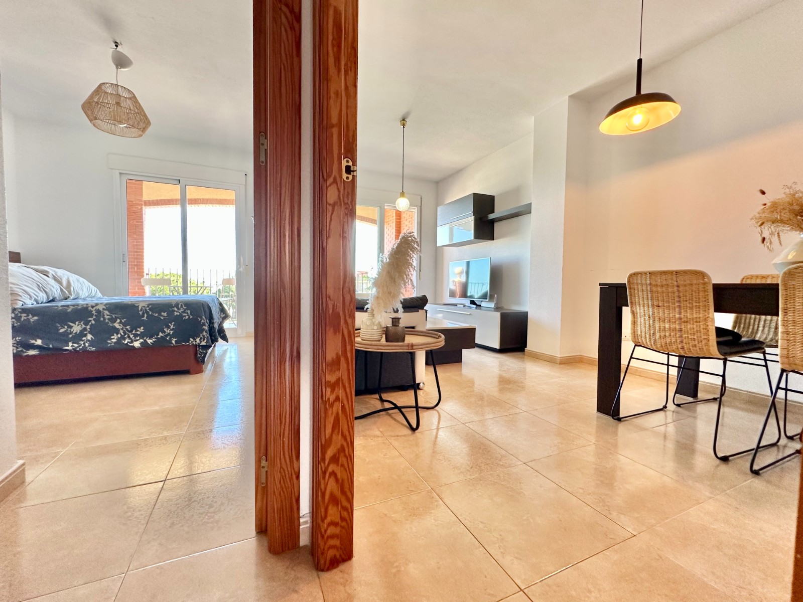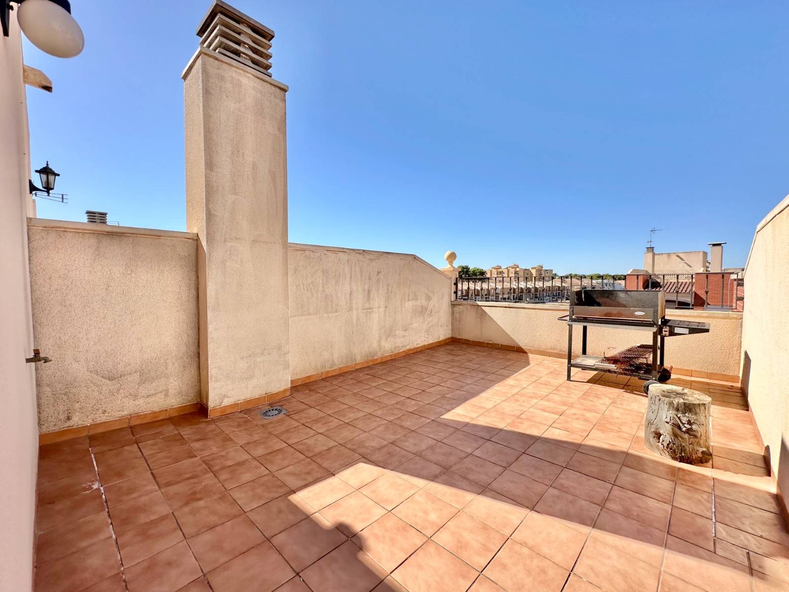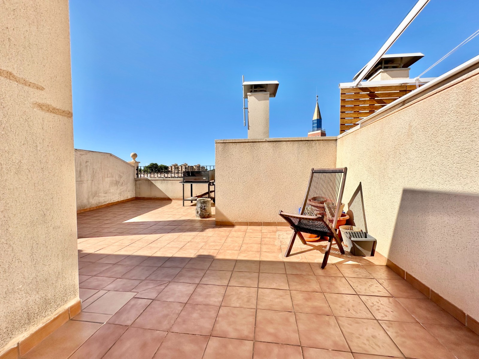 Piso ático con terraza solarium y vistas despejadas por ambos lados. De 2 habitaciones, cocina abierta al salón equipada con lavadero, salón comedor con subida a la terraza solarium muy grande y soleada donde si quieres, puedes hacer un cerramiento. 1 baño reformado completa la vivienda (además del garaje, la piscina y el trastero).